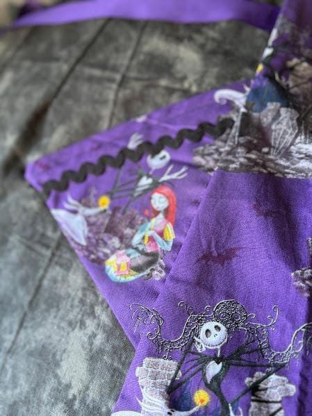 Retro 1950s style handmade apron. Made from vintage 1950s pattern with love. Nightmare Before Christmas theme. Made with 100%cotton material and grosgrain ribbon. Ribbon with apron approximately 86 inches to fit variety of sizes.