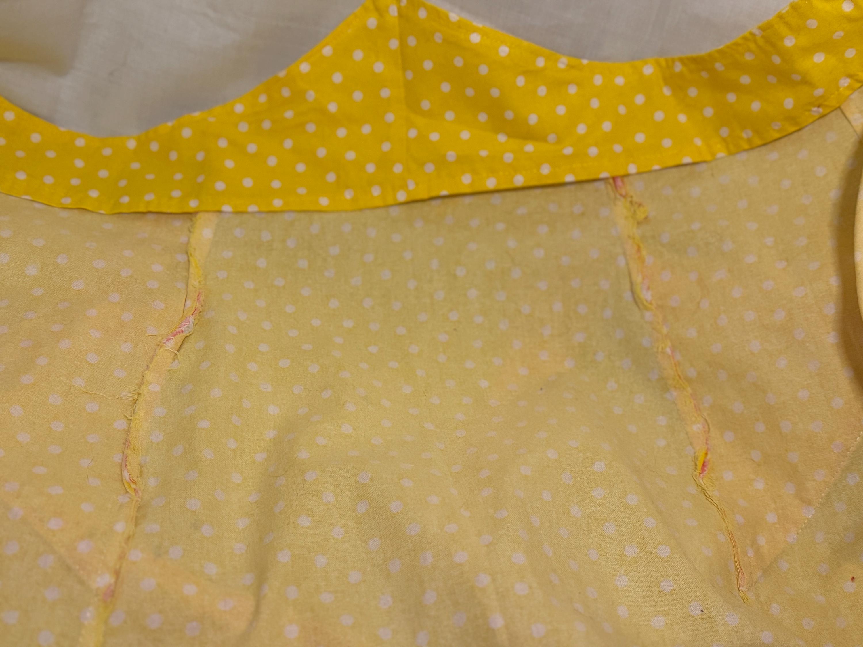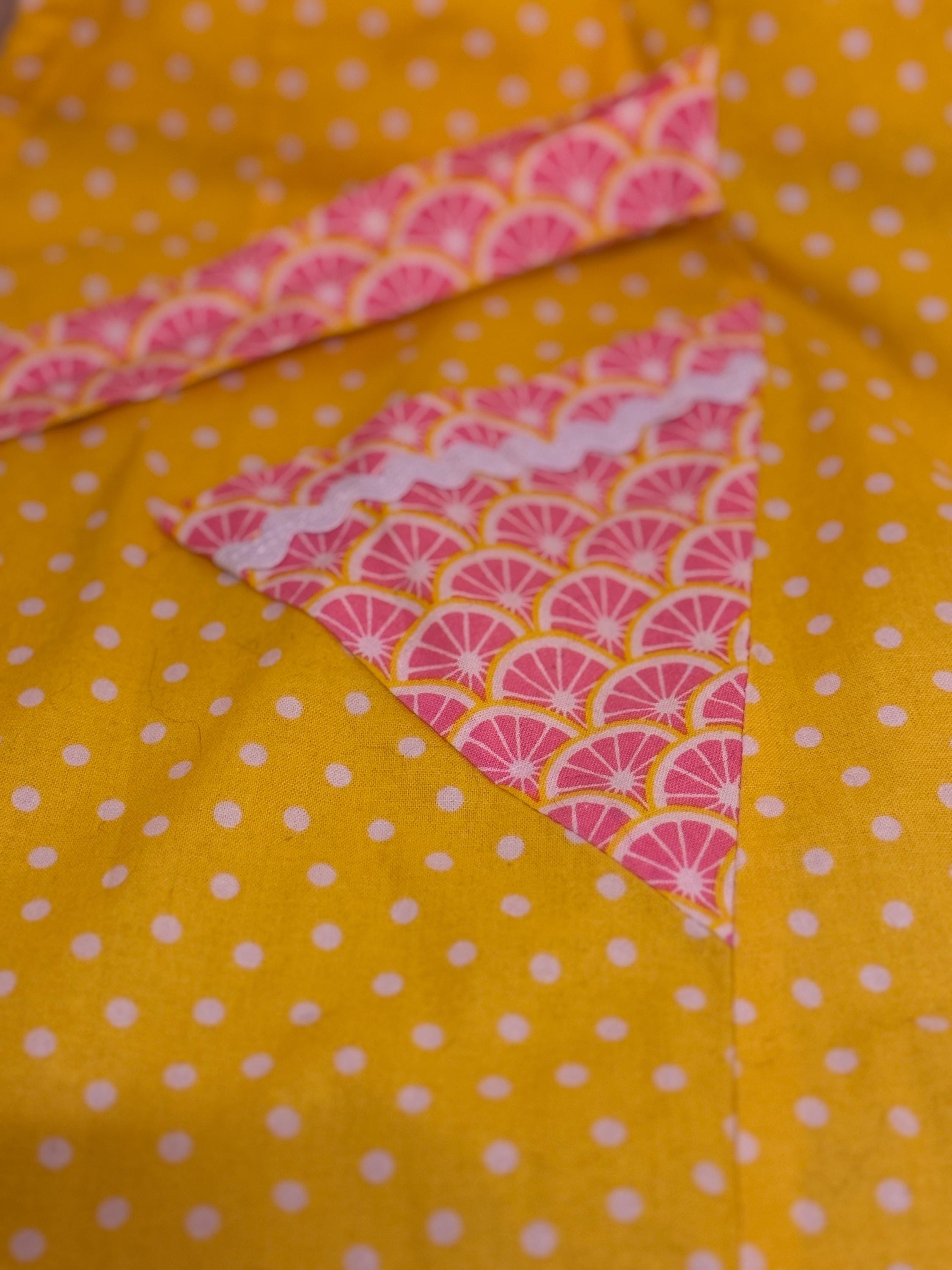 Made from vintage 1950s pattern that belonged to my great aunts. Crafted with 100% cotton material and gross grain ribbon. Styled with pink grapefruits in yellow and white. Has been washed previously. Made in 2018. Made with love.