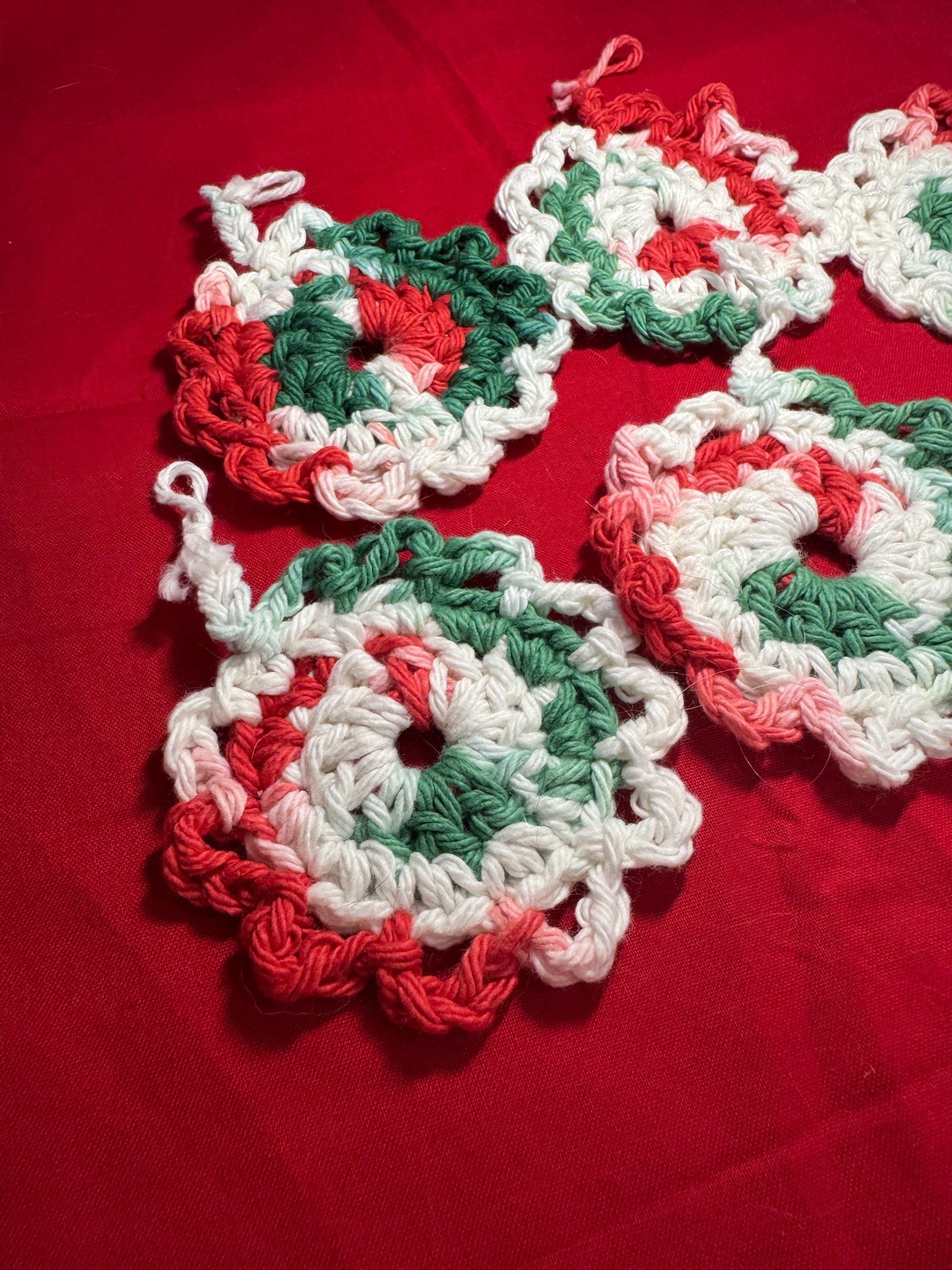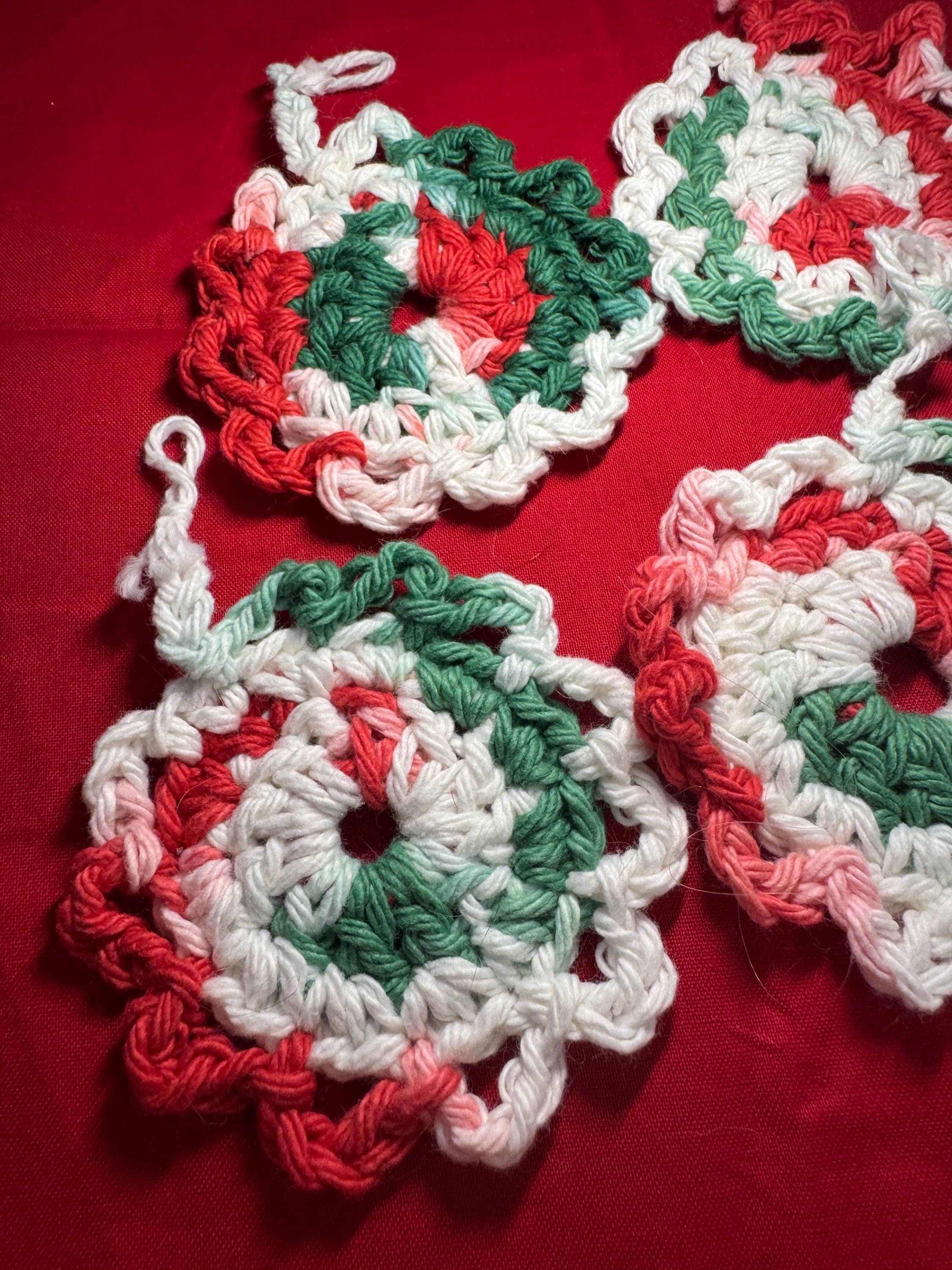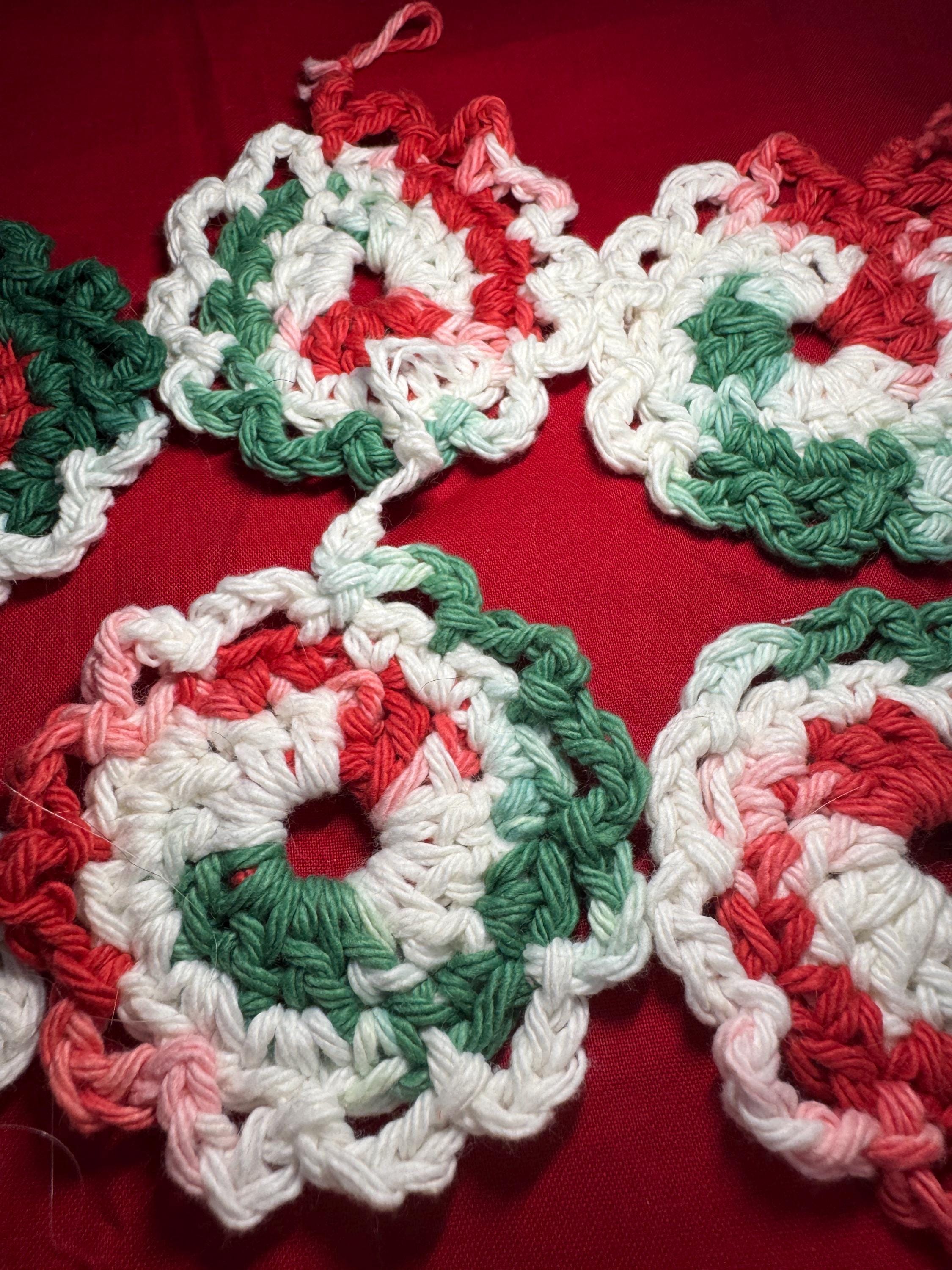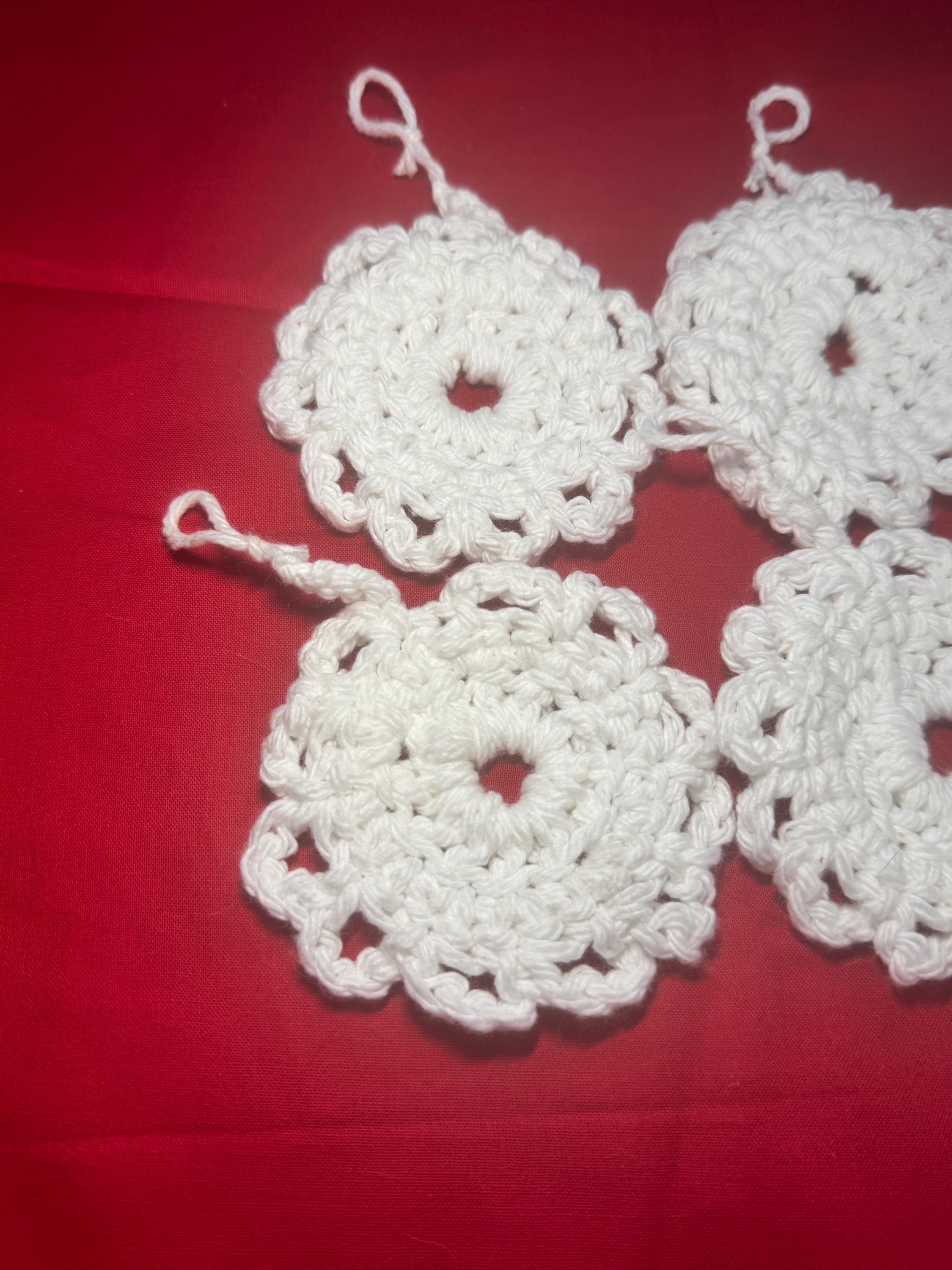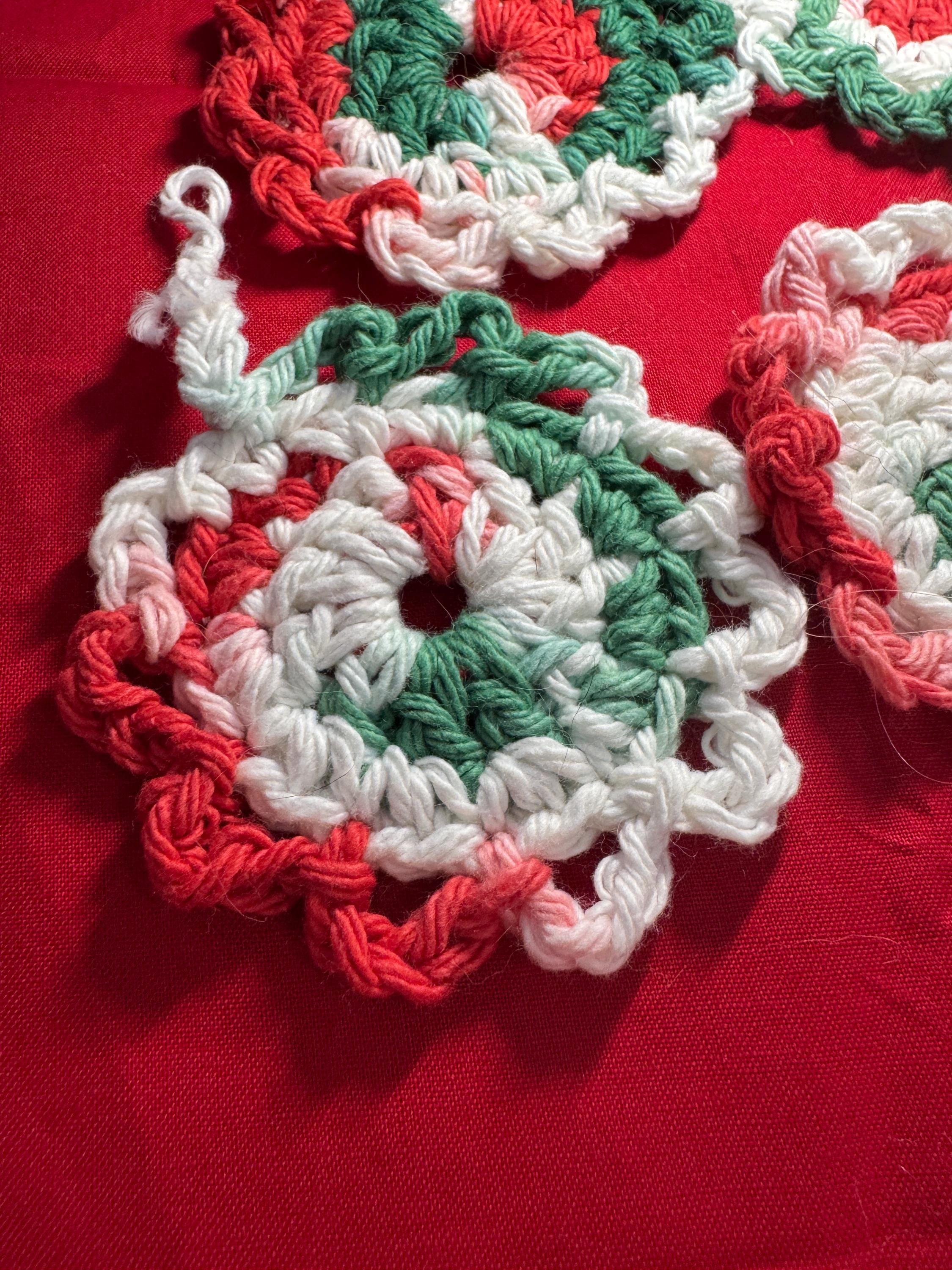 6 handmade crocheted ornaments. Two varuations. One is multi-colored with red, green and white. The second variation is all white. Approximately 3 inches wide sizes vary slightly.