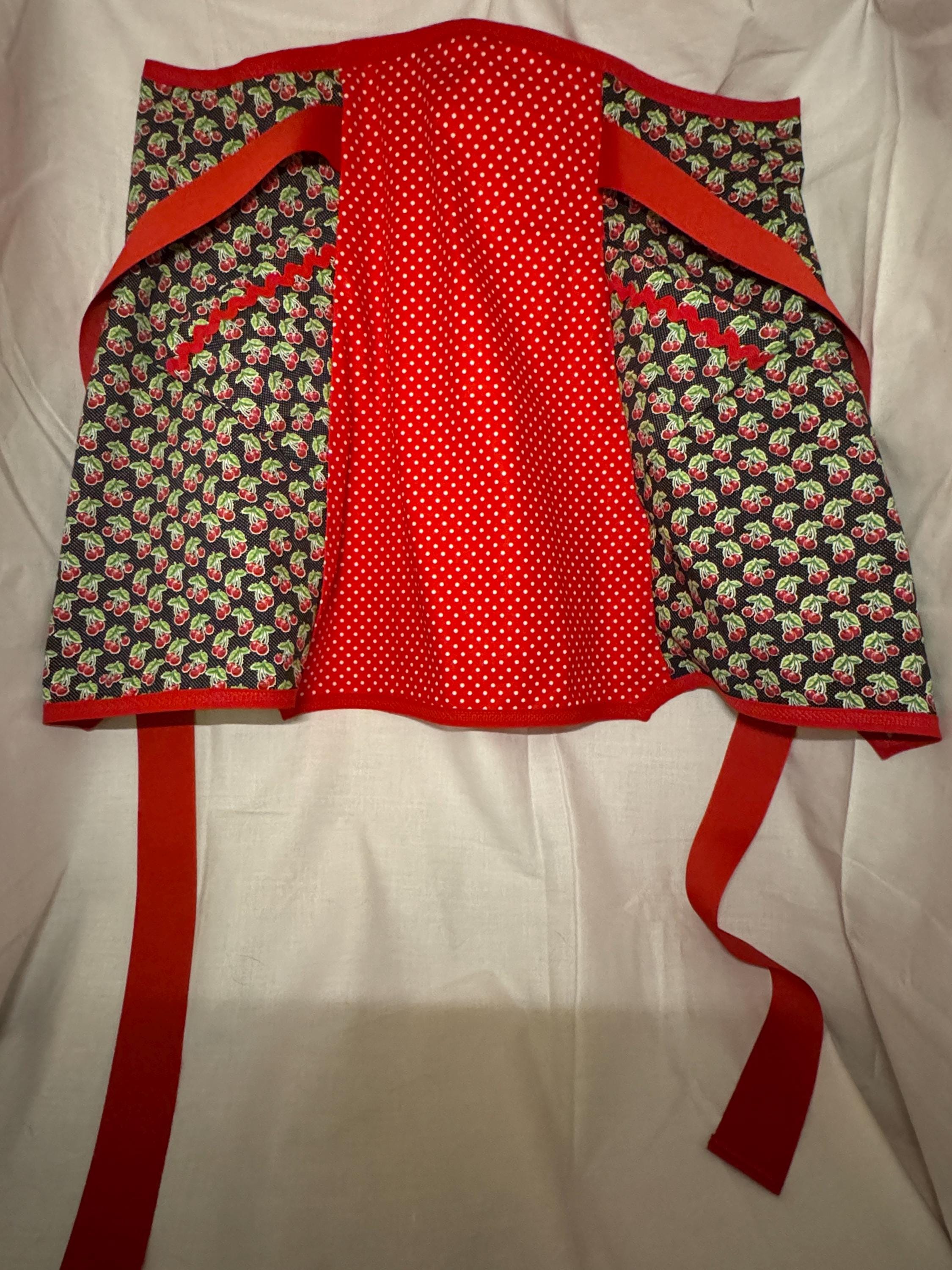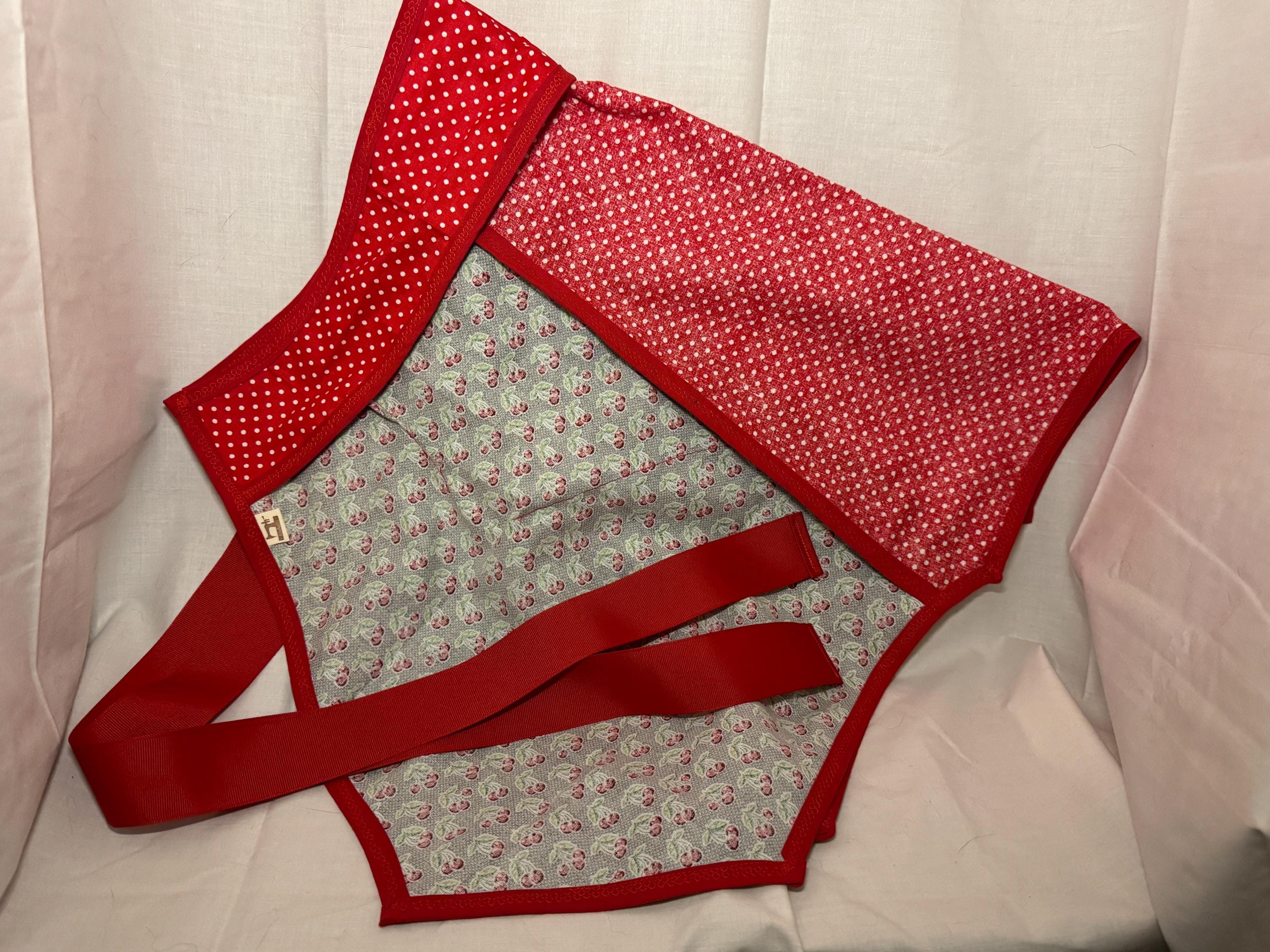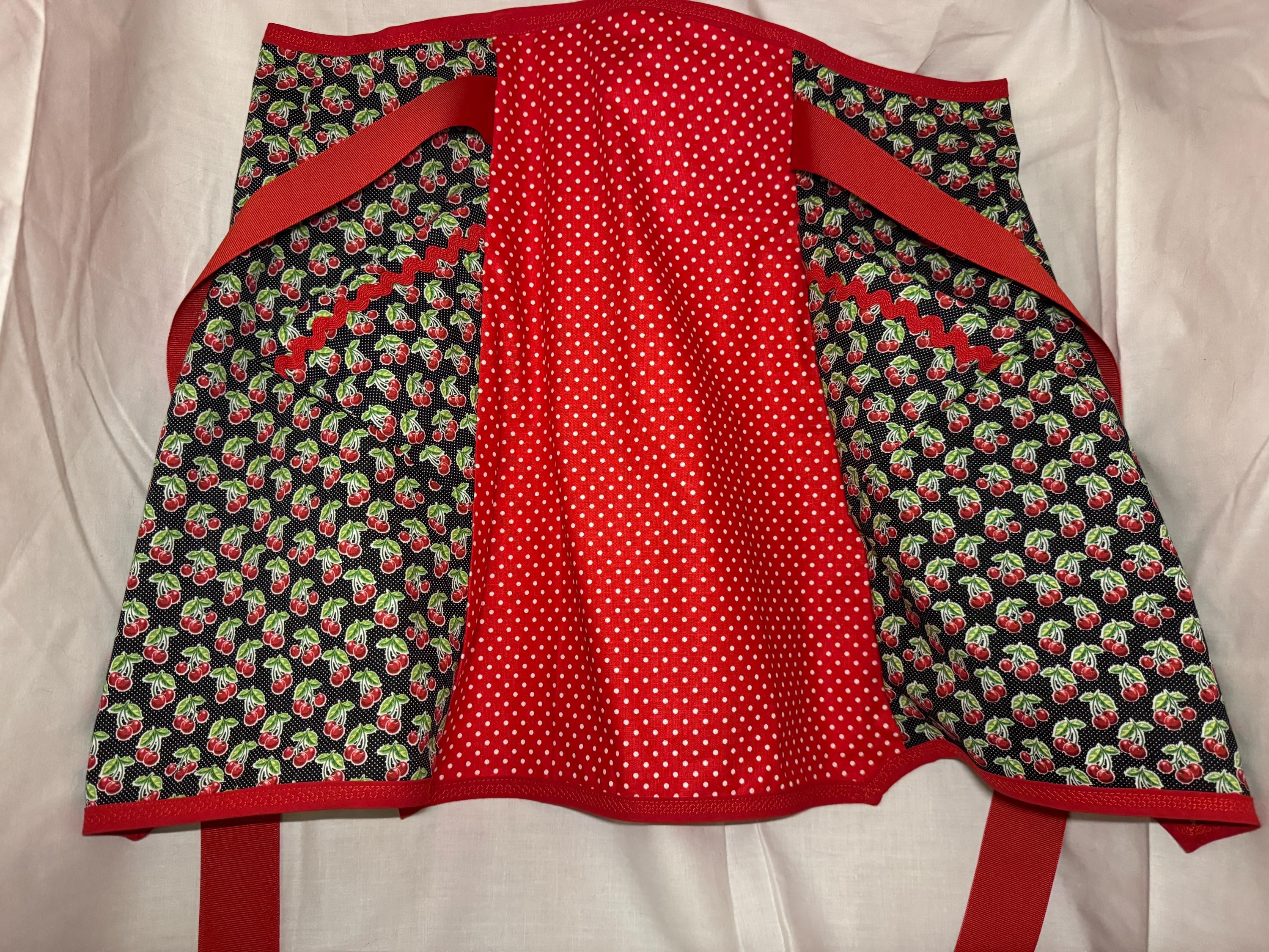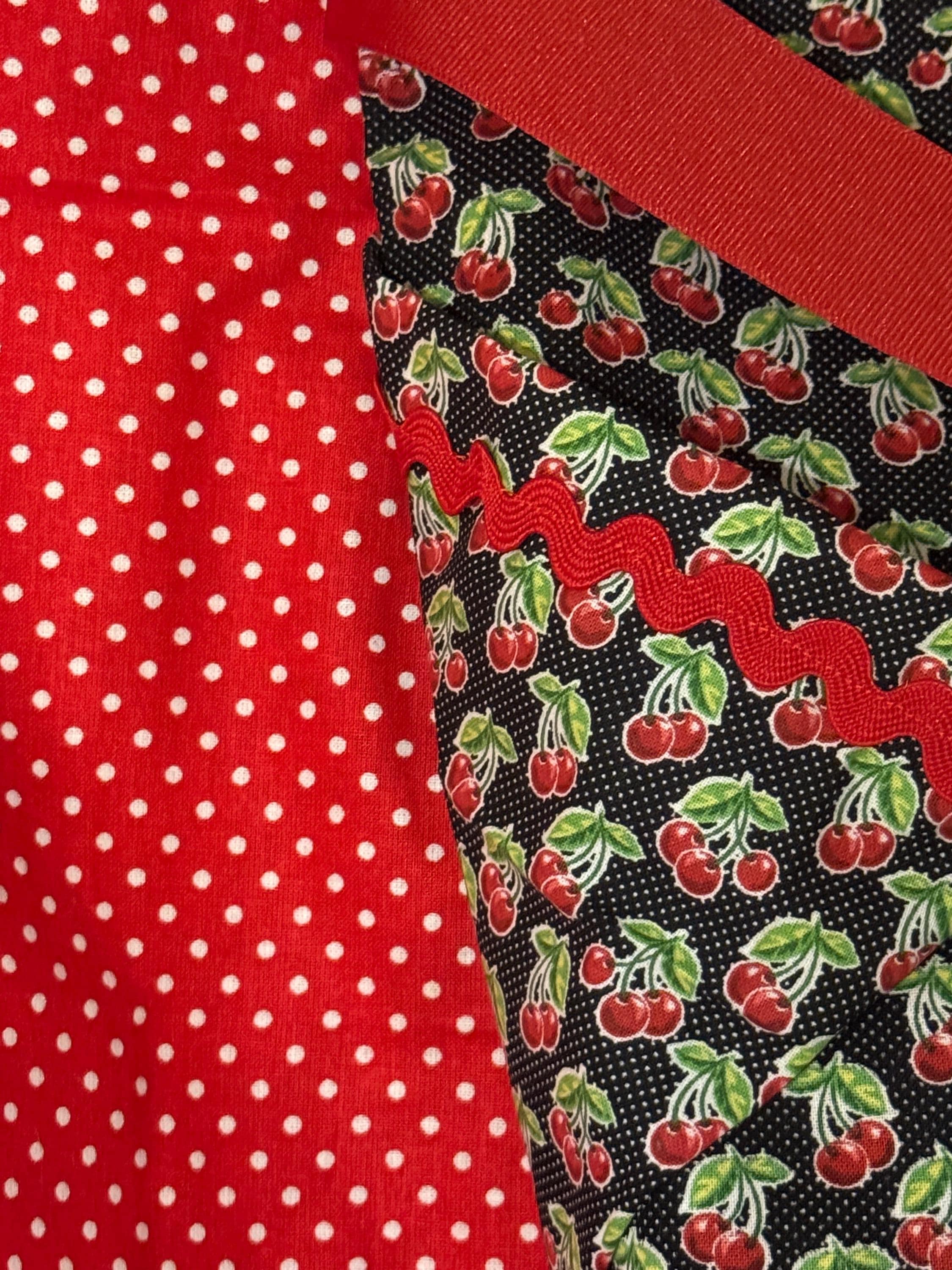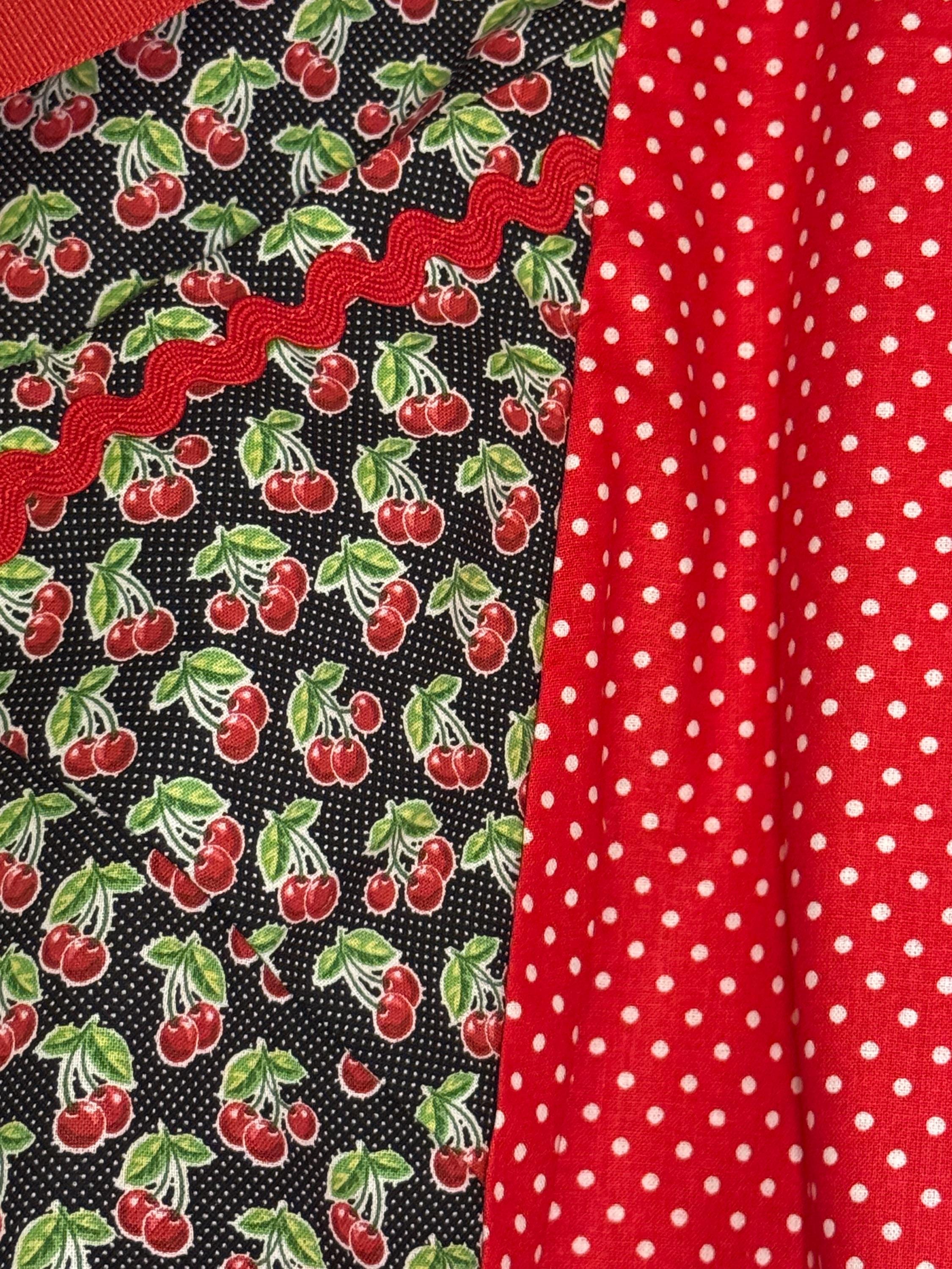 Handmade from a vintage 1950s pattern, it is made from 100% cotton and grosgrain ribbon. It is designed with cherries theme and red polka dot pattern. Made with love.