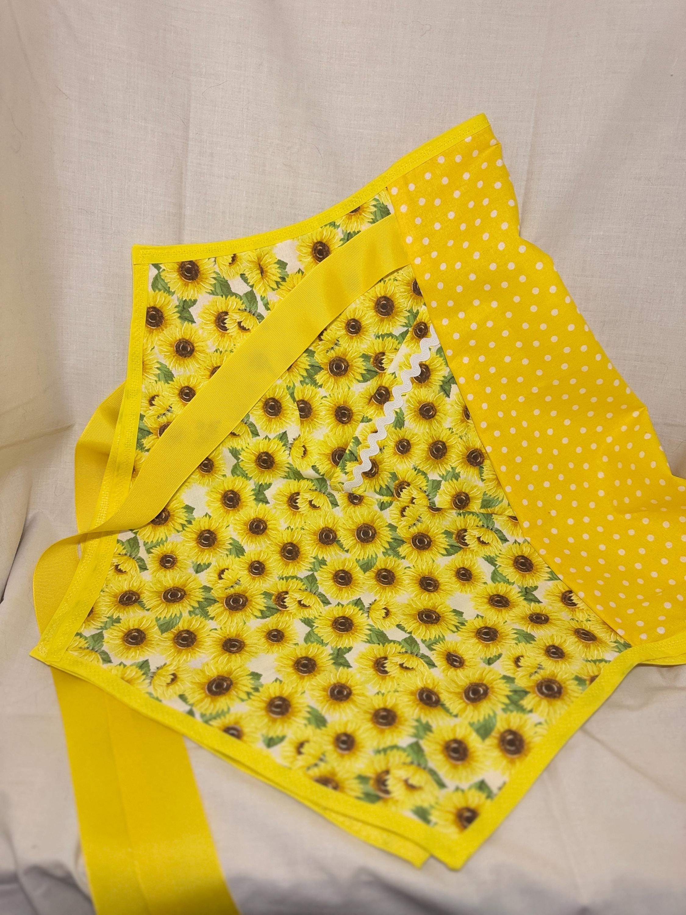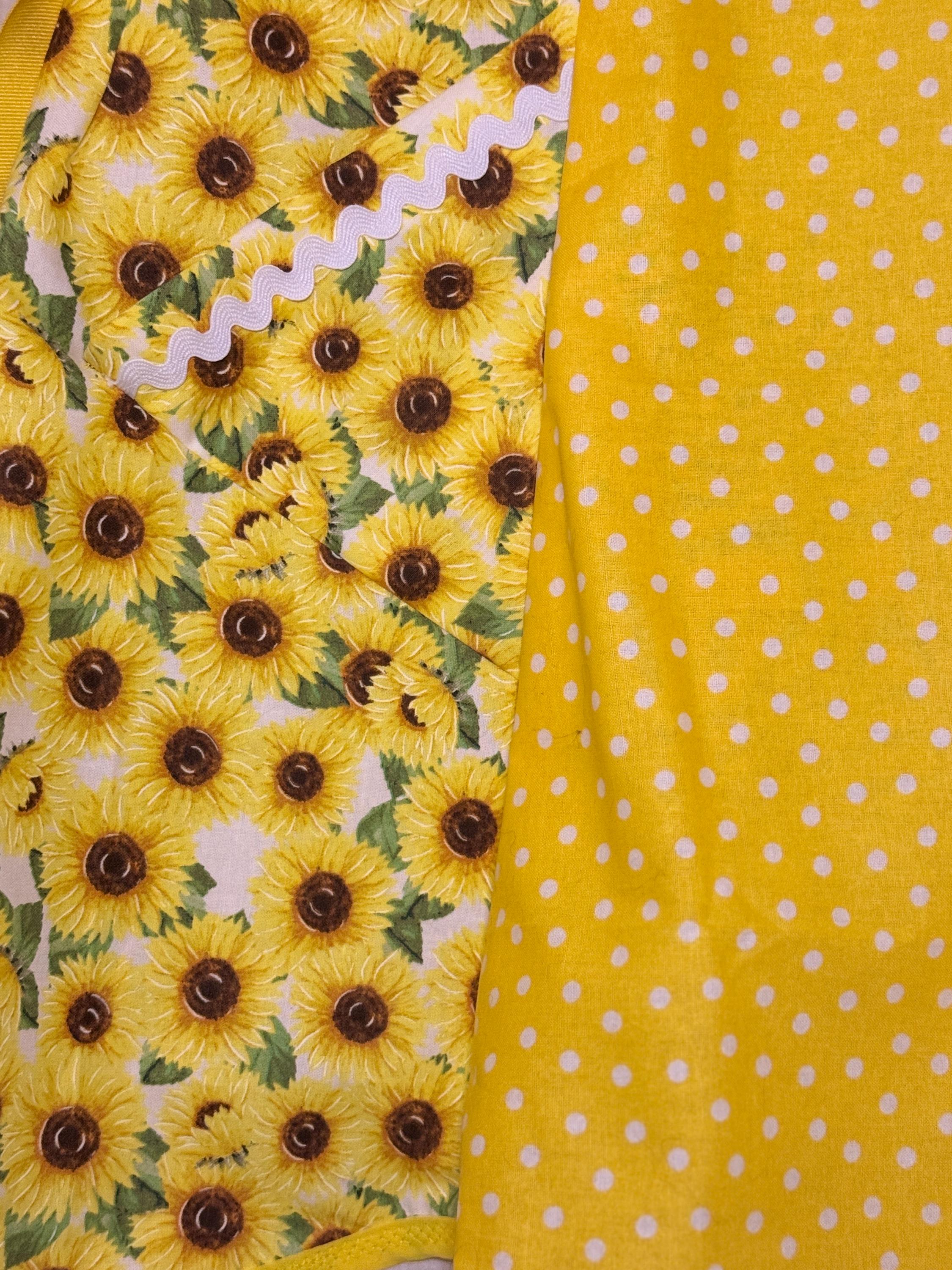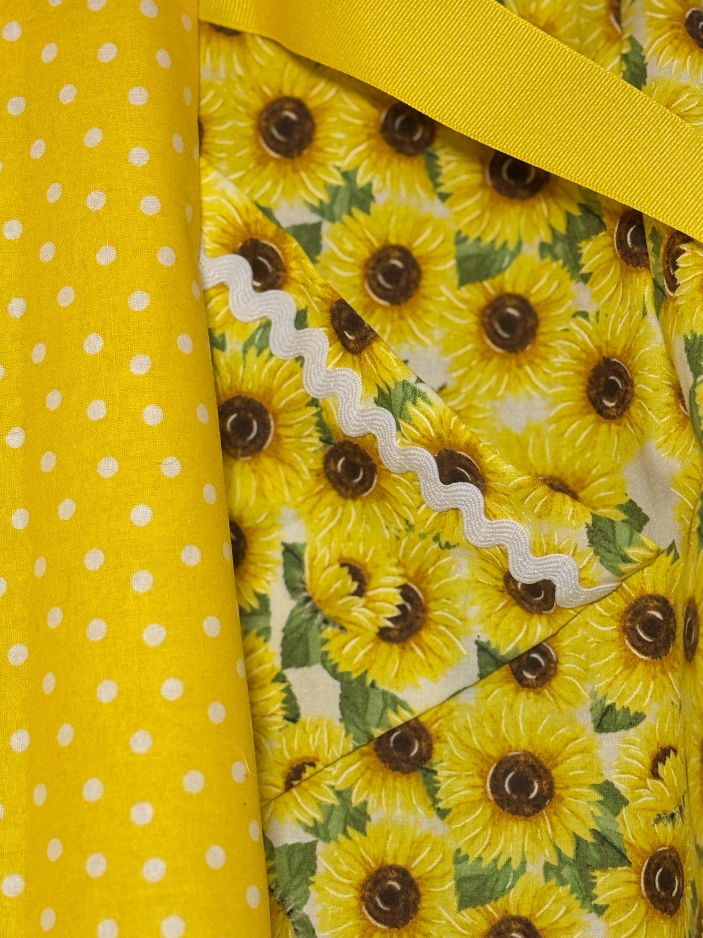 Handmade from a vintage 1950s pattern, it is made from 100% cotton and grosgrain ribbon. It is designed with sunflowers theme and yellow and white polka dot pattern. Made with love.