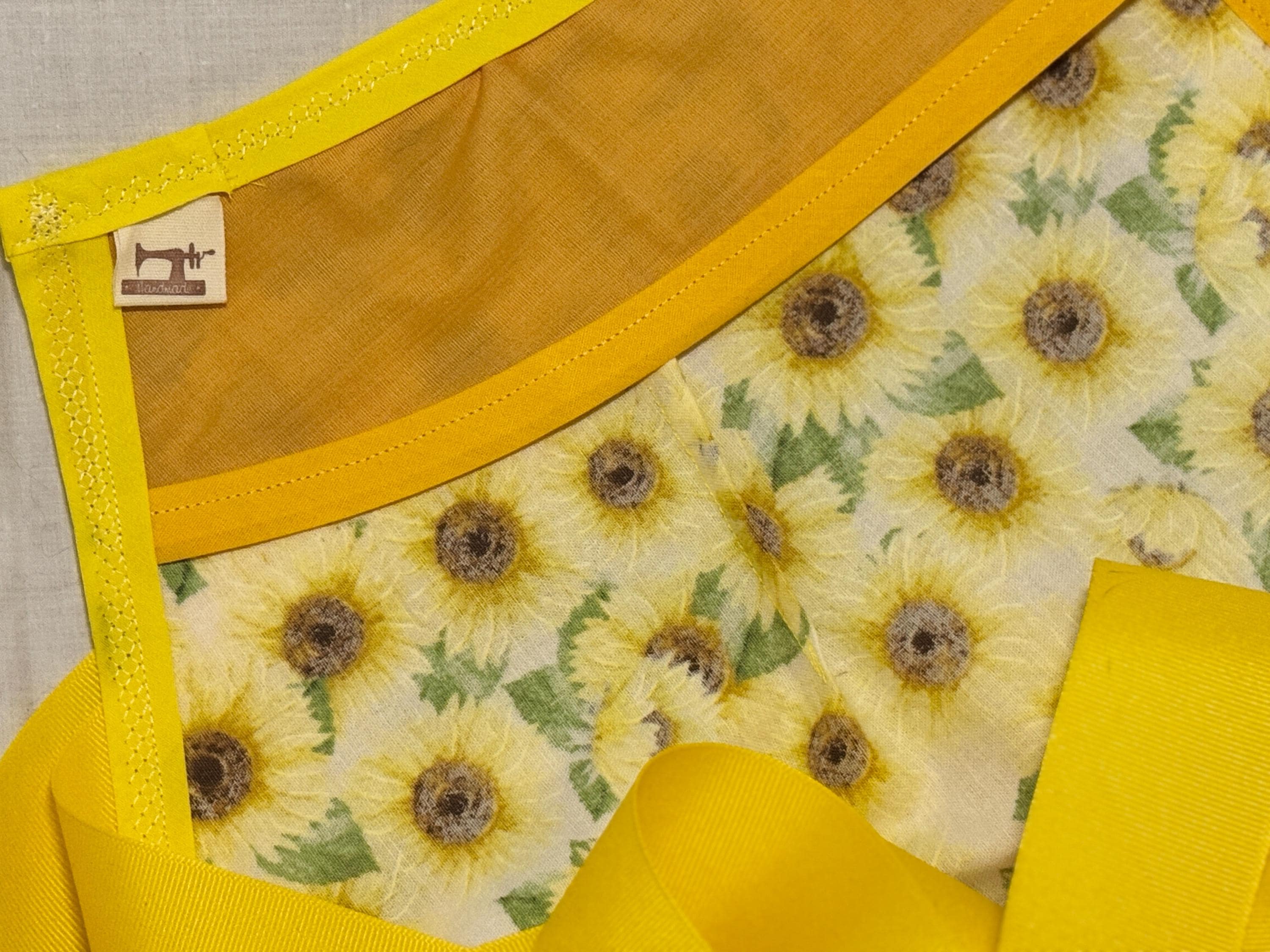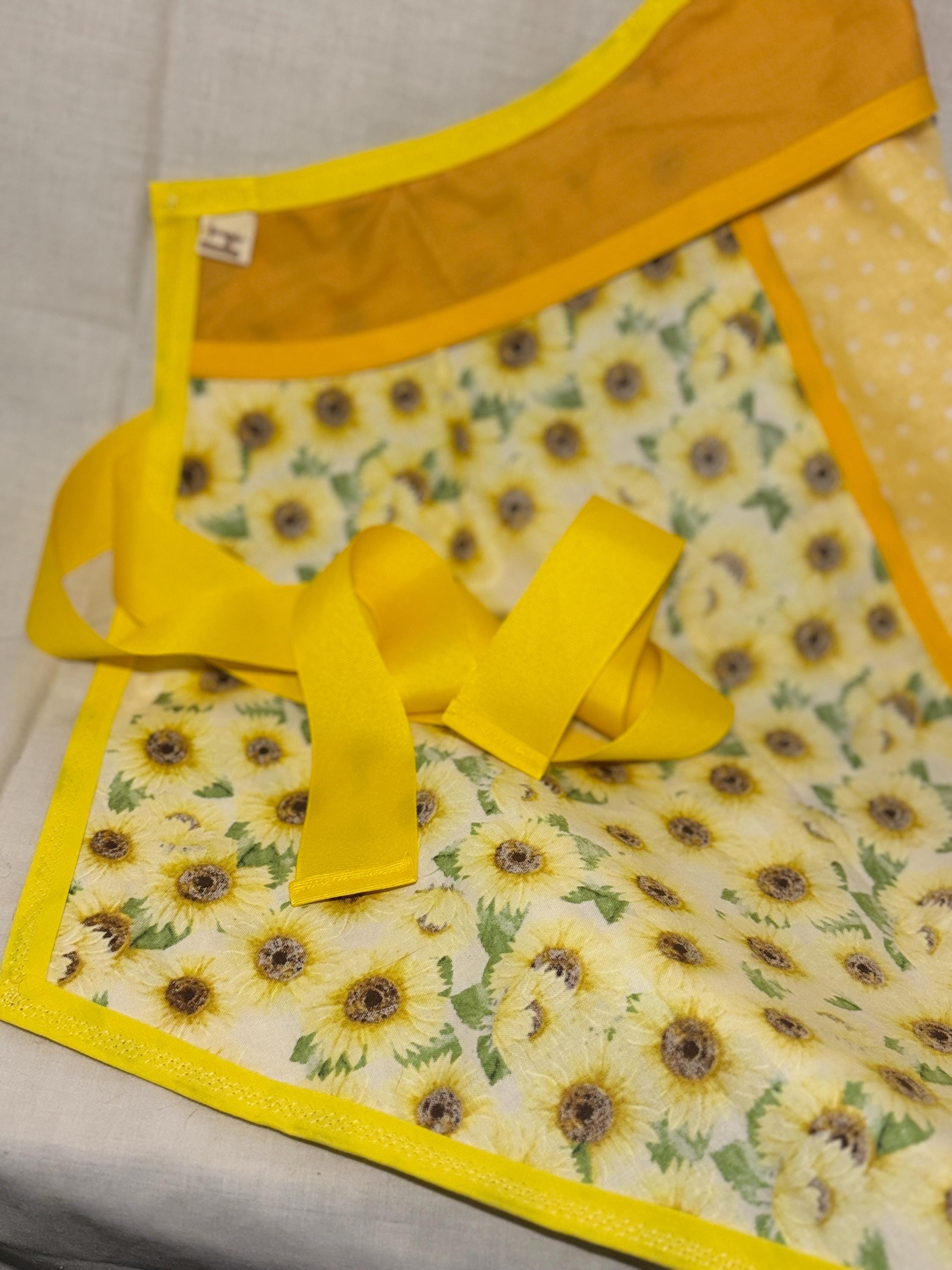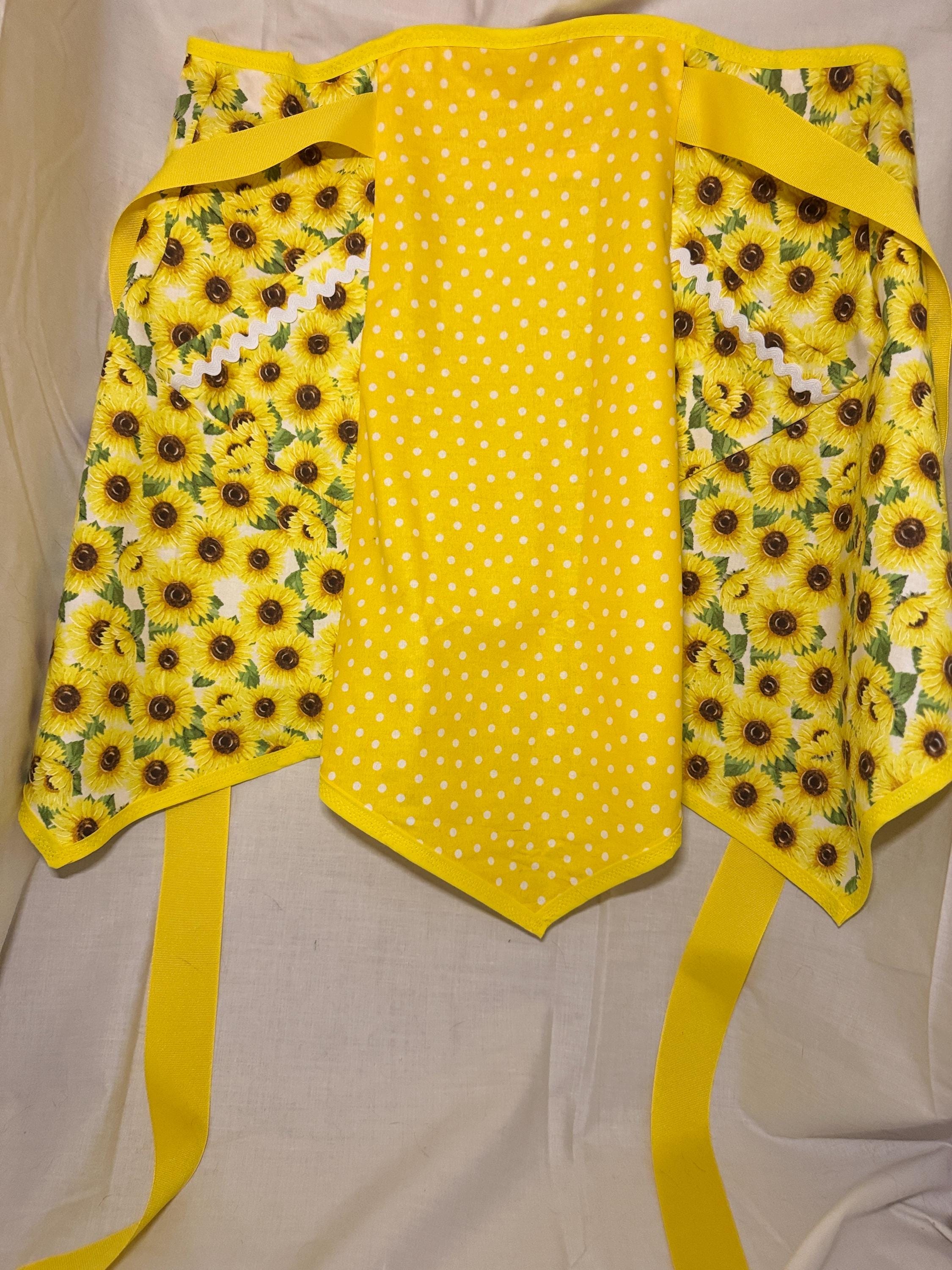 Handmade from a vintage 1950s pattern, it is made from 100% cotton and grosgrain ribbon. It is designed with sunflowers theme and yellow and white polka dot pattern. Made with love.