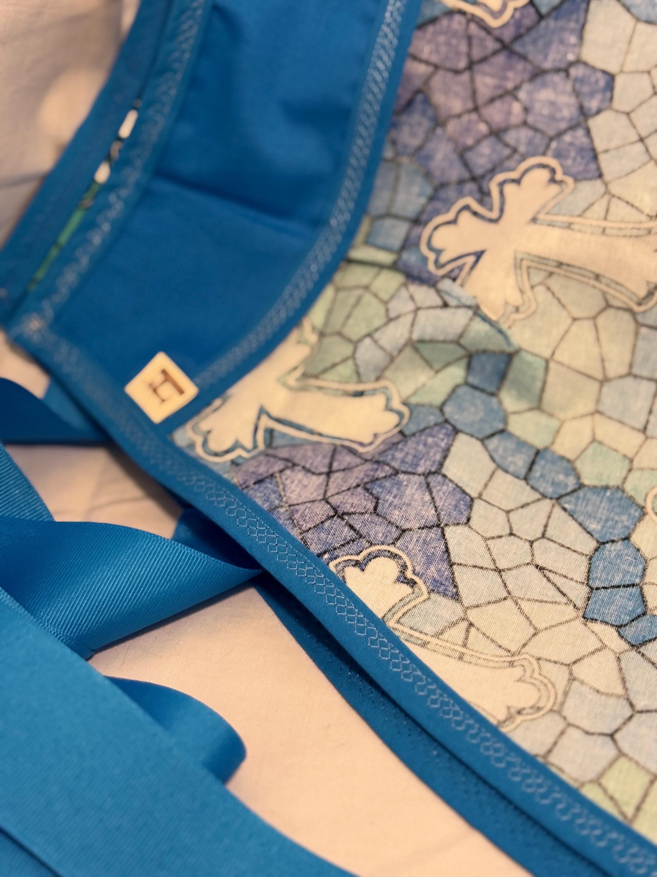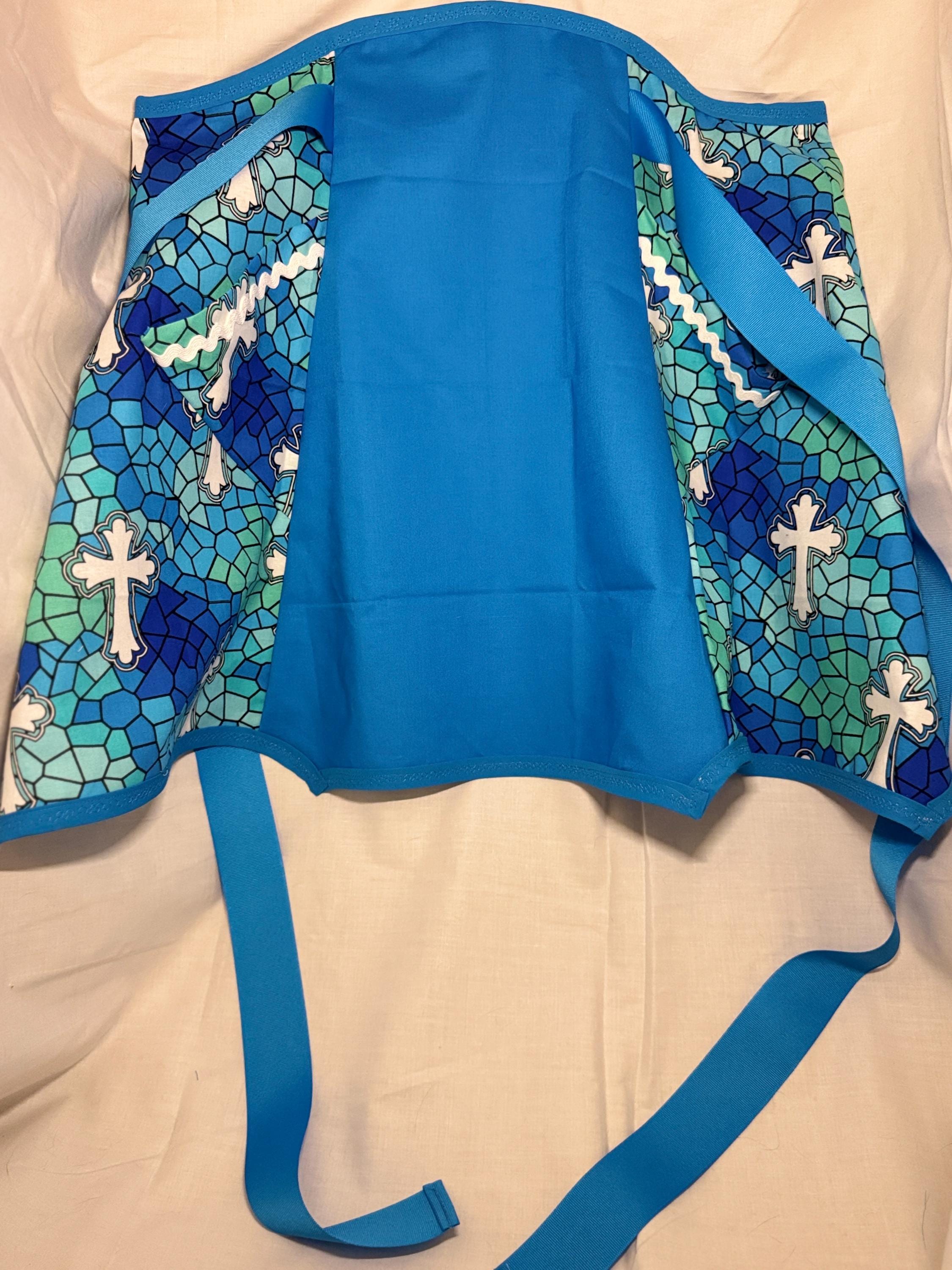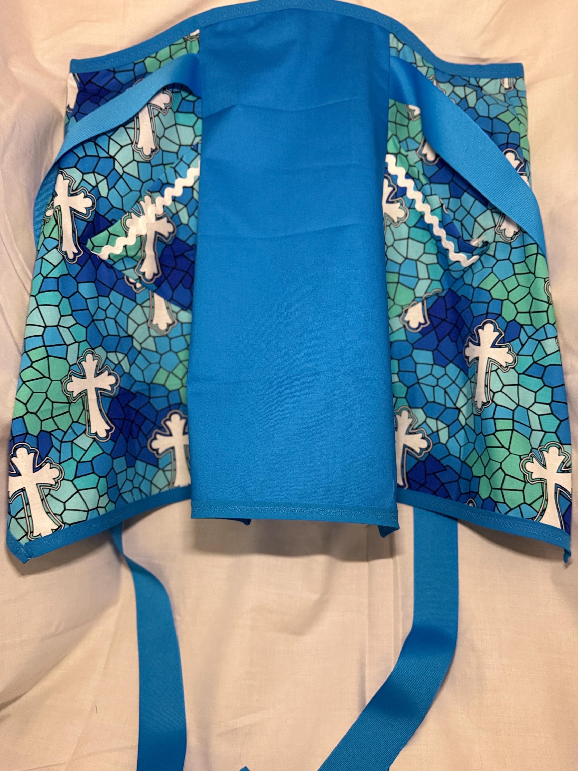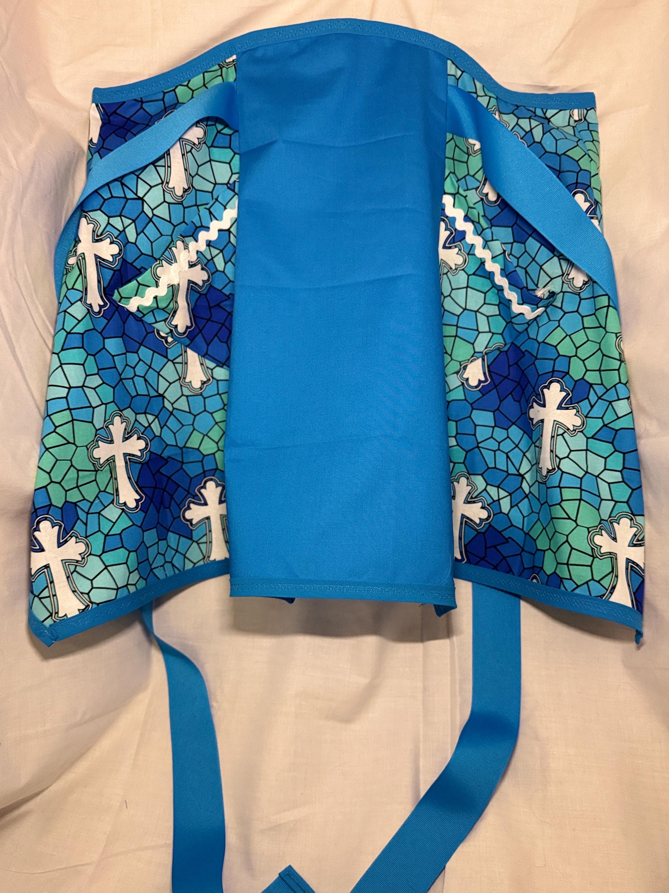 Handmade from a vintage 1950s pattern, it is made from 100% cotton and grosgrain ribbon. It is designed with a Crosses pattern. Made with love.