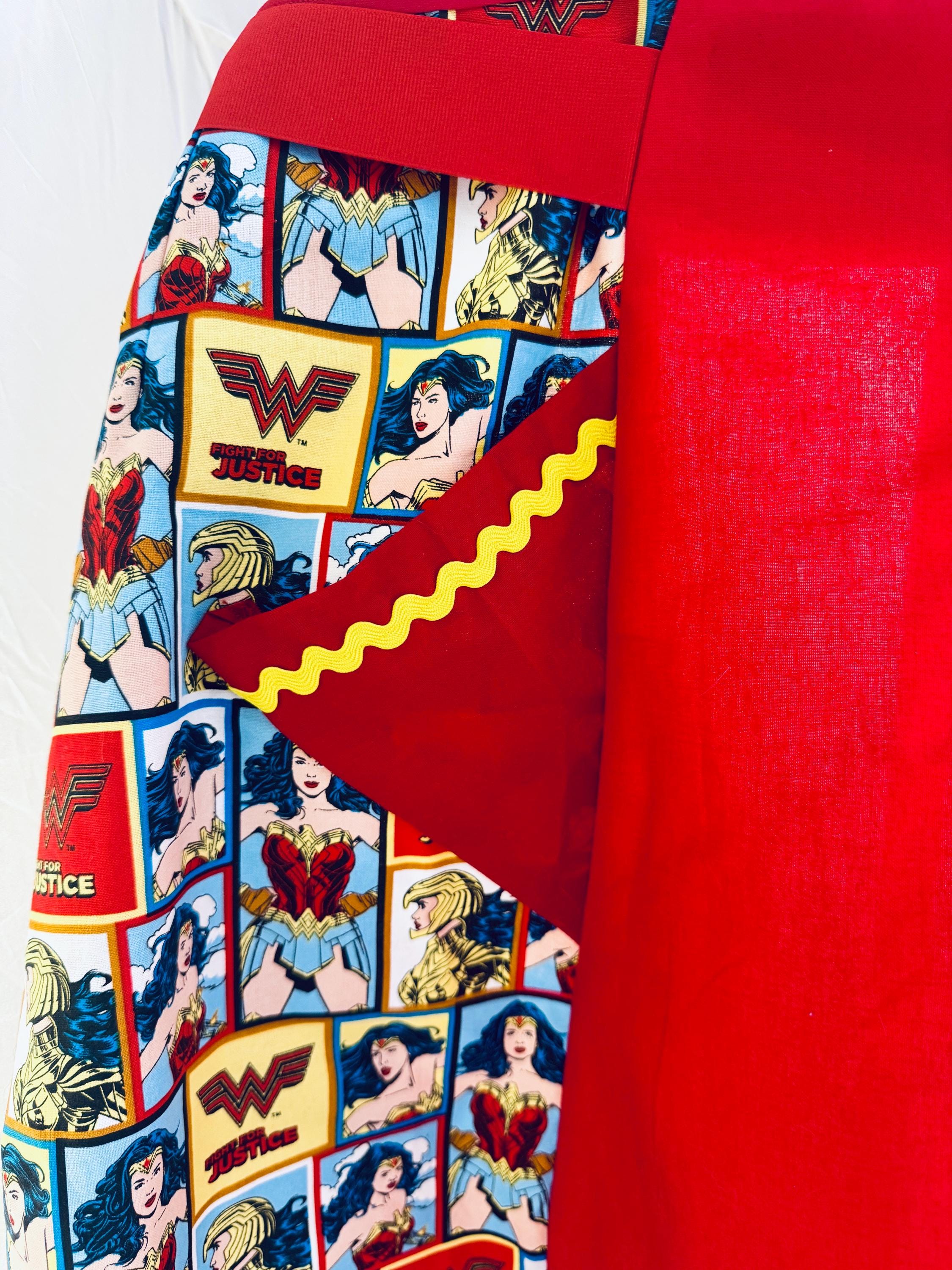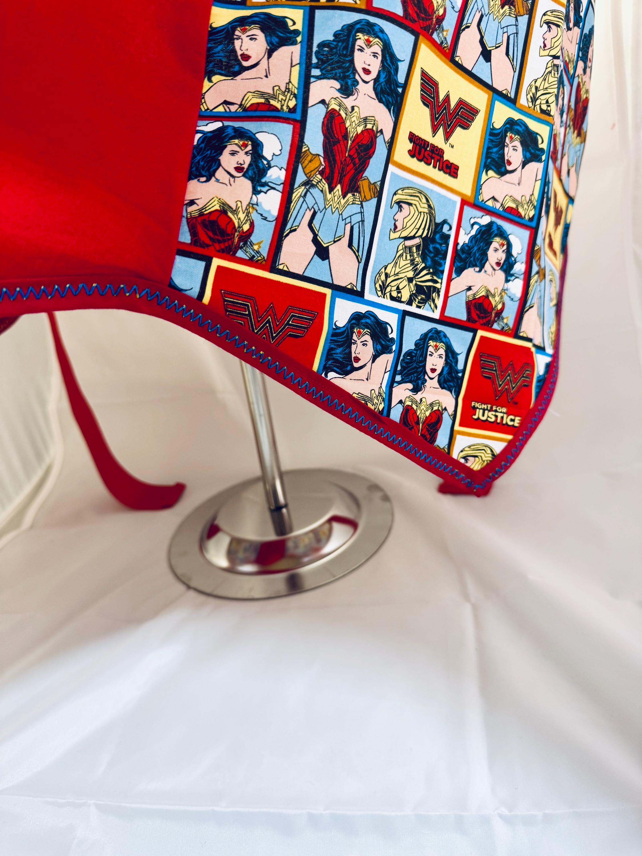 Handmade from a vintage 1950s pattern, it is made from 100% cotton and grosgrain ribbon. It is designed with Wonder Woman theme. Made with love.