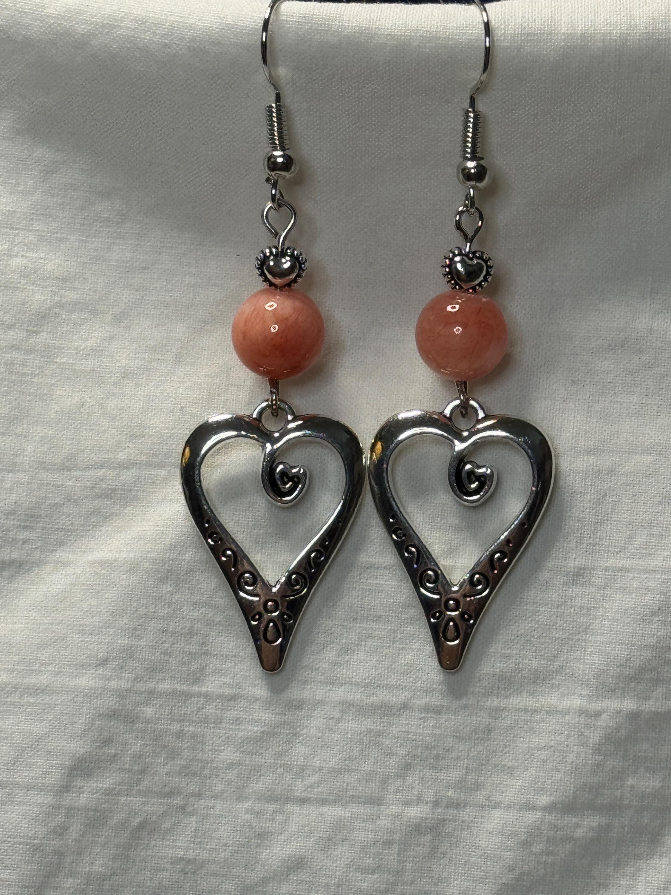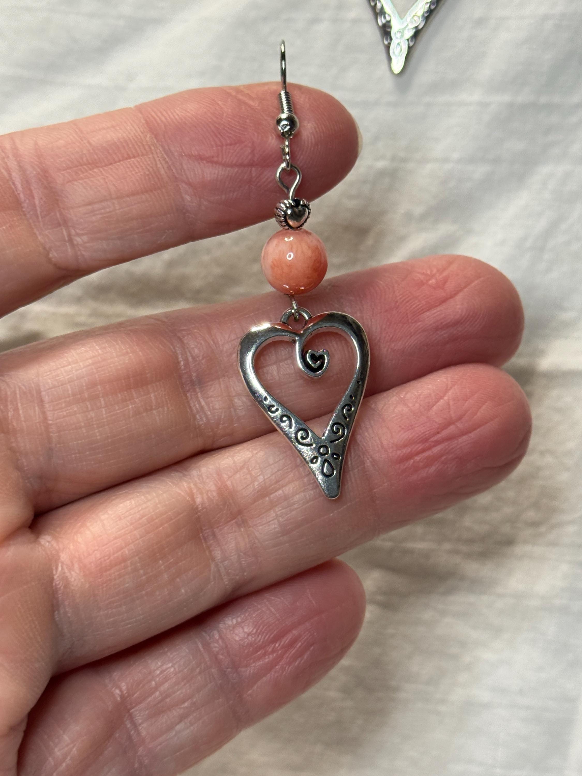 Dangle earrings with pink and white natural stone, zinc alloy hear charm.