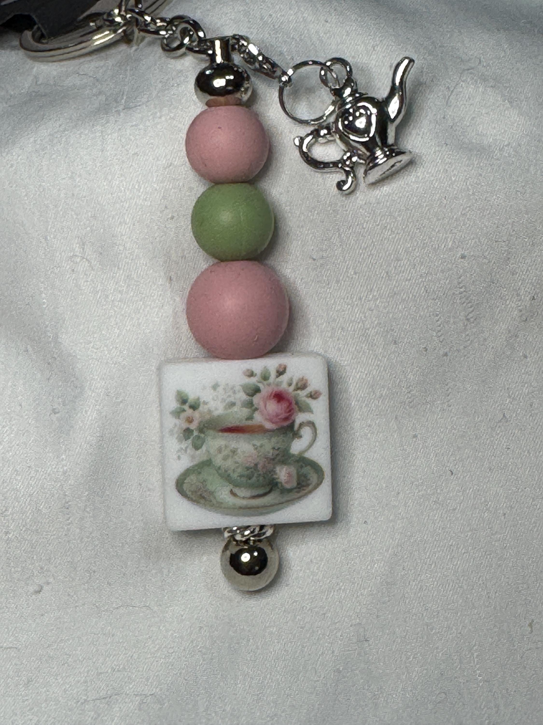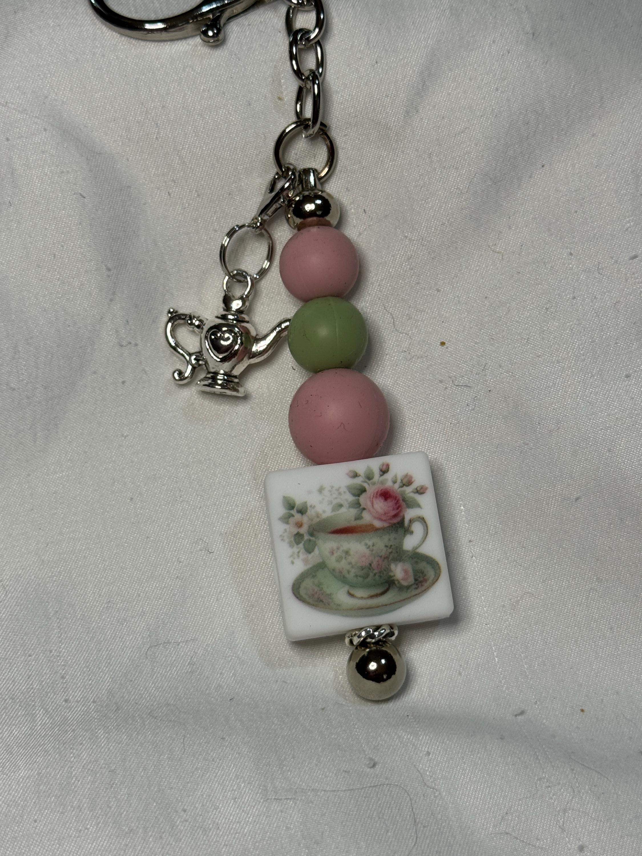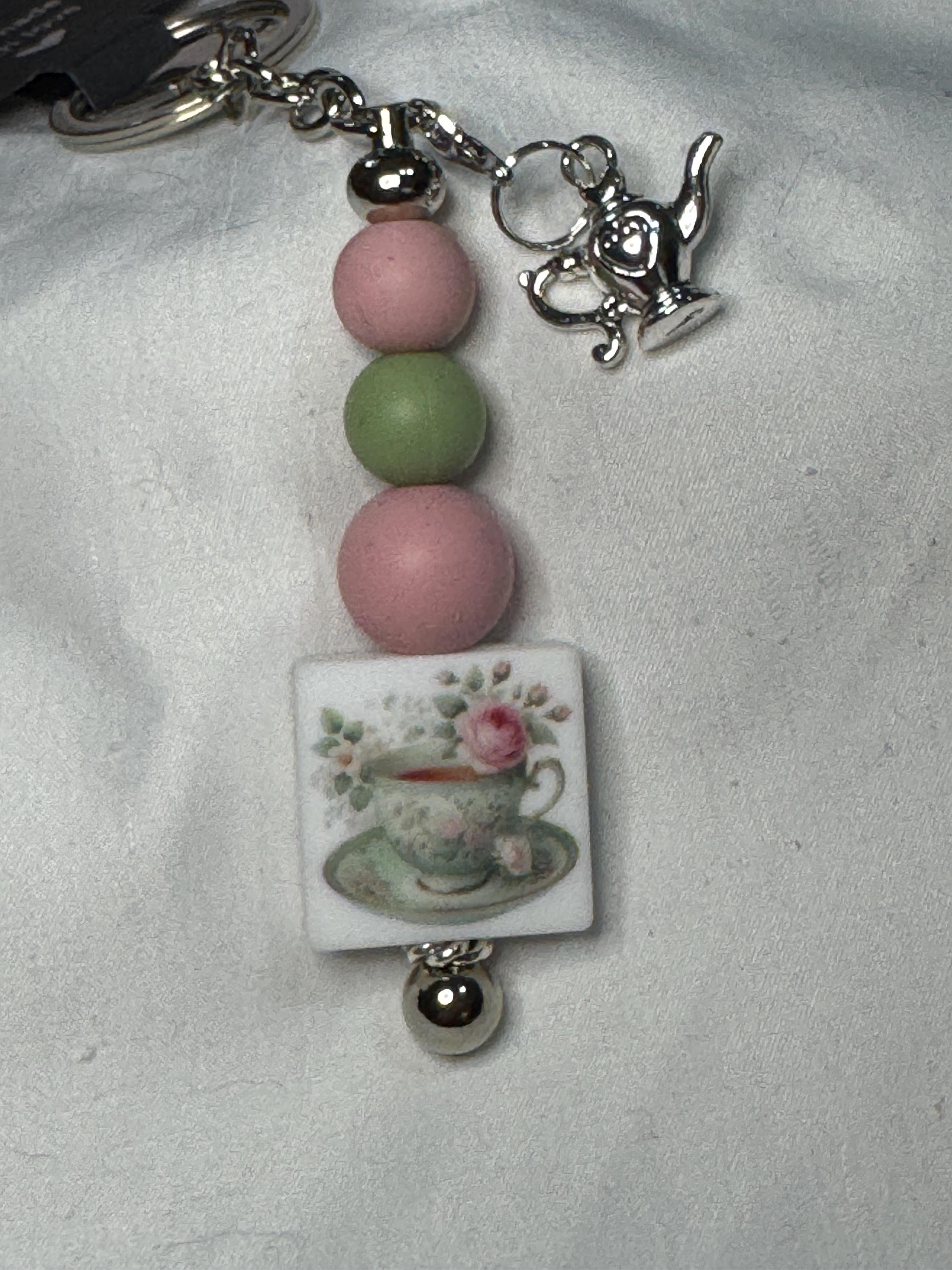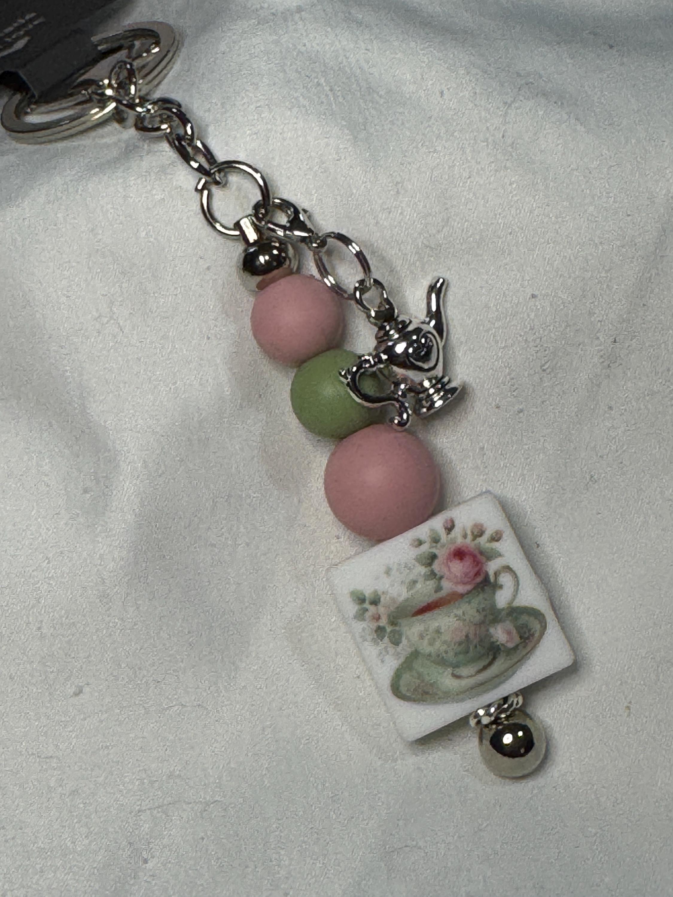Keychain for tea lovers! Teacup in pink and sage green with roses and teapot charm.