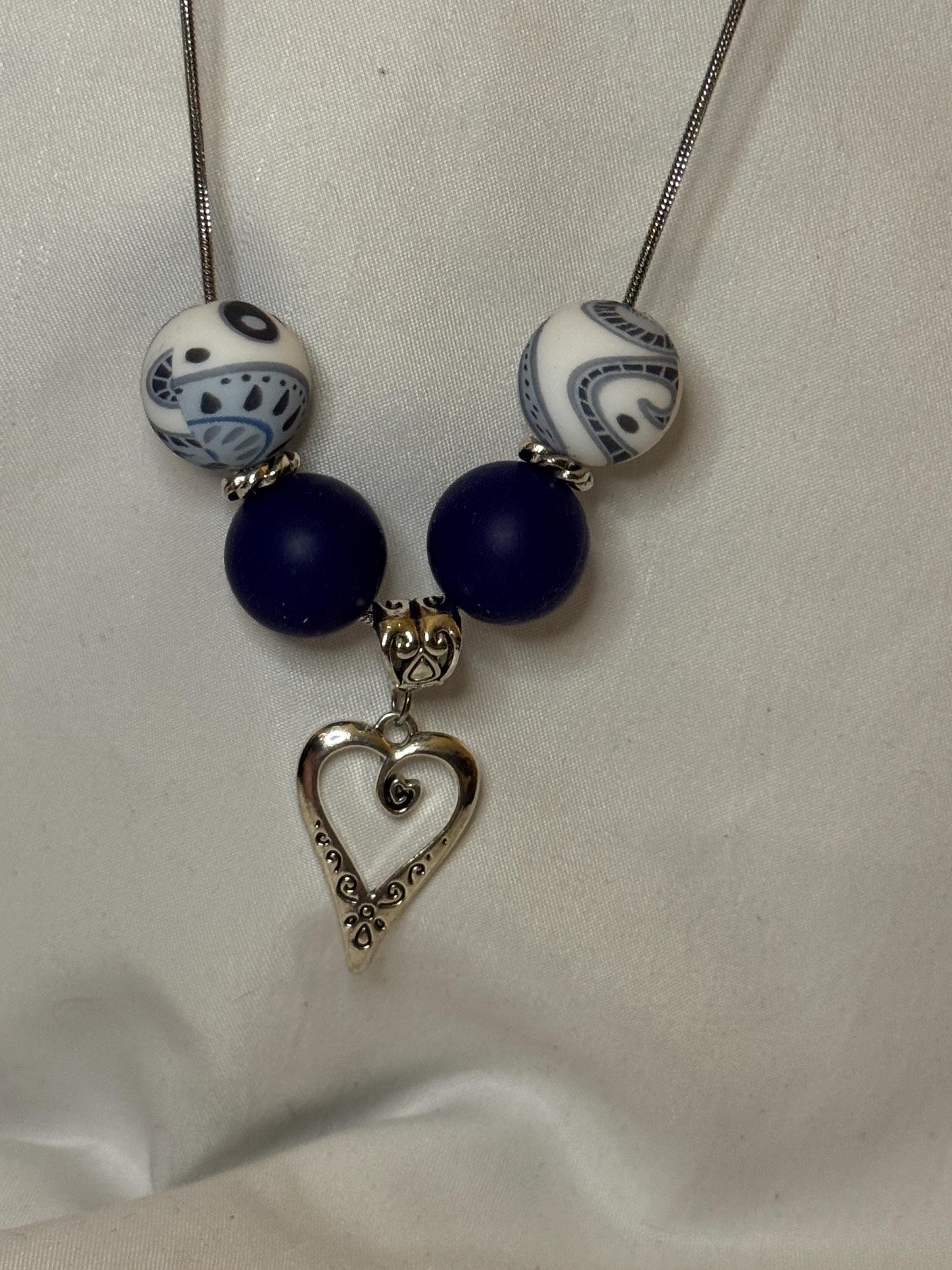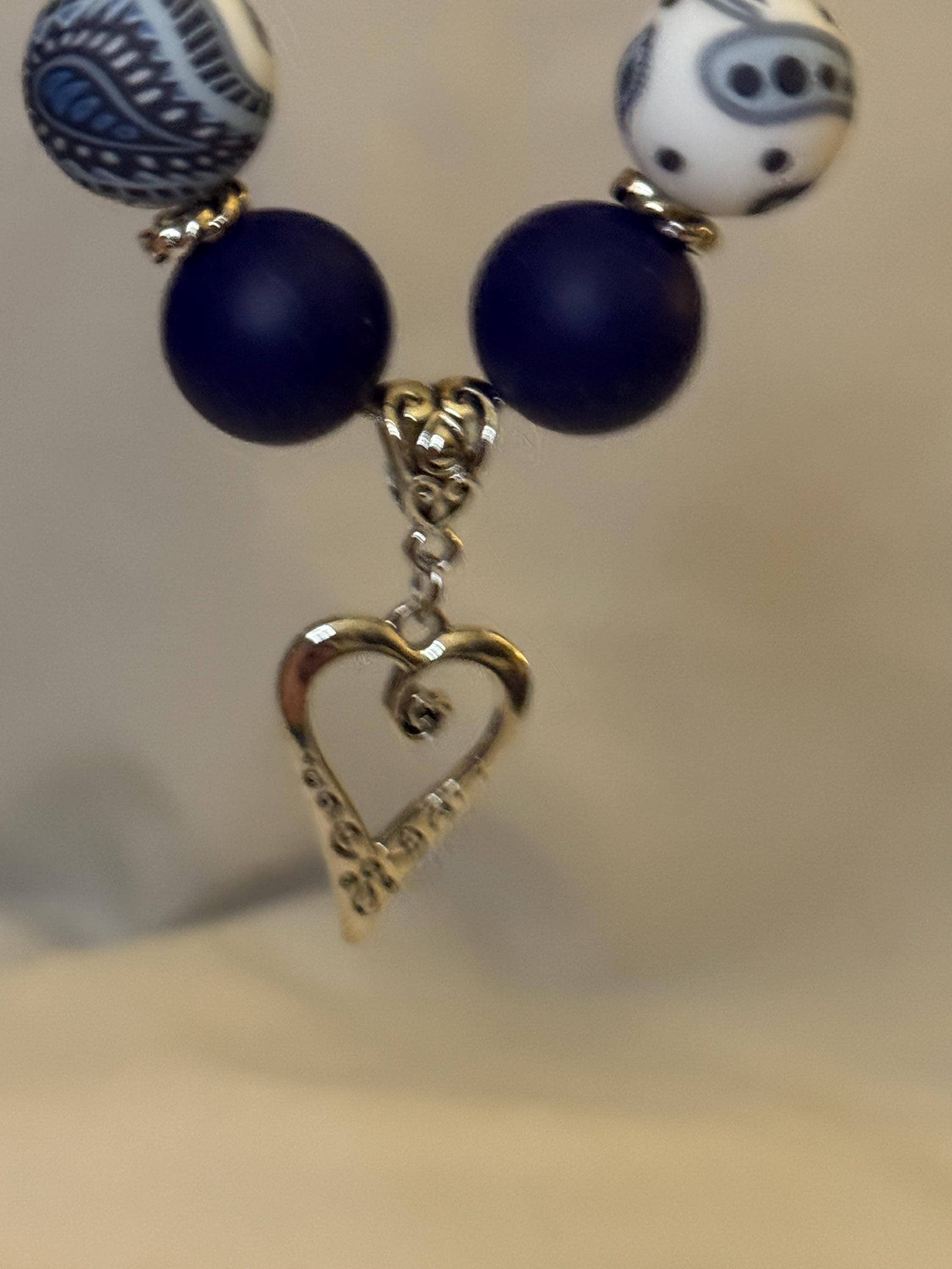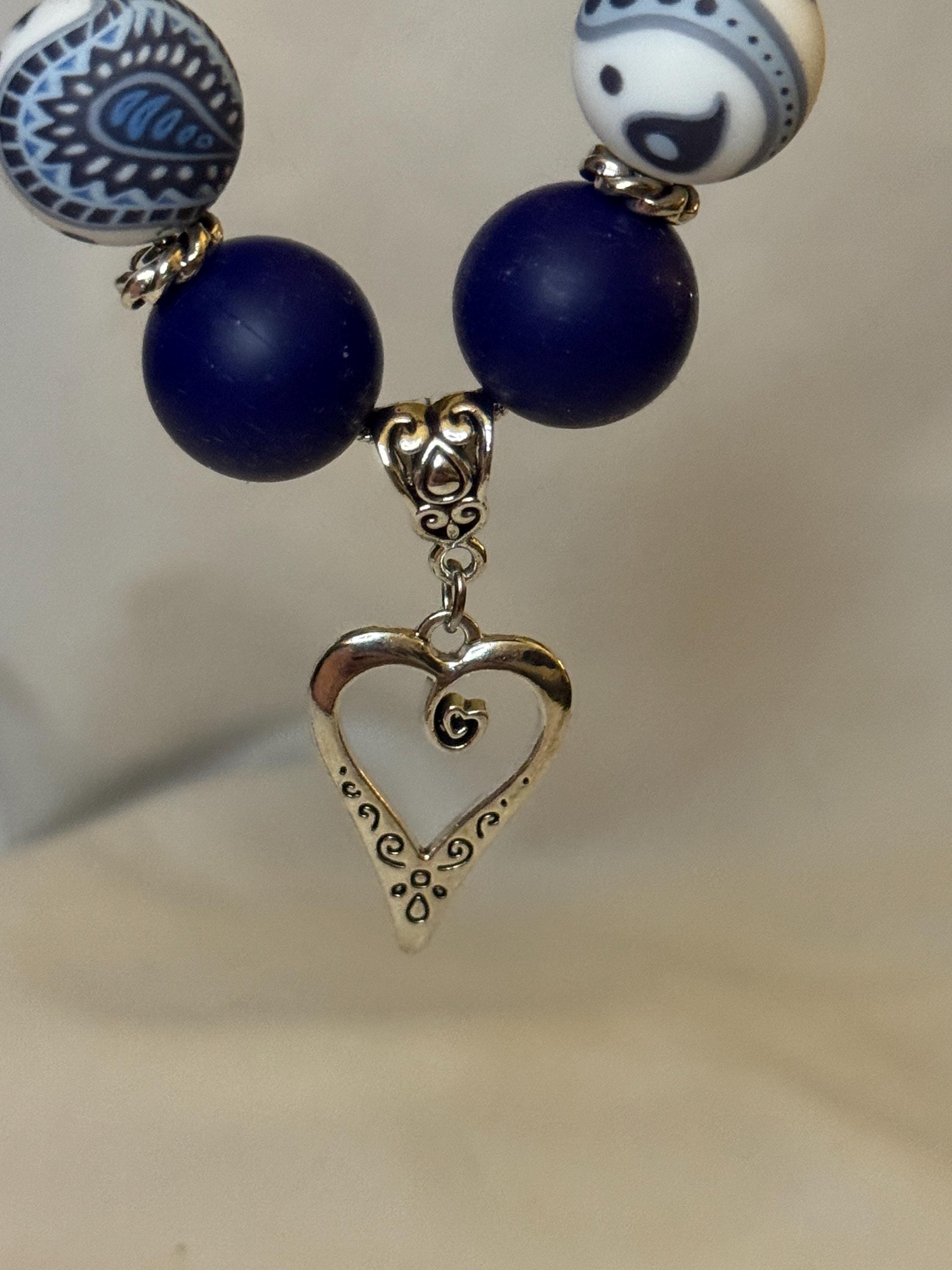 Zinc alloy chain that can be extended. Silicone blue paisley and navy blue beads. Zinc alloy spacers . Zinc alloy heart charm.