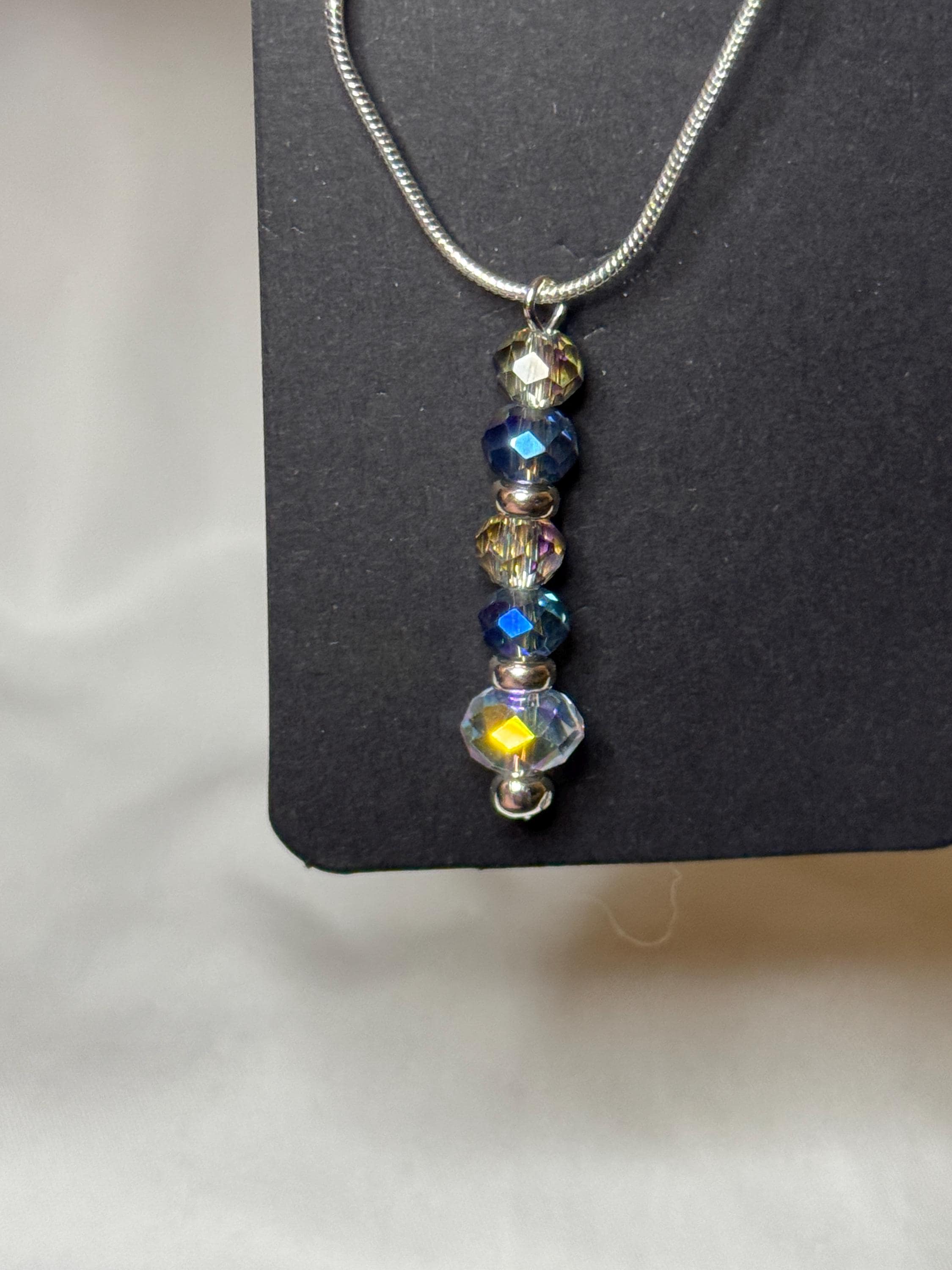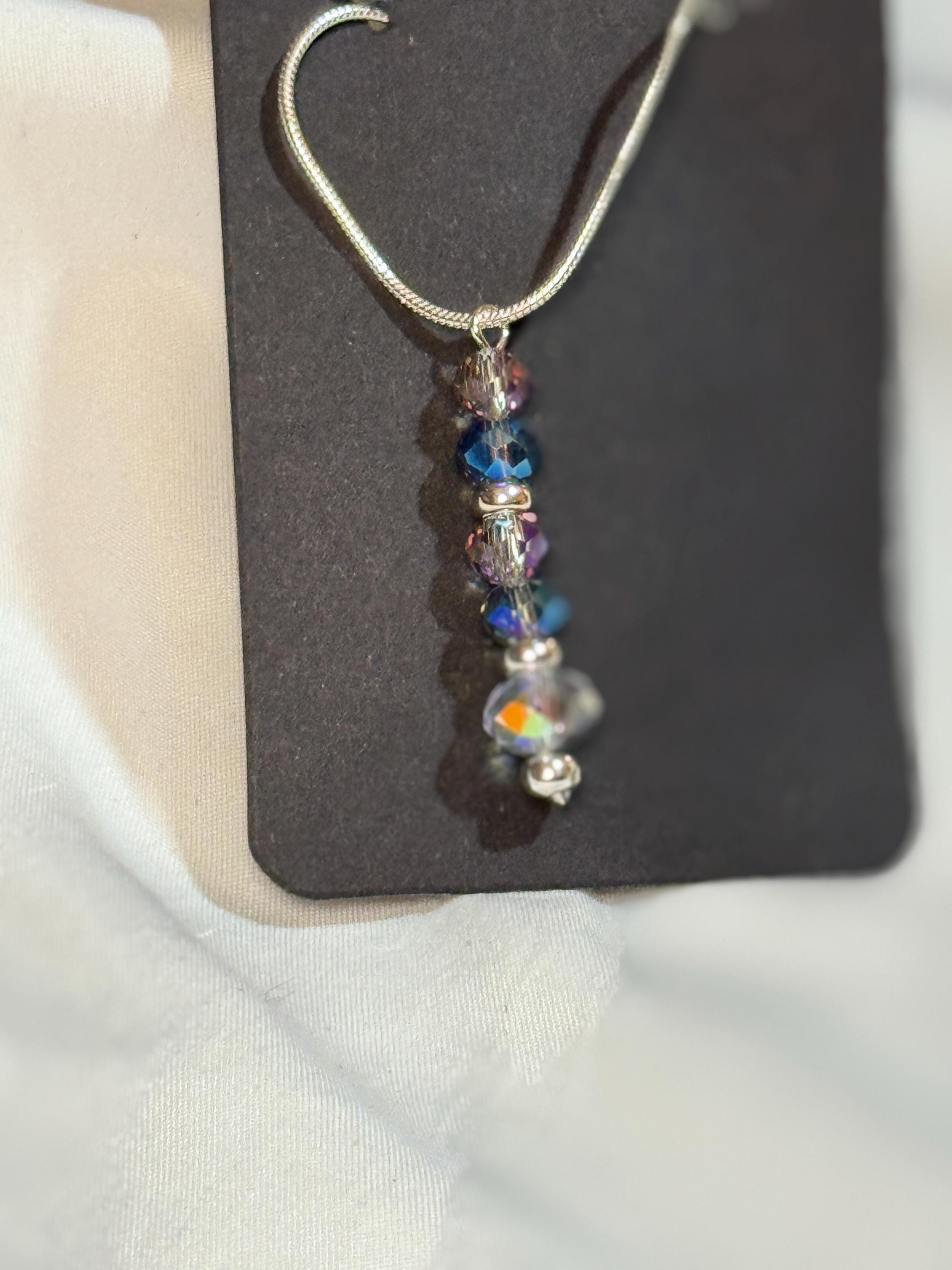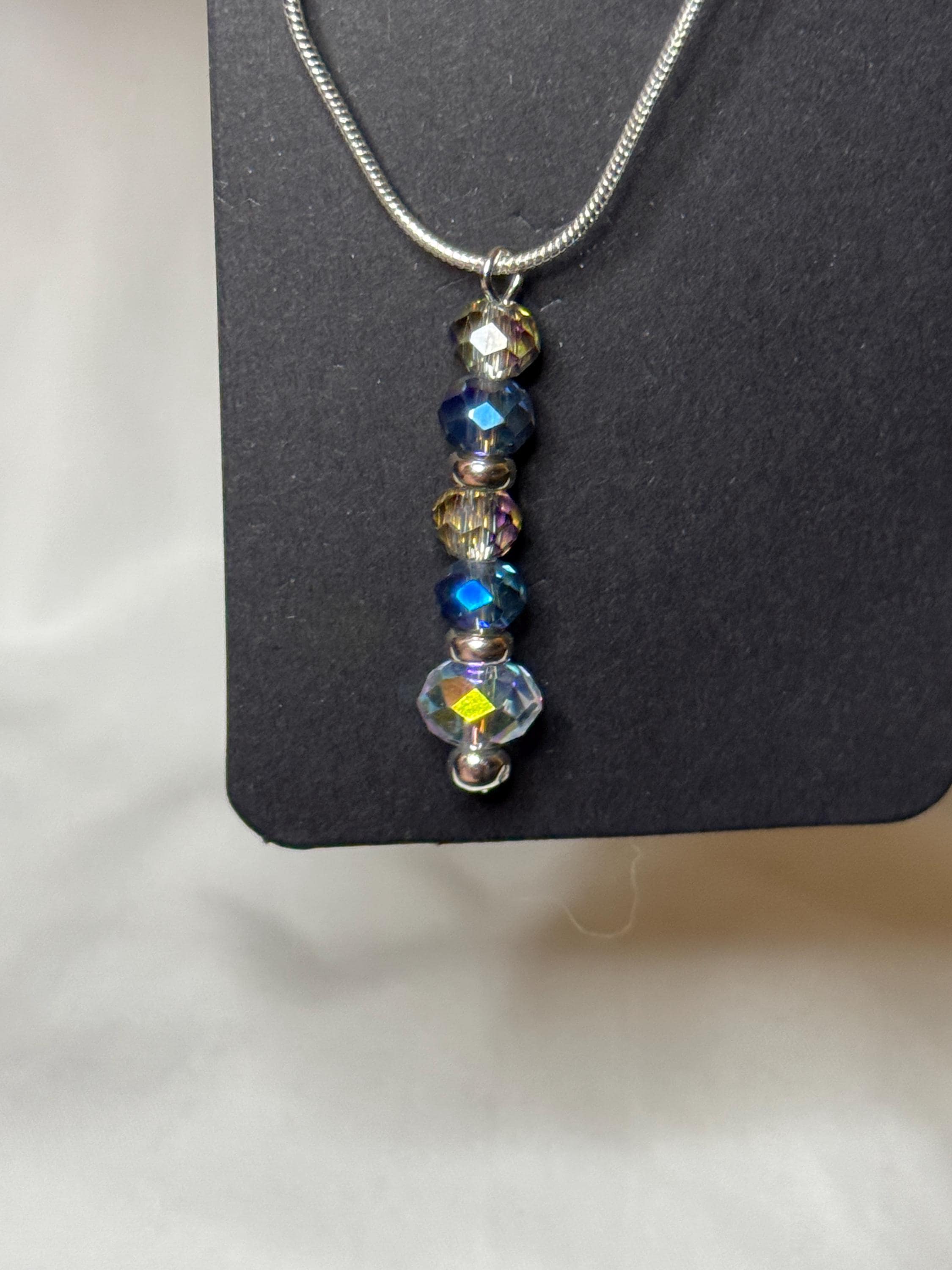22 inch sterling silver chain with handmade charm made of blue and clear Austrian crystals, silver spacers approximately 1 inch long.