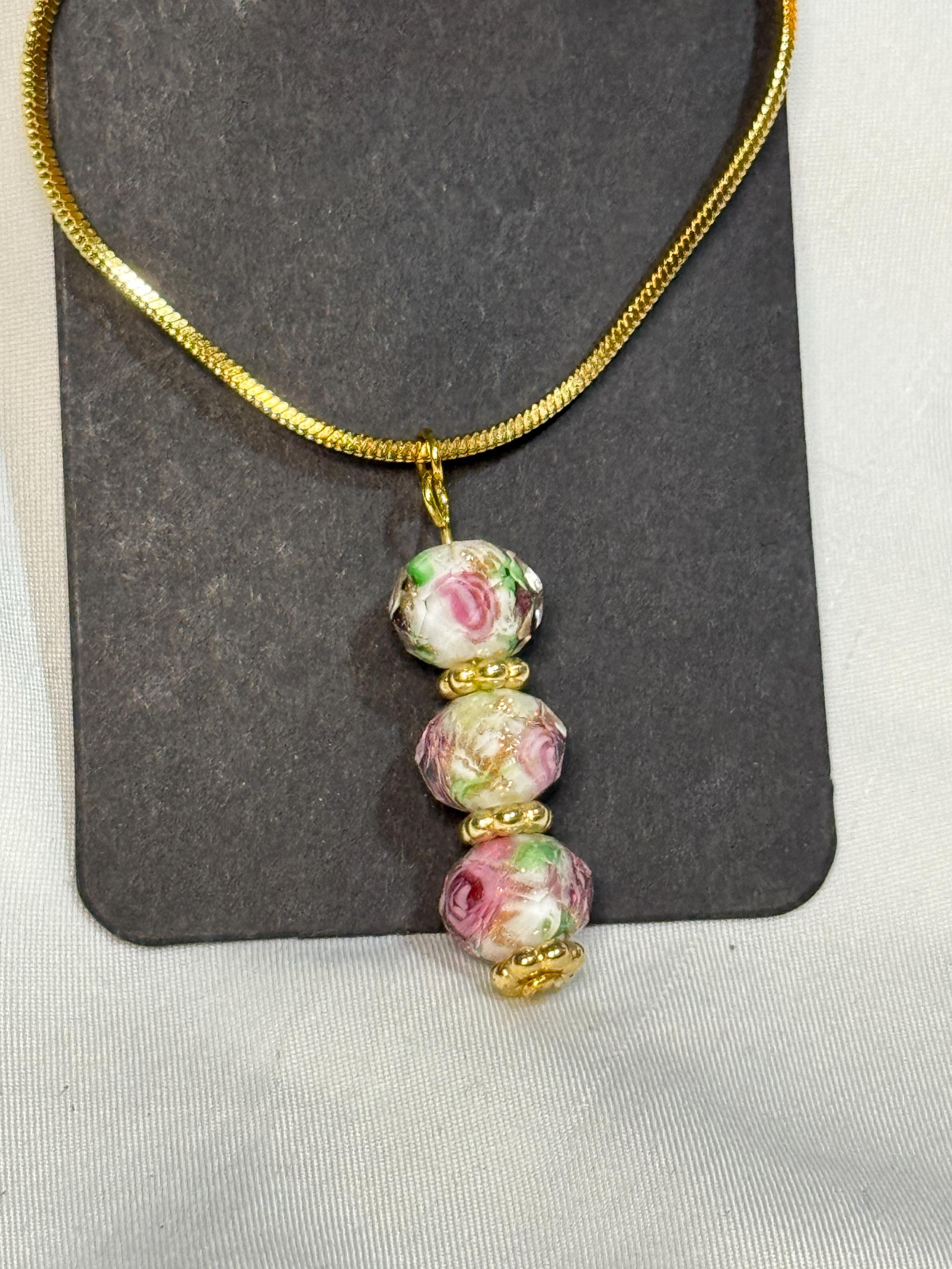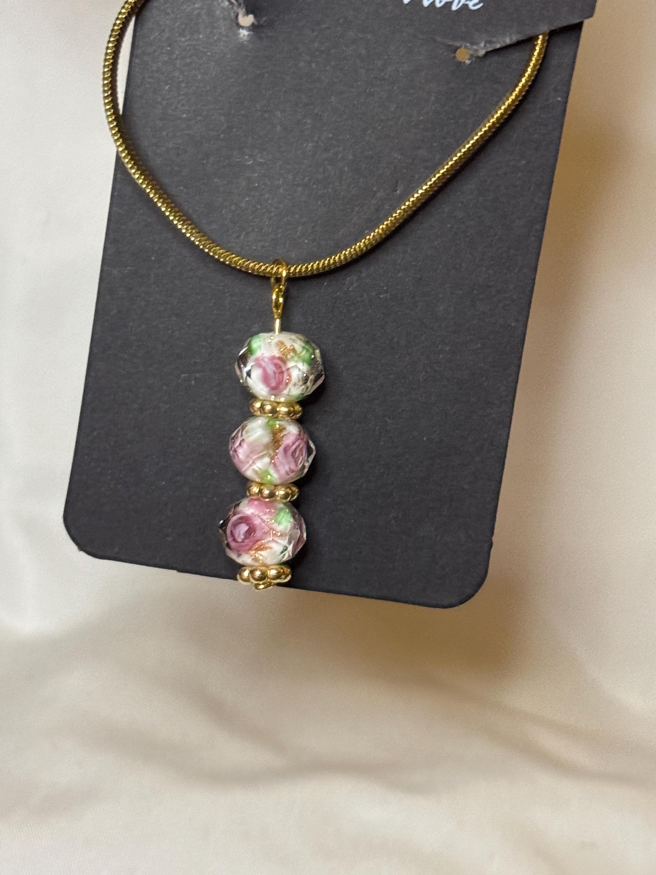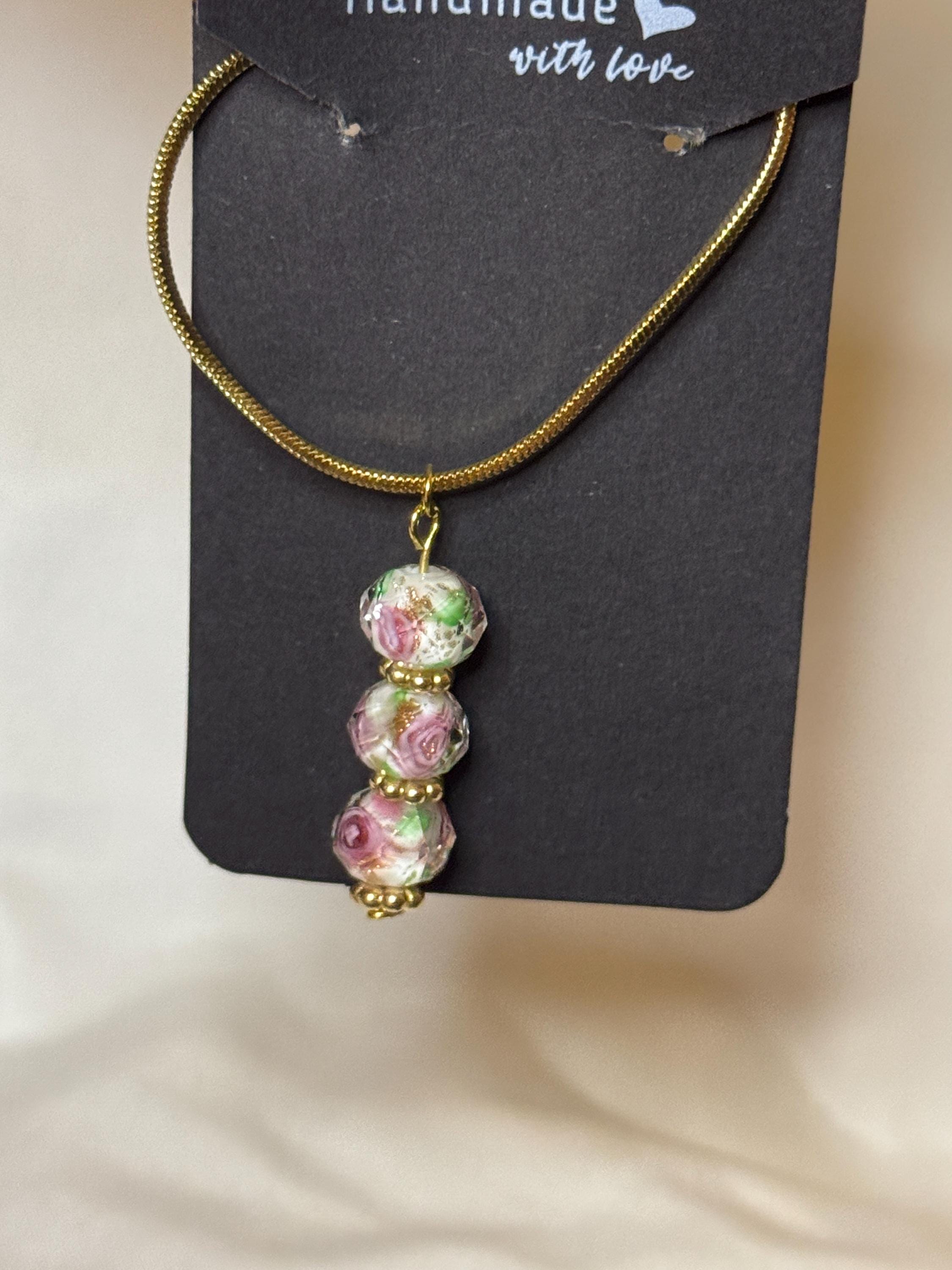 24 inch 18K Gold Plated Necklace with handmade charm made from pink rose glass beads and gold zinc alloy spacer beads.