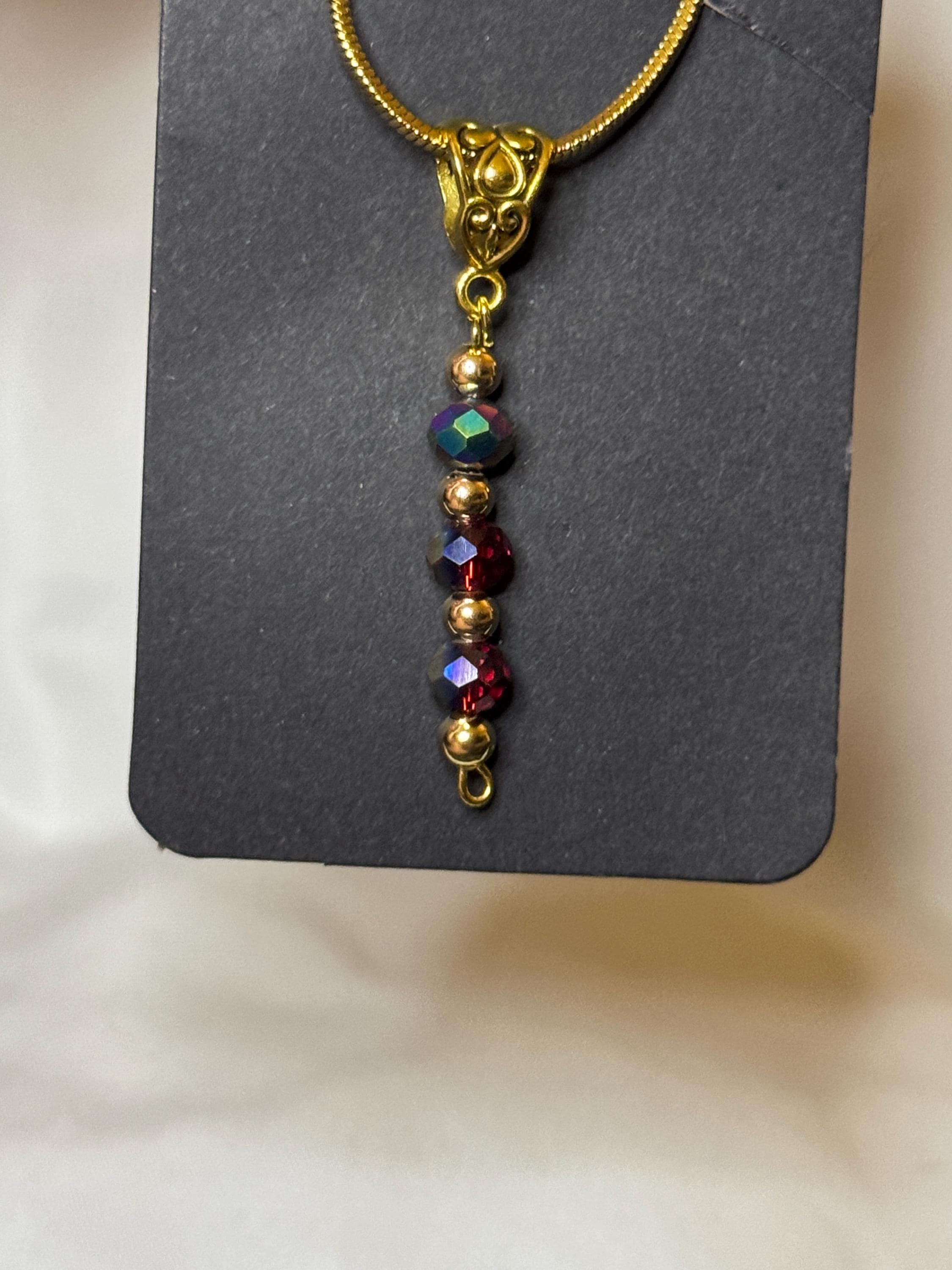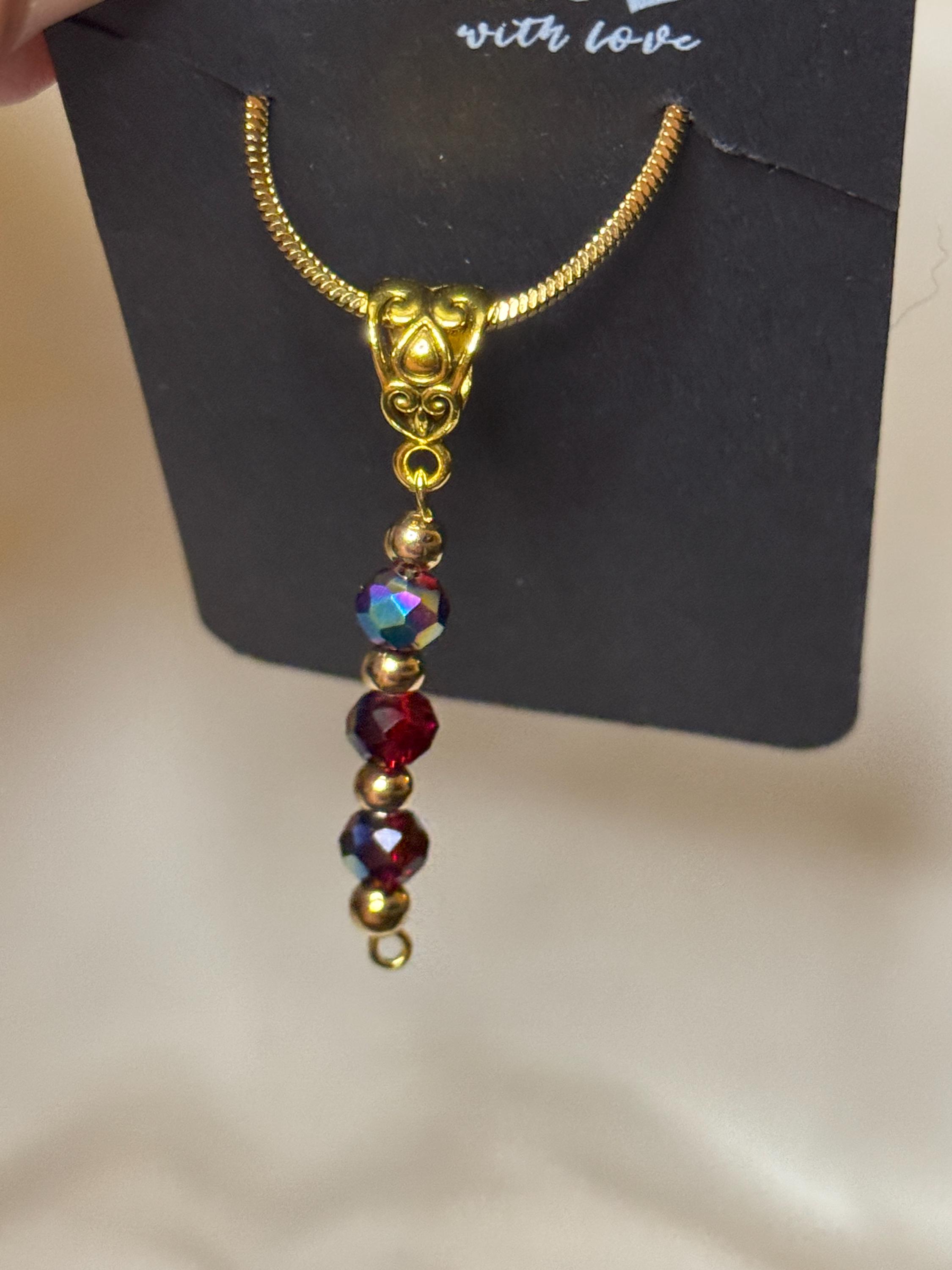 24 Inch 18k gold plated necklace with handmade charm made from Red Austrian Crystal beads and zinc gold plated spacers.