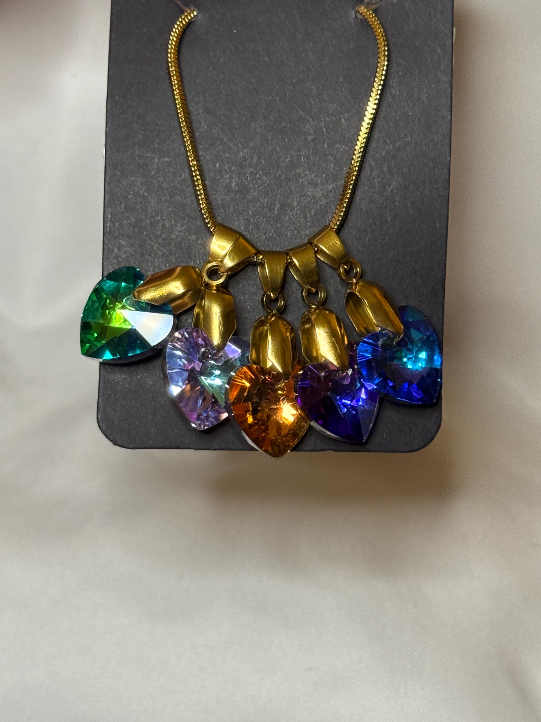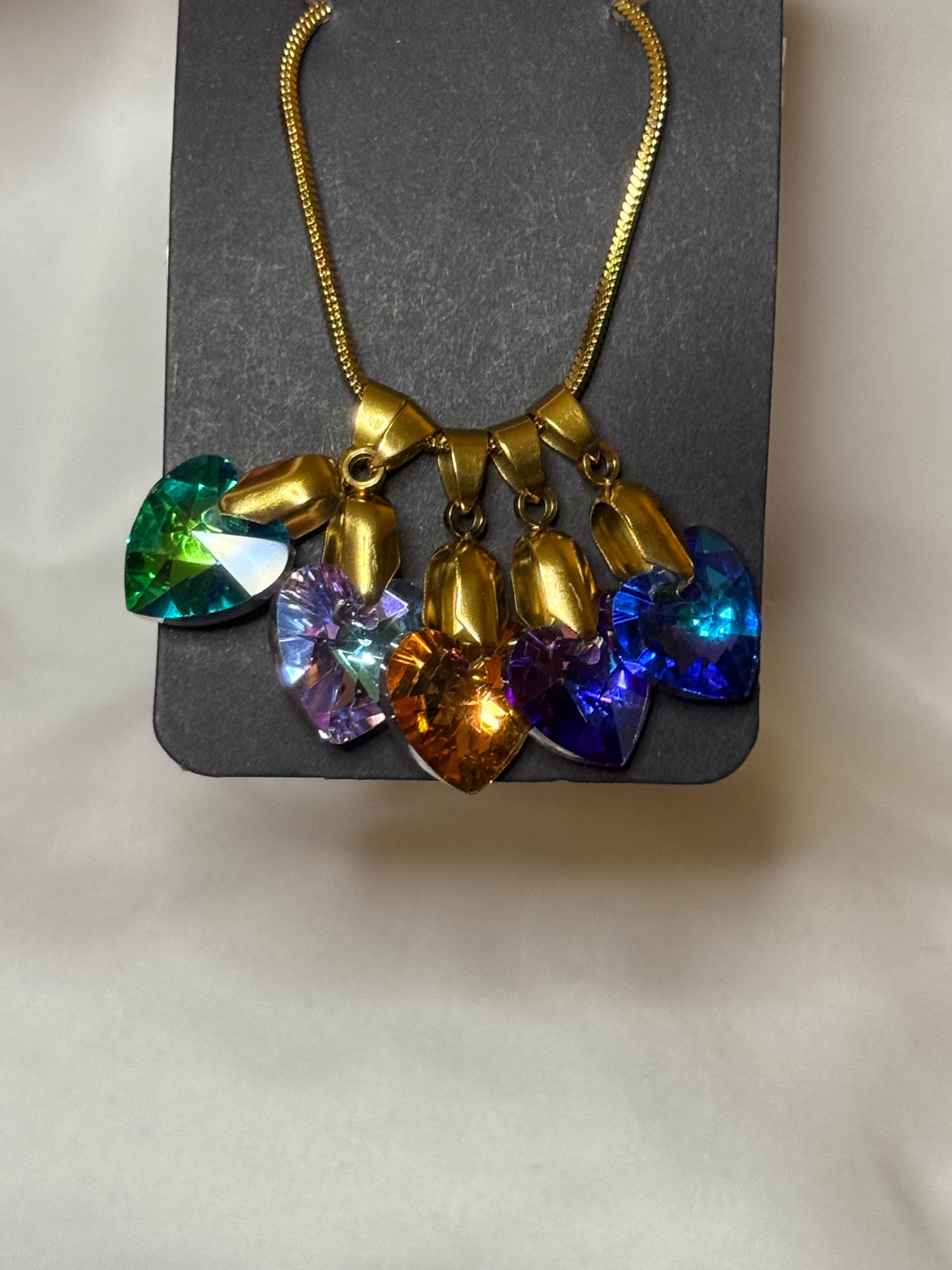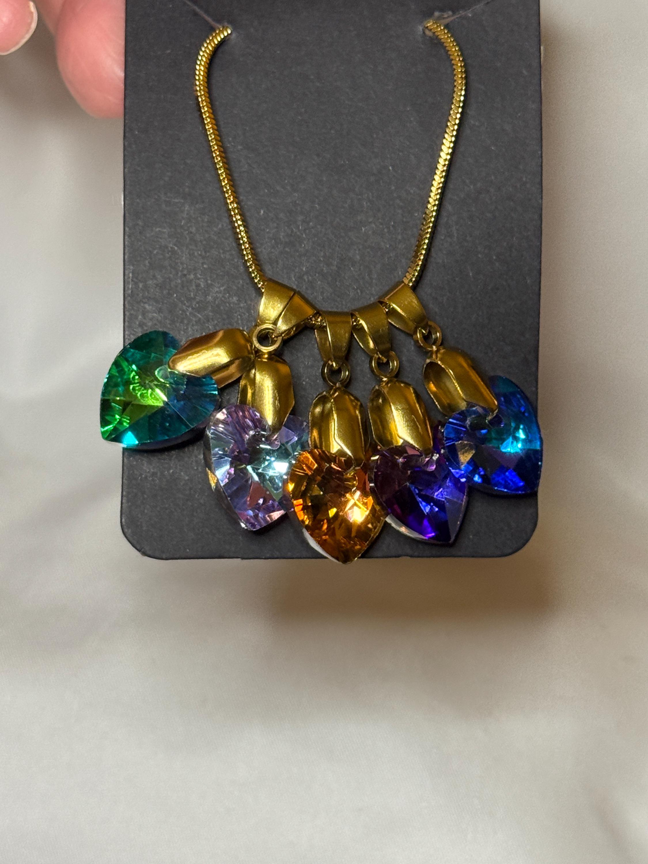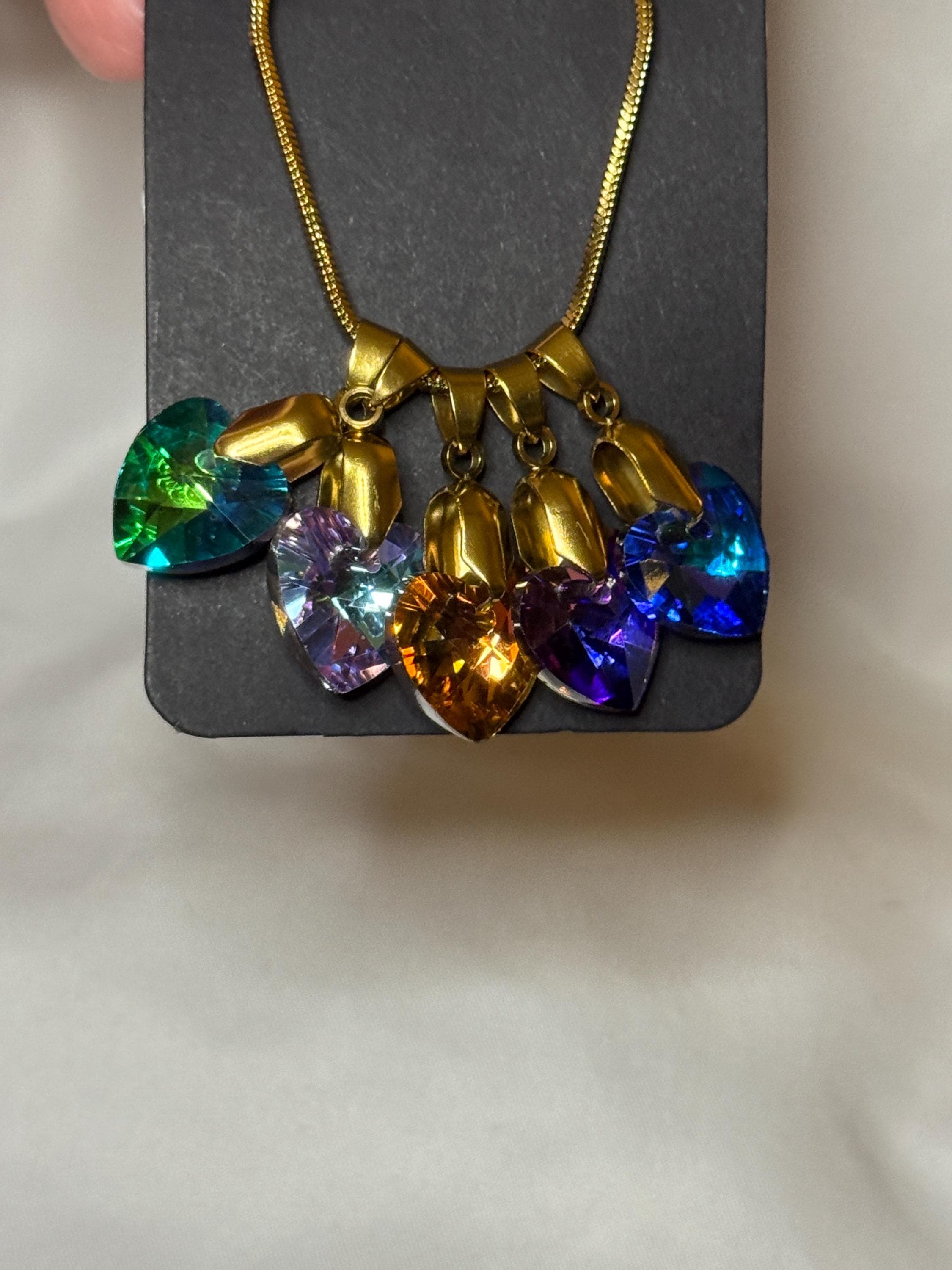 24 inch 18K Gold Plated Necklace with five individual glass hearts in Fuschia, Green, Blue, Lilac and Purple.