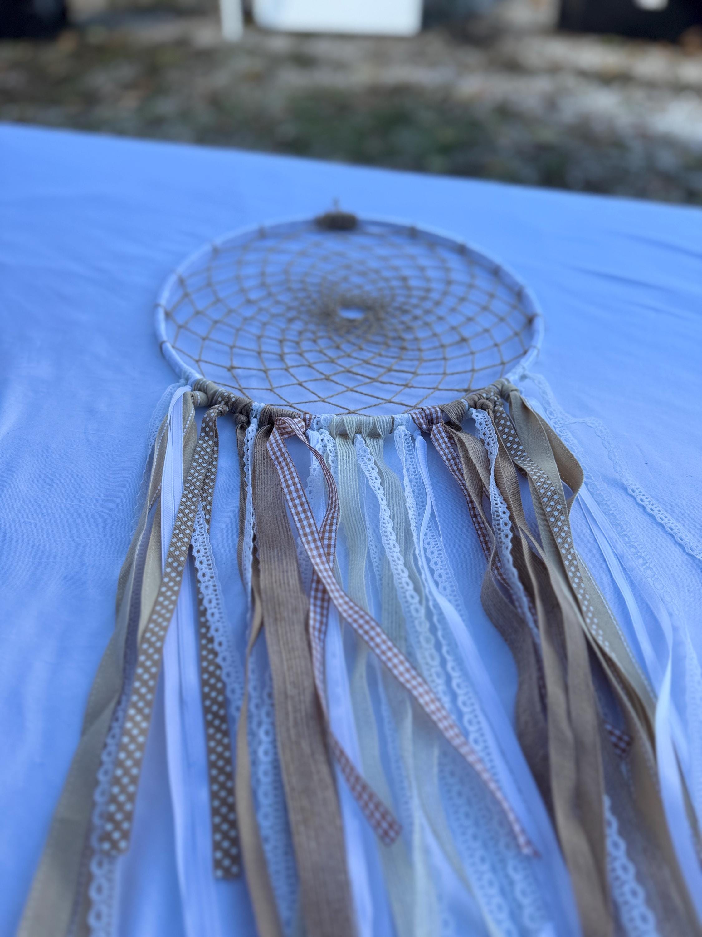Handmade dreamcatcher 12 inches in diameter. Made with white satin ribbon around ring. Different variations of webbing either tan hemp cord or white cotton cord. White and tan ribbons different textured ribbon.
