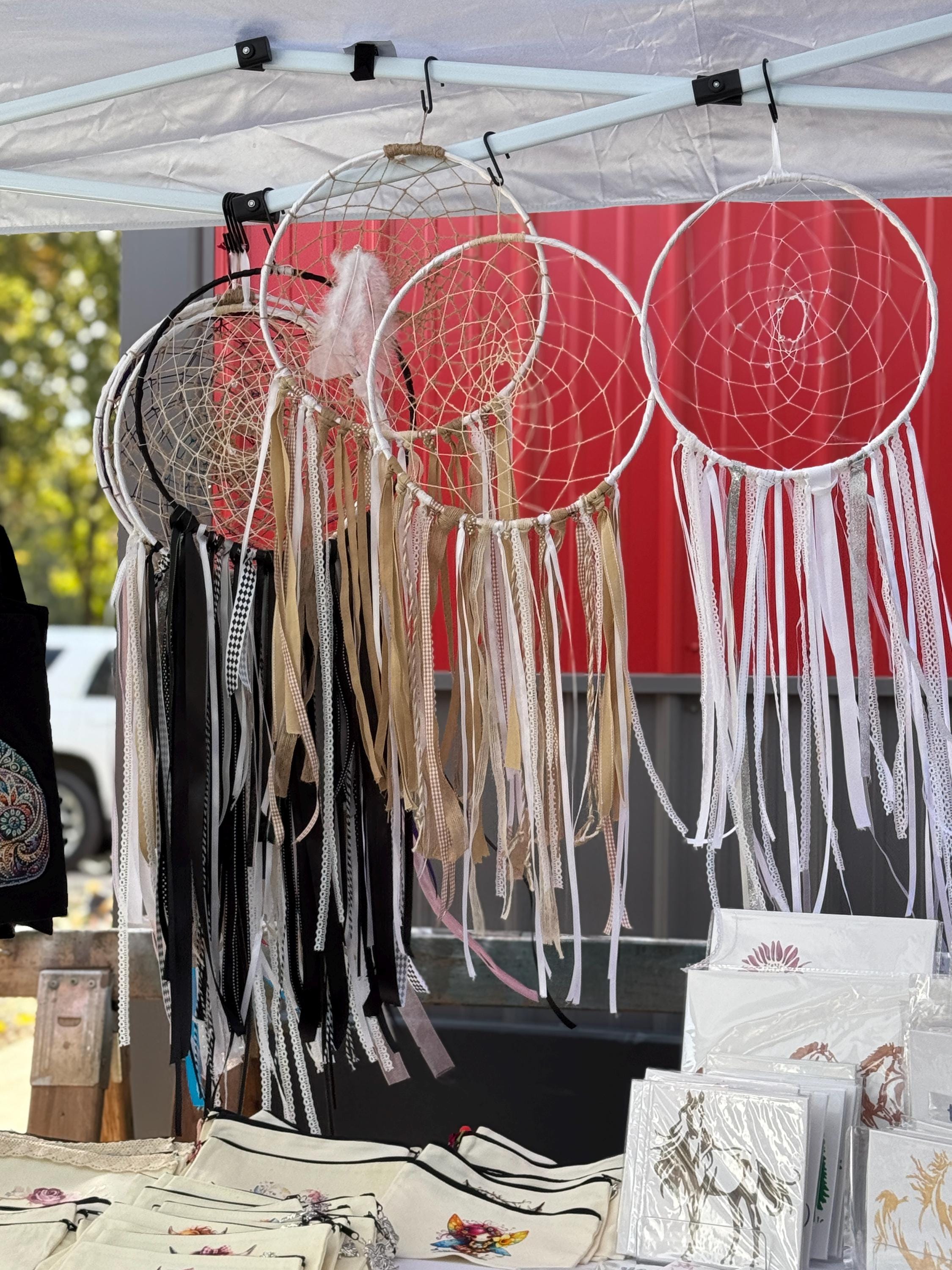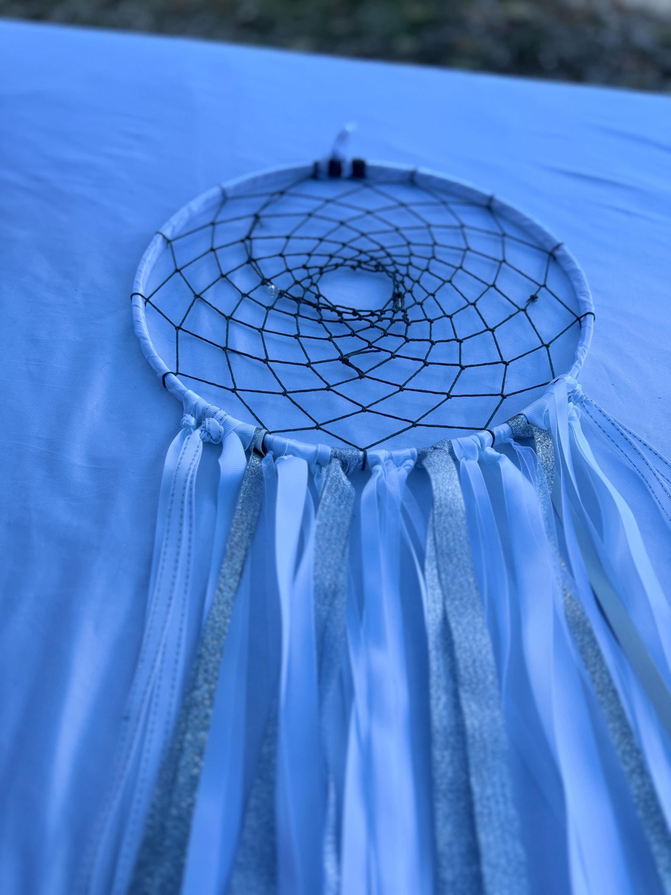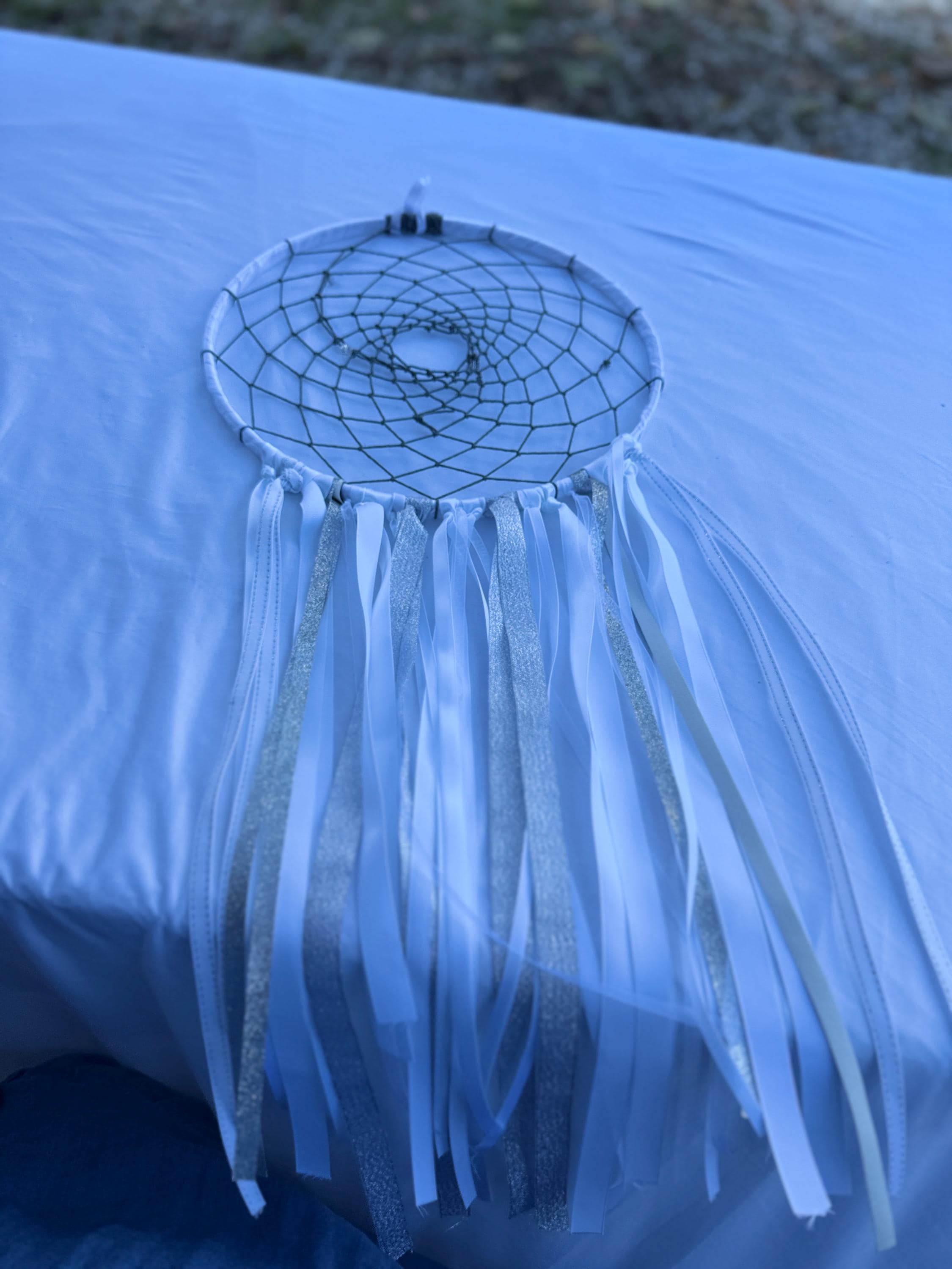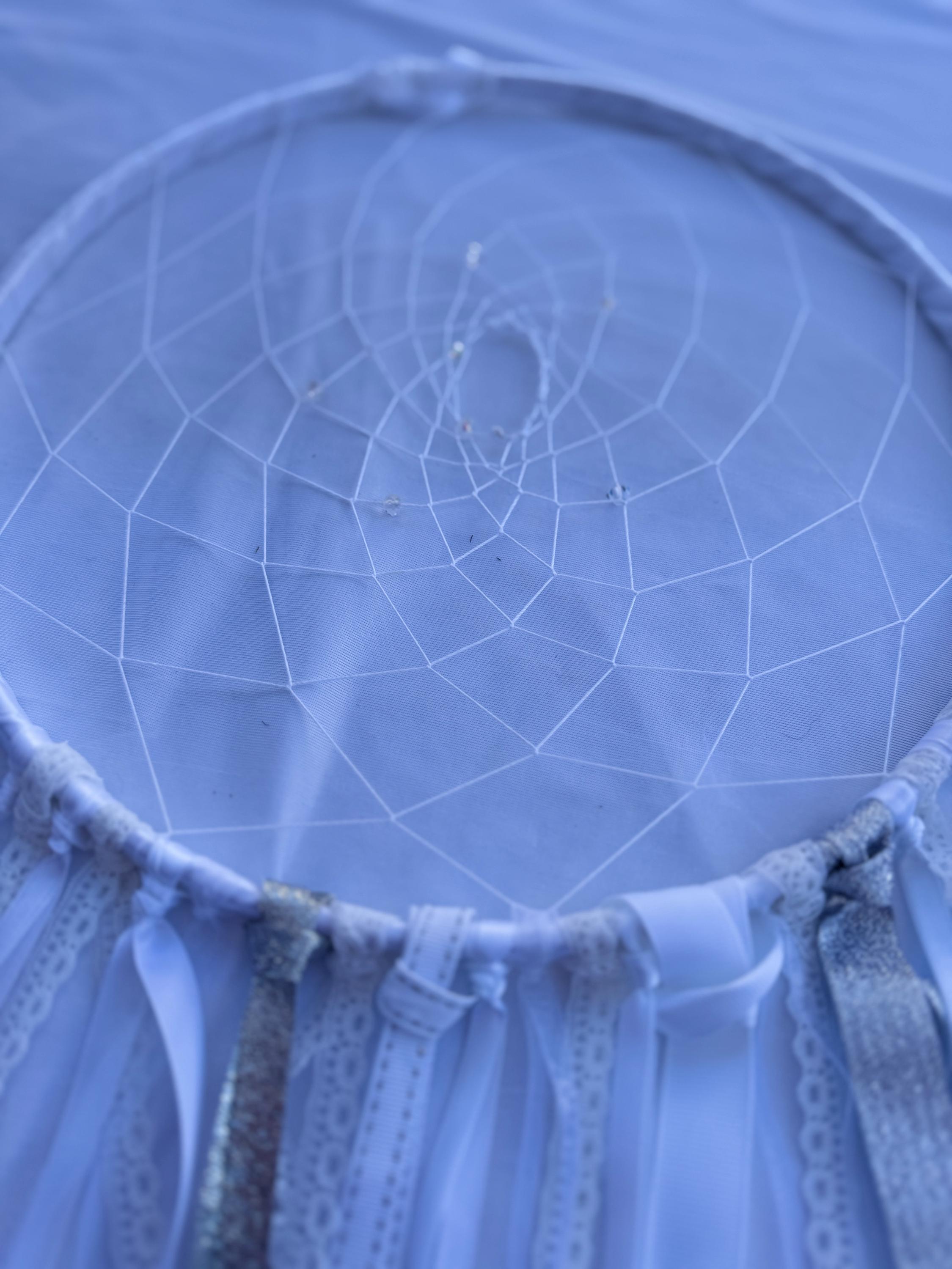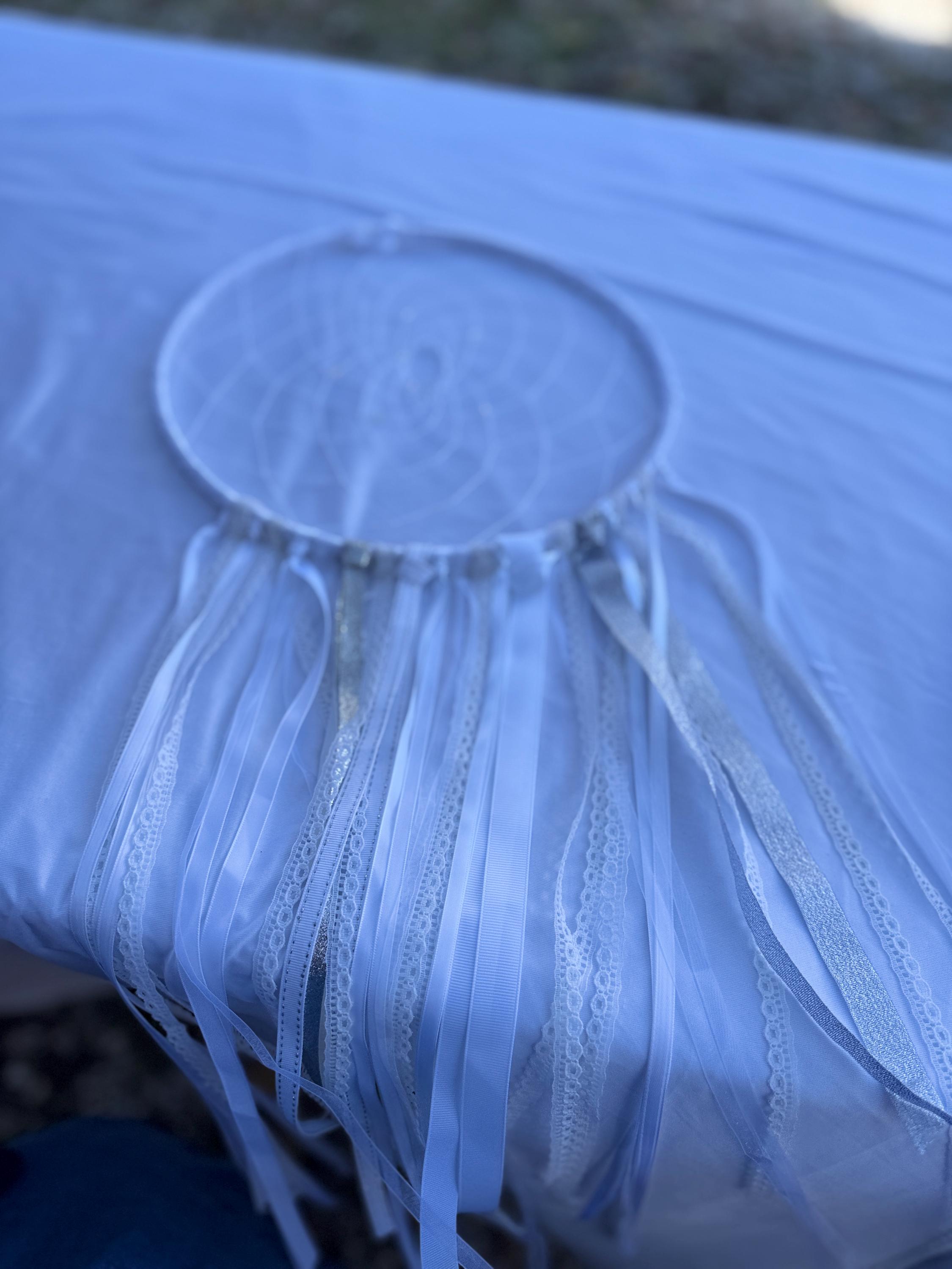 Dreamcatchers handmade with a 12x12 inch wooden ring covered in white satin ribbon. Both have various white and silver ribbons with various textures. One is made with white cotton webbing and the other is made with gray hemp cord. Each one has a various number of either clear or gray Austrian crystals in the webbing.