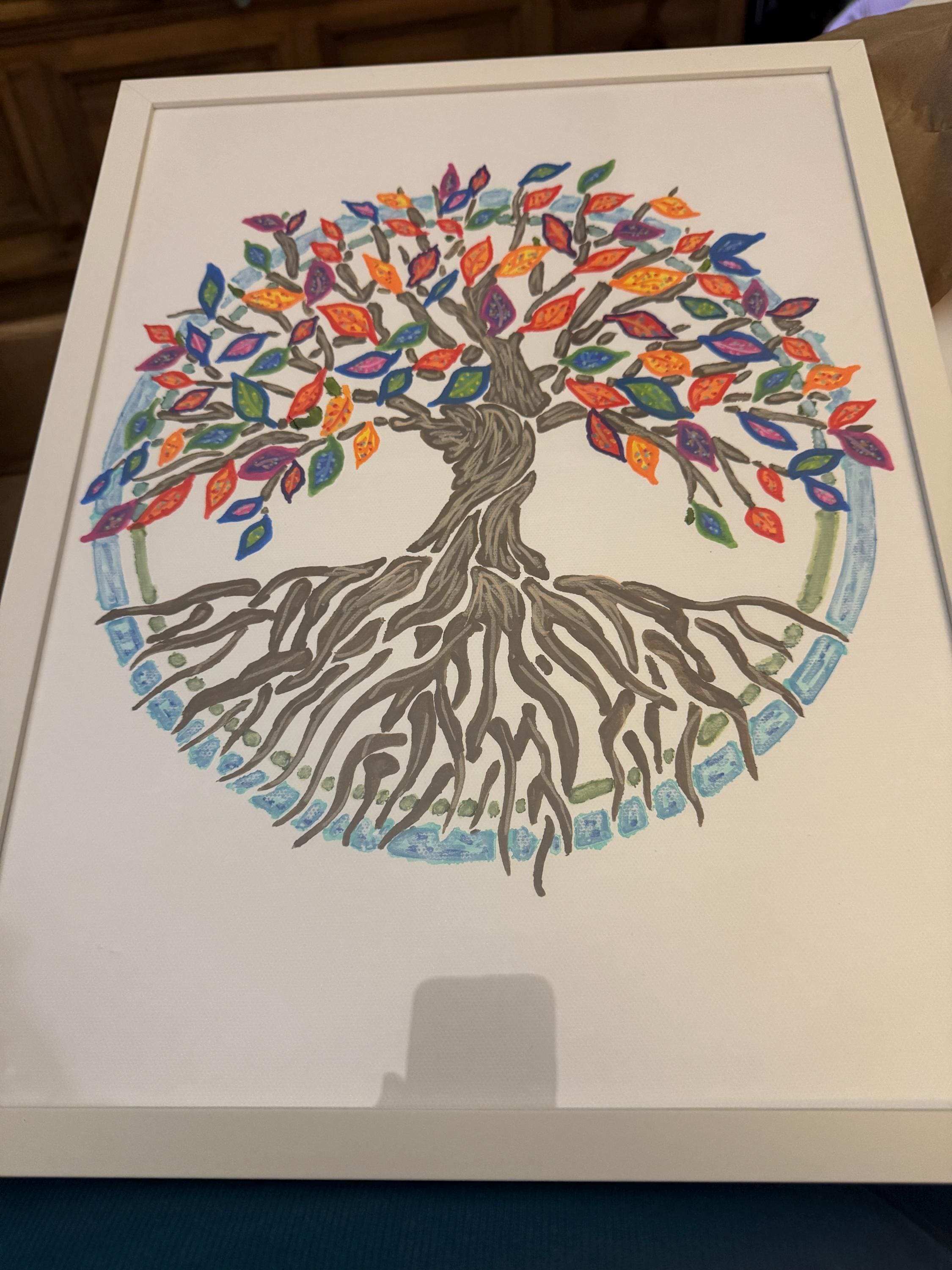 Acrylic Painting of colorful tree of life on 12x16 canvas, framed with plastic frame.