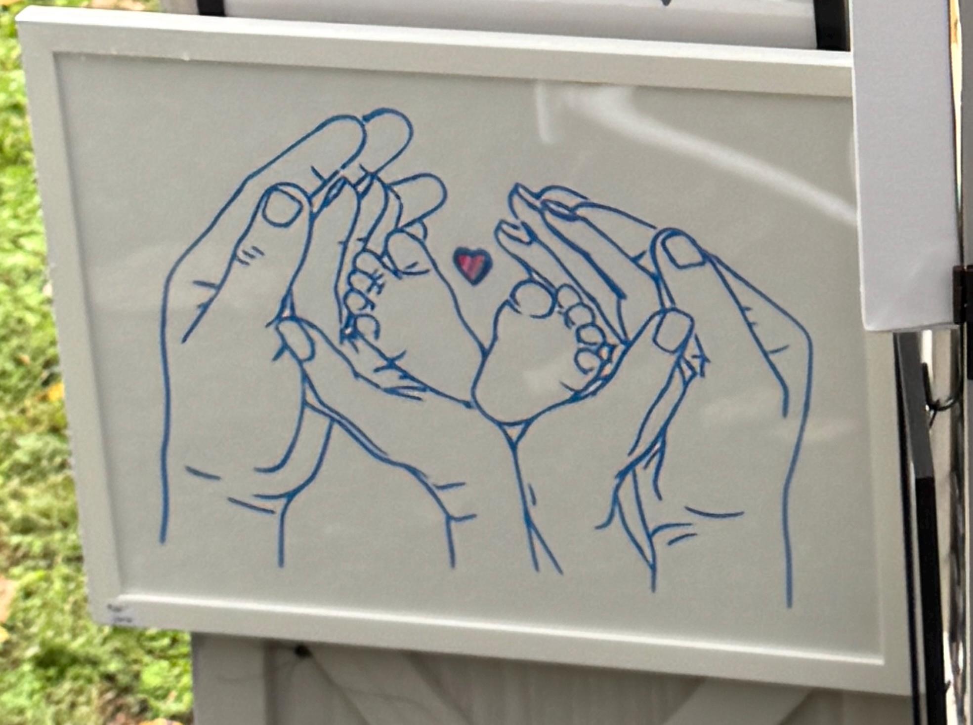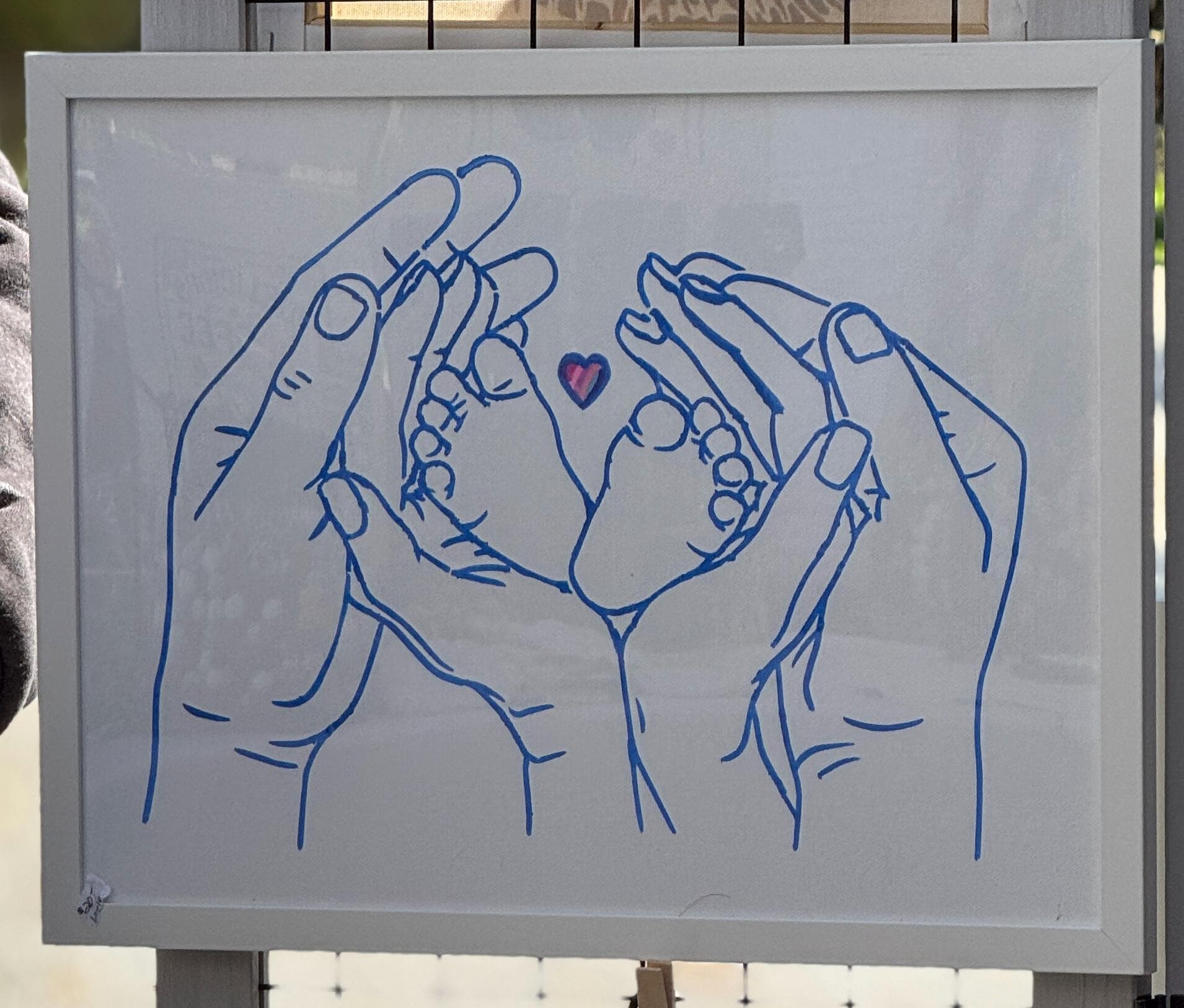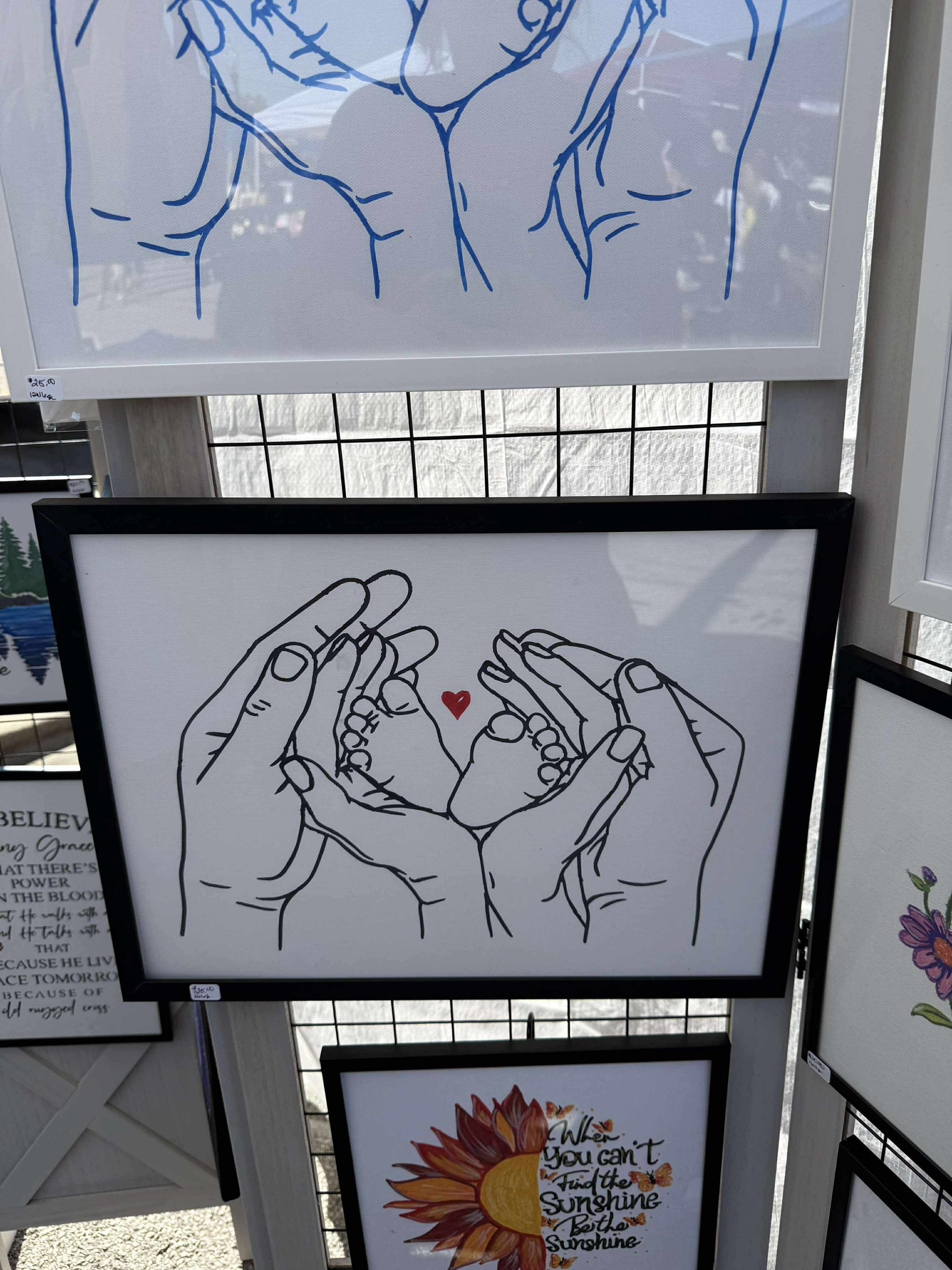 12x16 canvas board with acrylic paints. Two adult hands cradling baby feet with heart in middle. Two variations: 1) black and white with red heart framed in black frame; 2) blue and white variation with blue, pink and Purple Heart in middle framed in white frame.