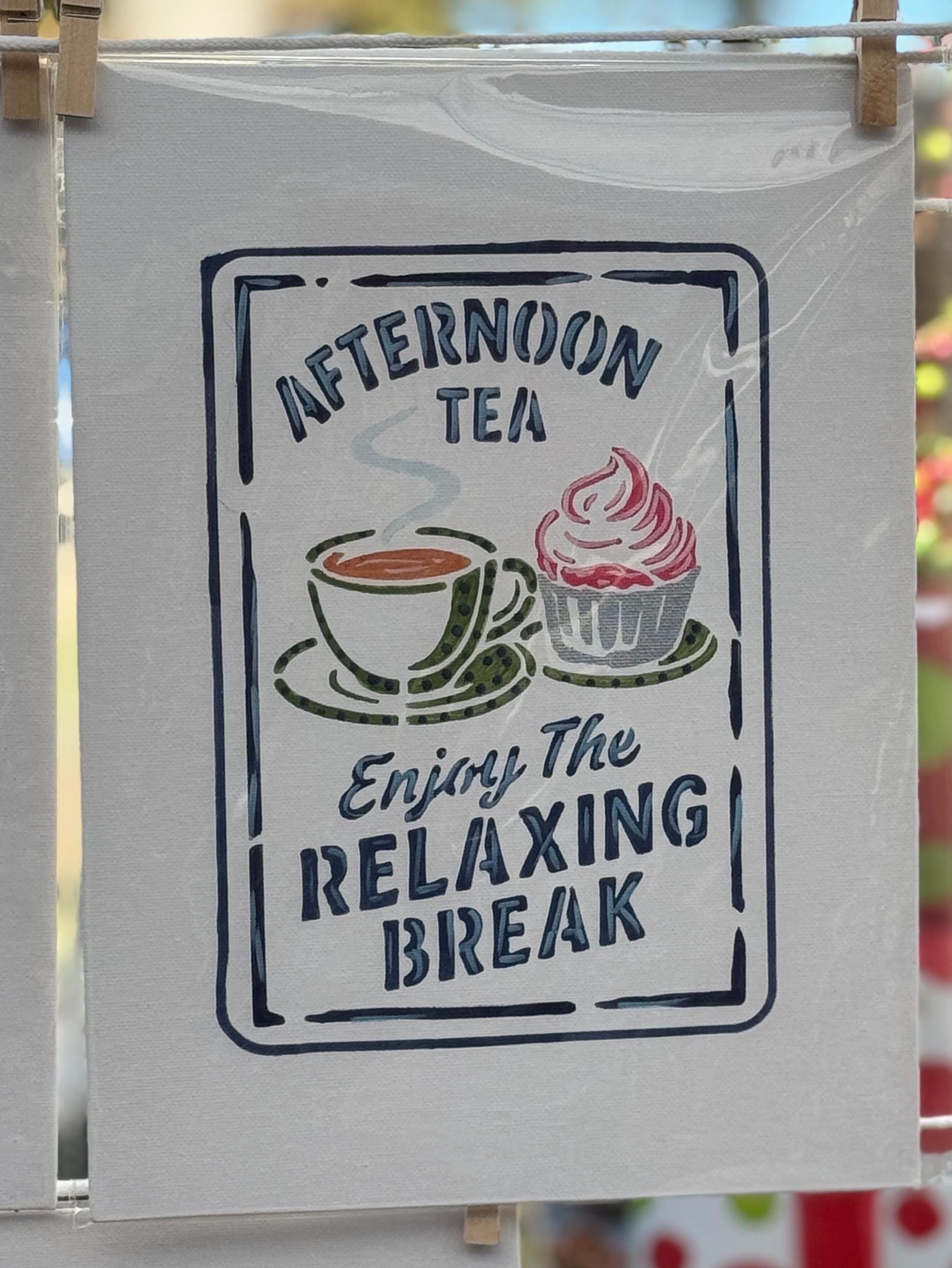 Acrylic painting on 9x12 canvas unframed with Tea Time theme - 2 variations to choose from. 1- colors pinks and greens with Roses, Teacup and Teapot that says Tea Time. 2- Tea cup and cupcake in colors of blue, green and pink which says Afternoon Tea Enjoy the Relaxing Break