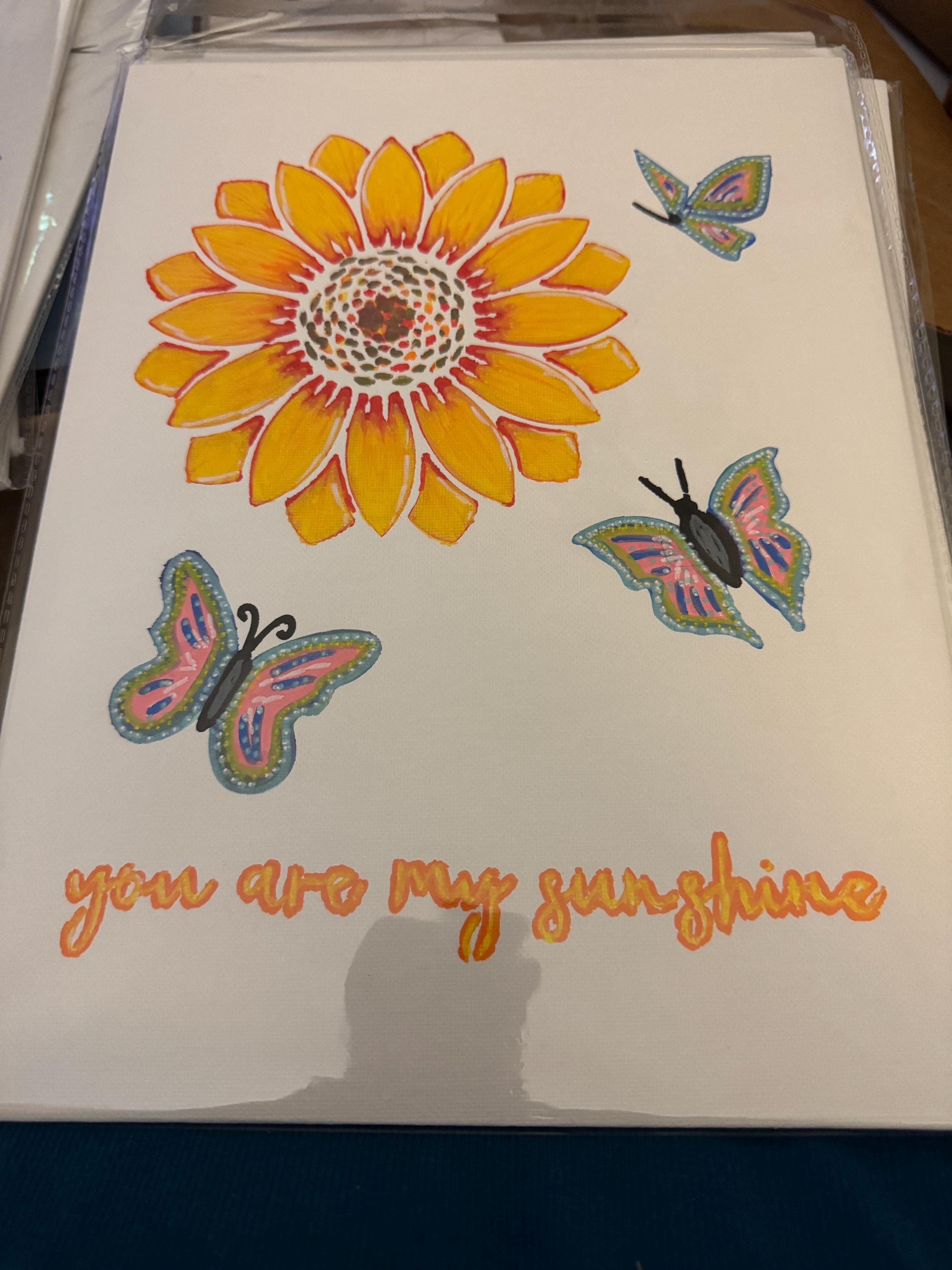 Acrylic paintings on 9x12 unframed canvas with theme of Sunflowers. 3 variations: 1- Sunflower with saying “you are my sunshine”, 2- Sunflower with butterflies with saying “You are my Sunshine”, and 3- Sunflower with saying “When you can’t find the sunshine be the sunshine.