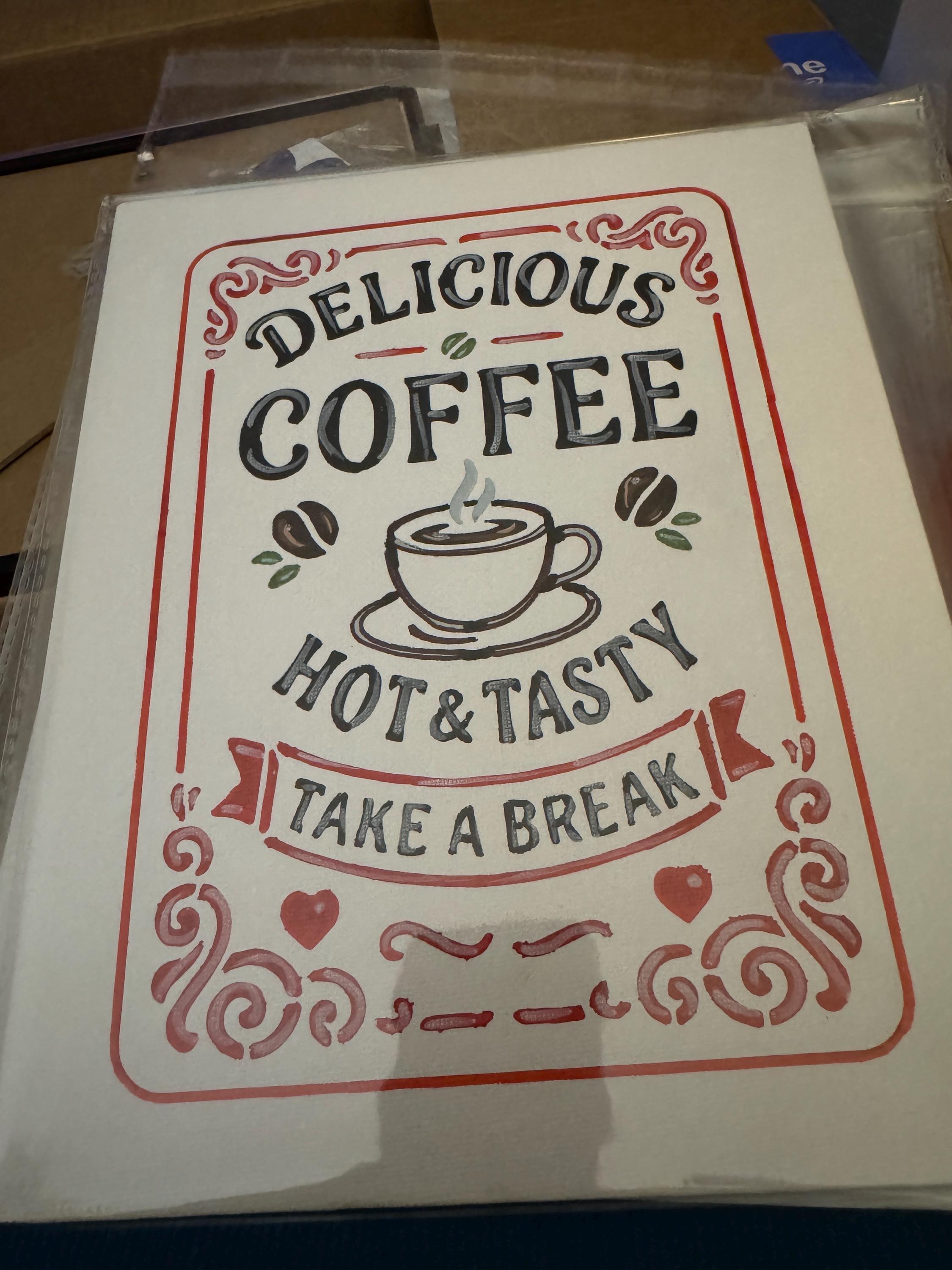 Acrylic paintings on 9x12 unframed canvas with theme and says “Hot Coffee”