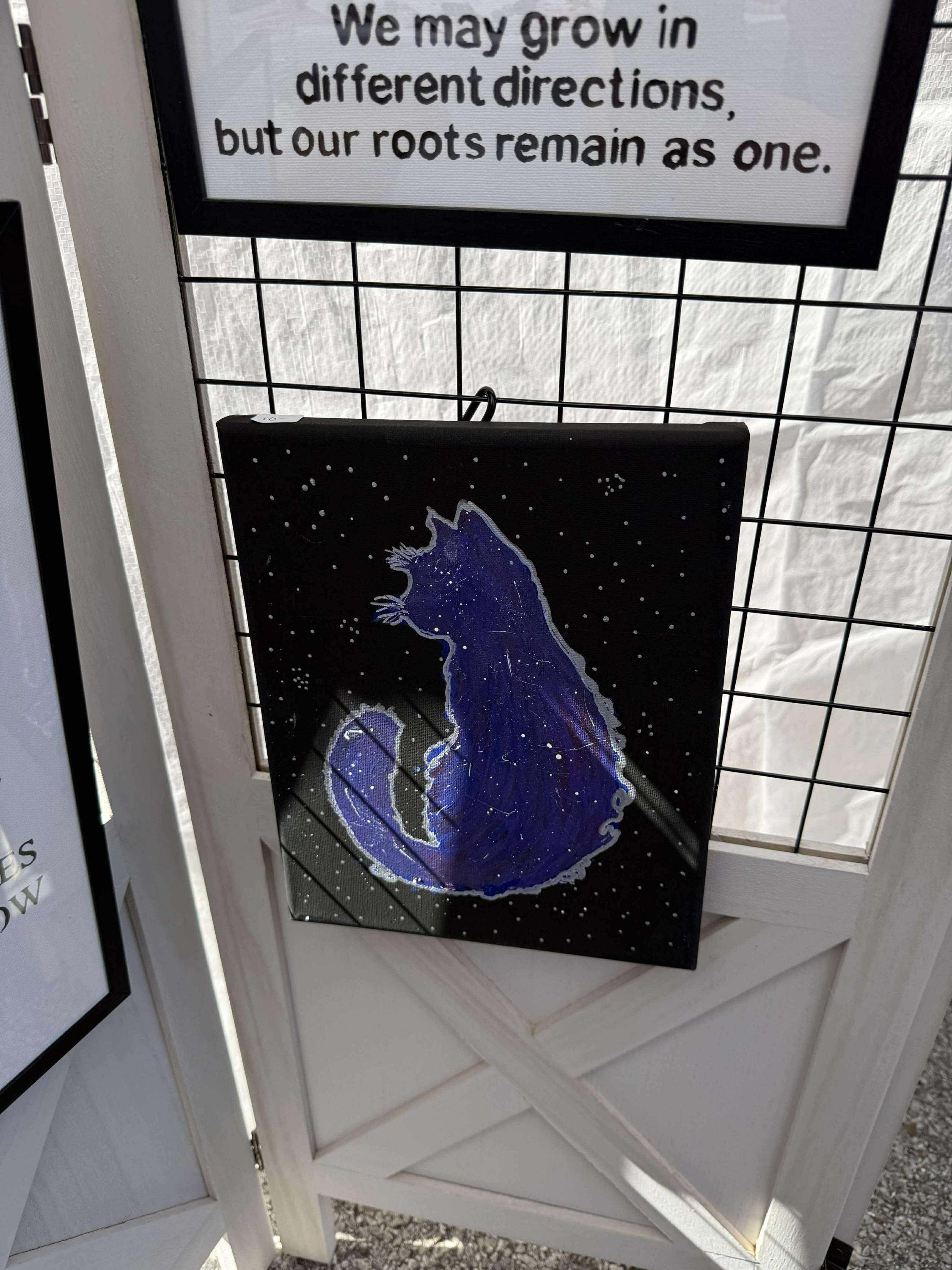 8x10 framed black canvas in acrylic paint depicts a cat and stars.
