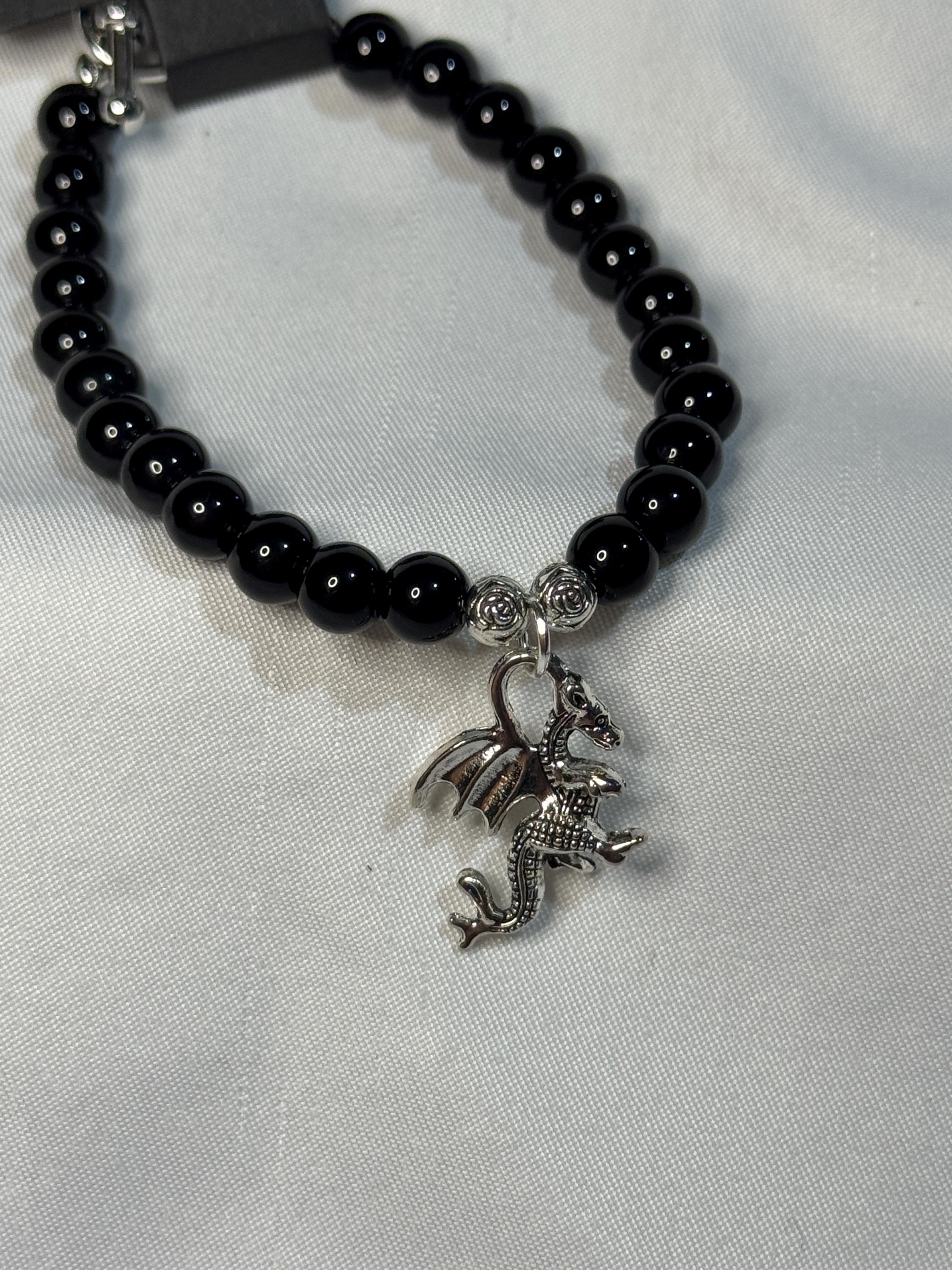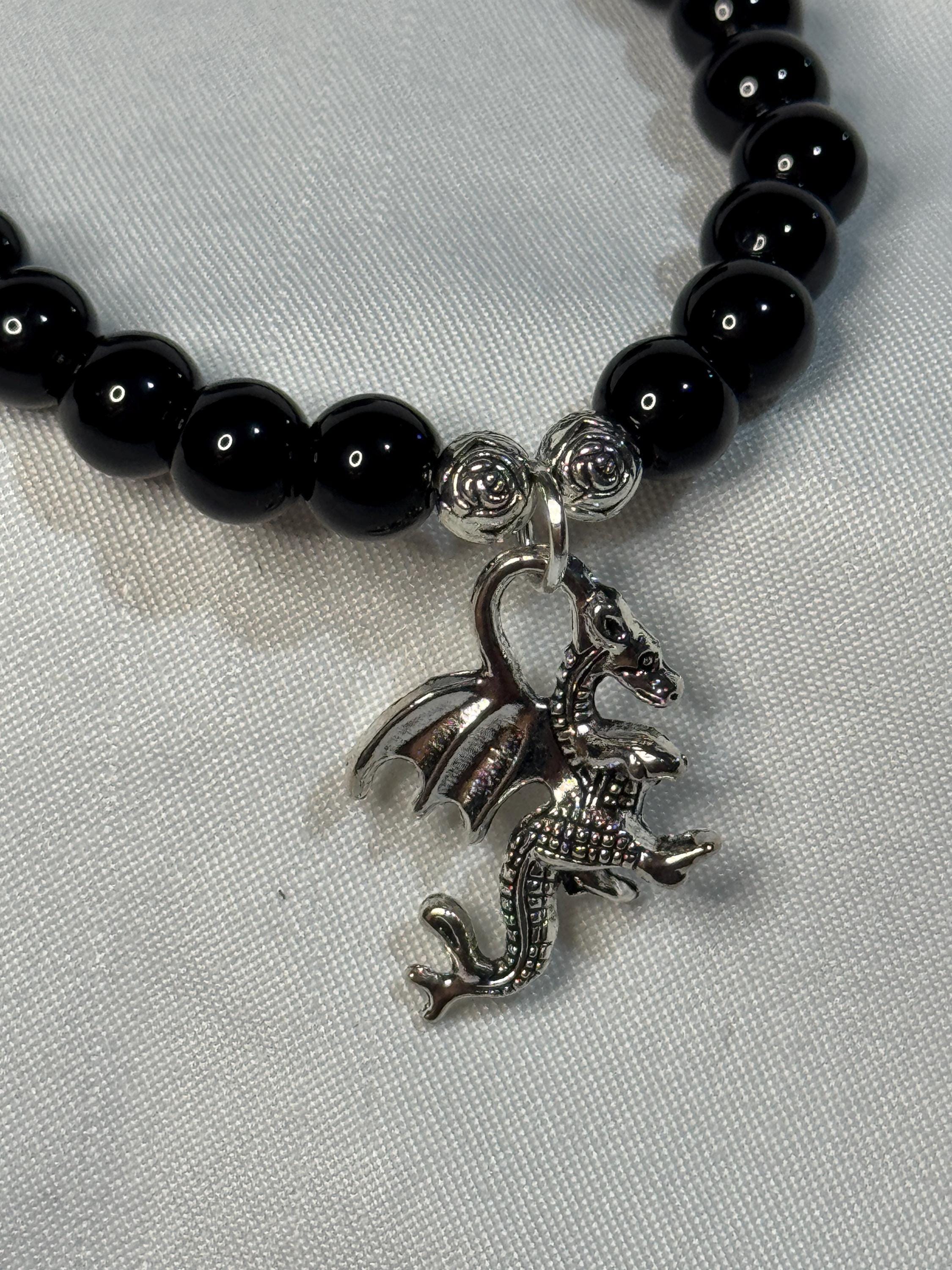 Natural 6 mm Black Agate Stone, with zinc alloy rose spacers and dragon charm. Zinc alloy closures. Handmade with love.