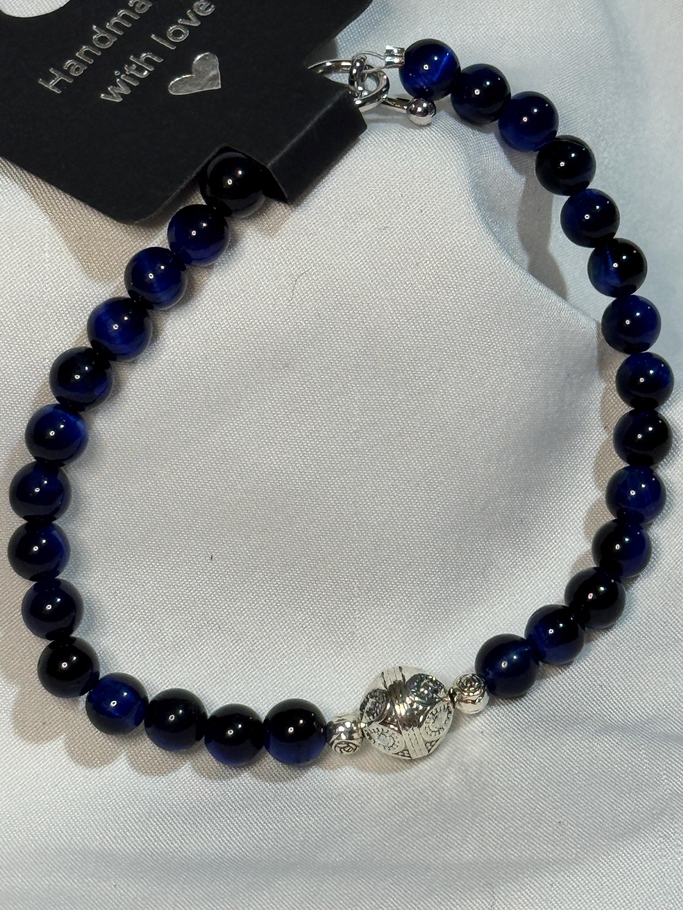 Natural 6 mm Blue Tiger Eye Rose Stone beads with zinc alloy rose bead spacers and 8 mm bead. Zinc alloy closures. Handmade with love.