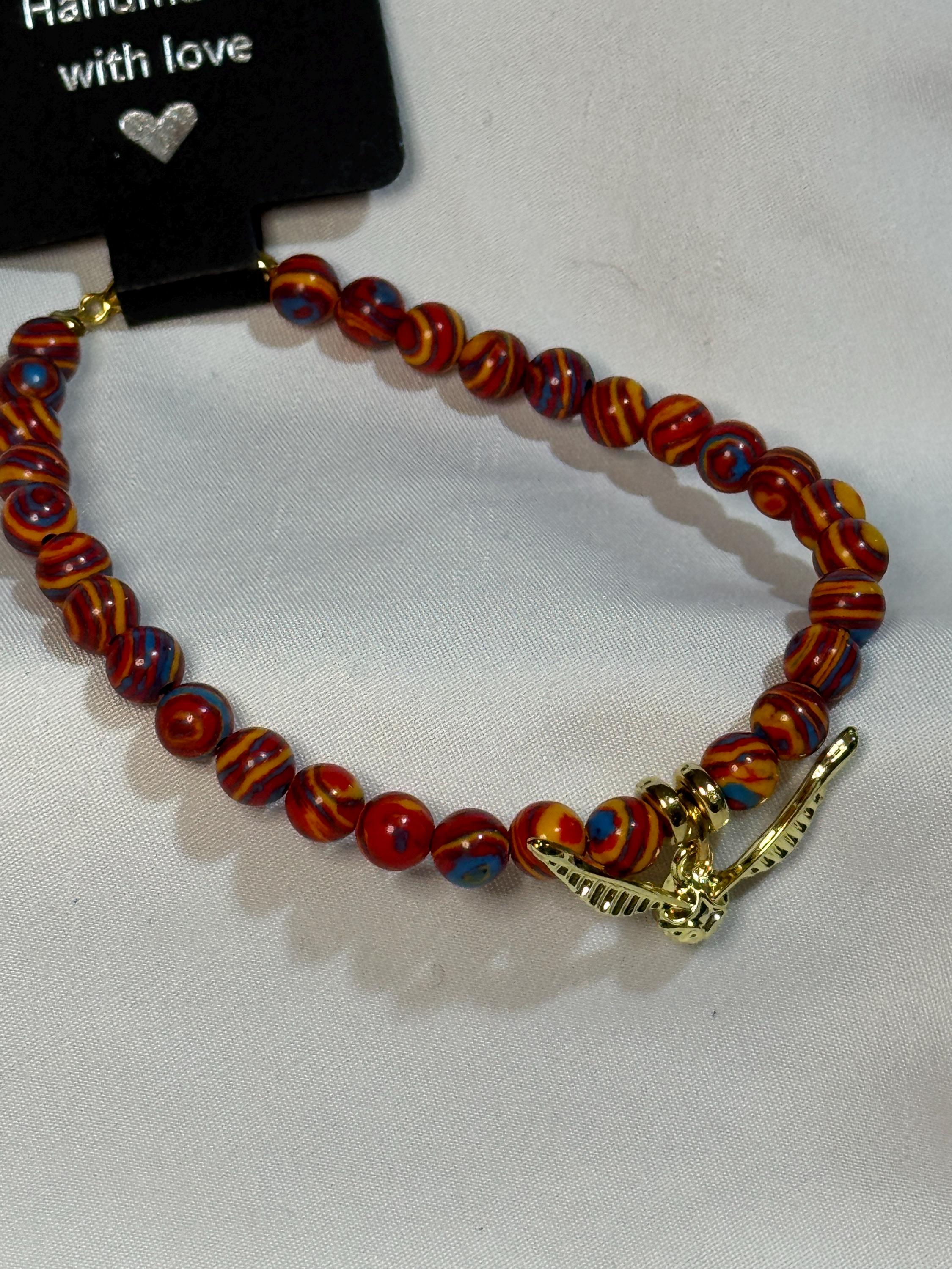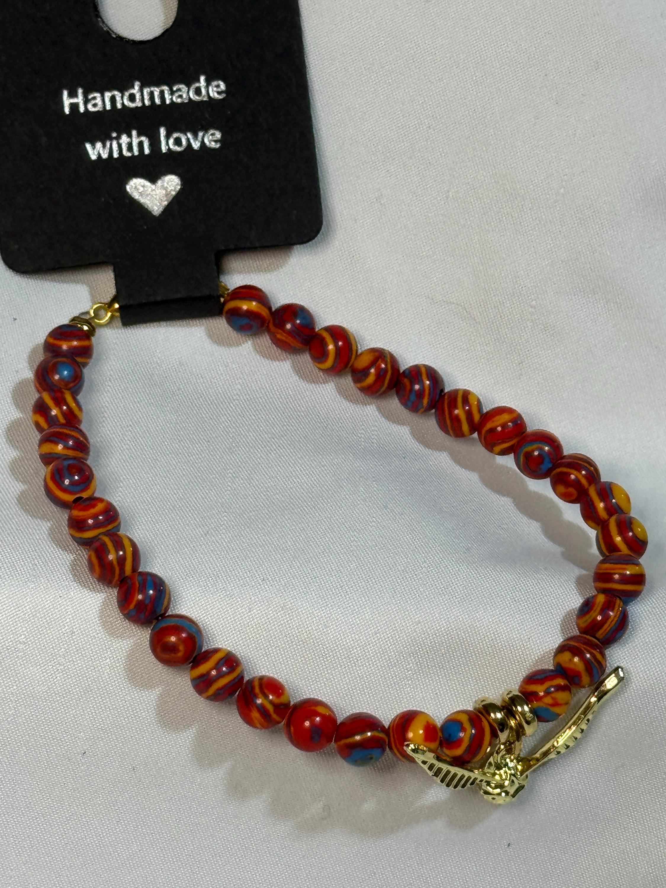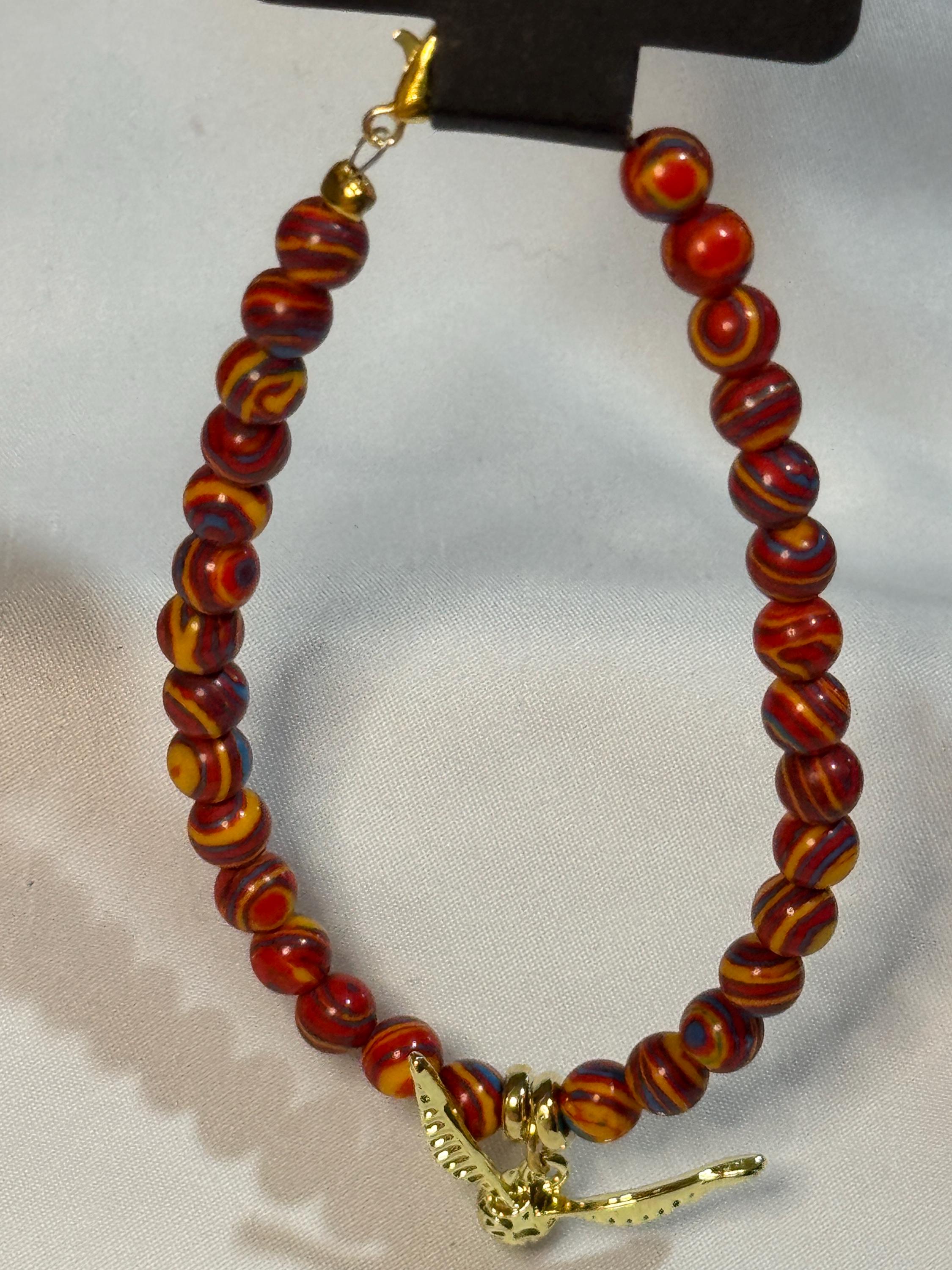 Natural 6 mm Red Malachite Stone beads, with gold plated zinc alloy spacers and golden snitch charm. Harry Potter theme. Gold plated Zinc alloy closures. Handmade with love.