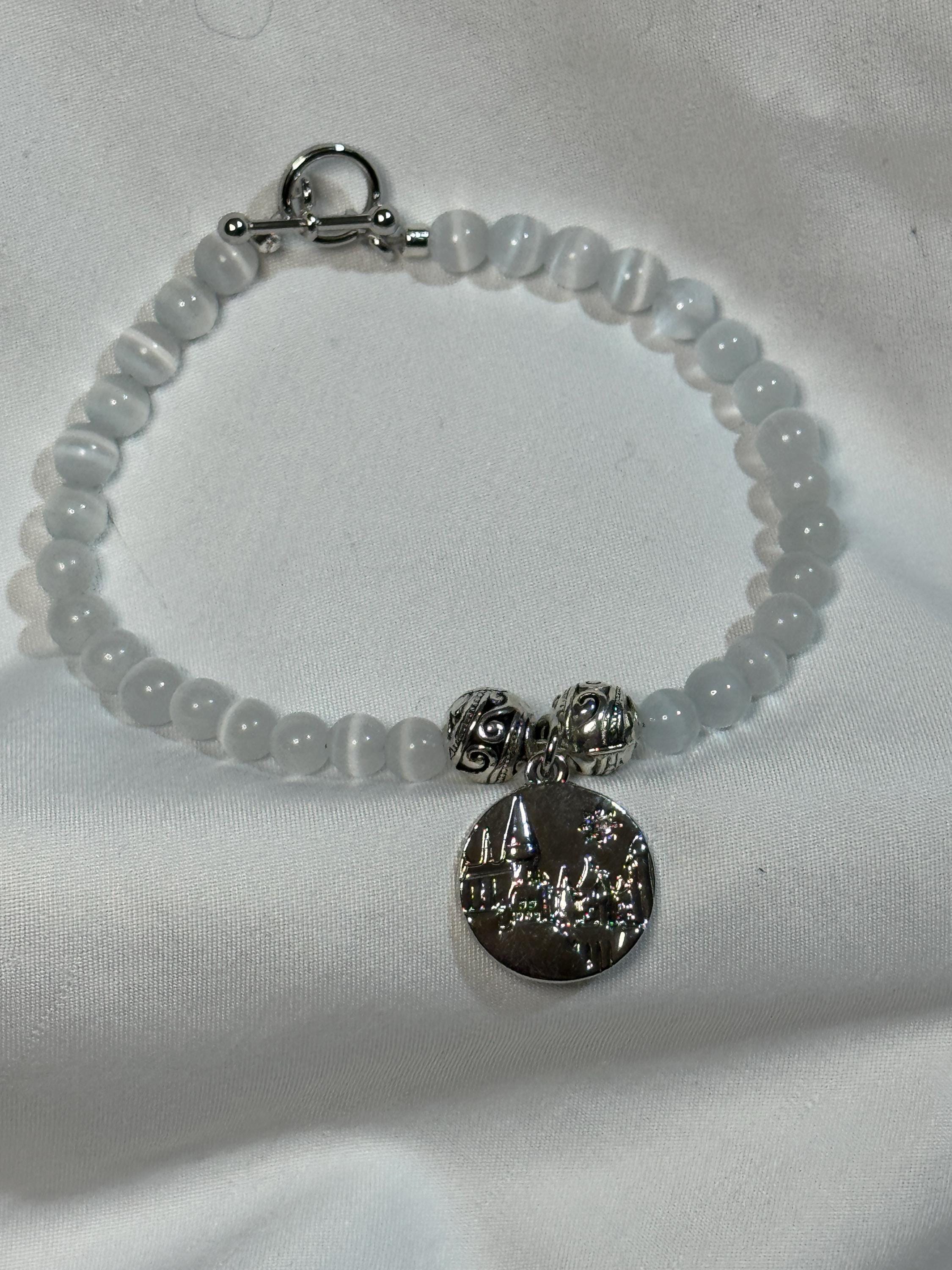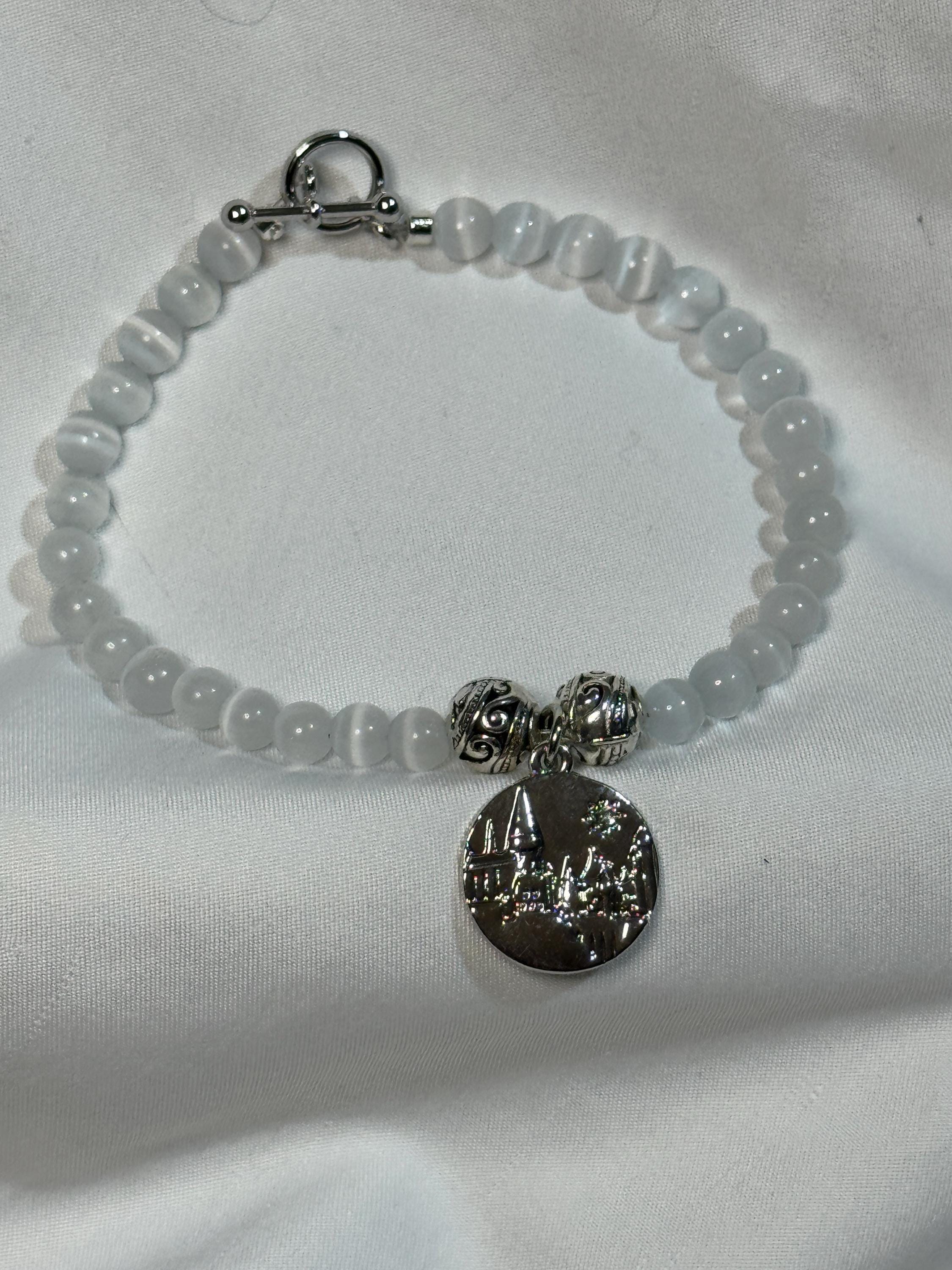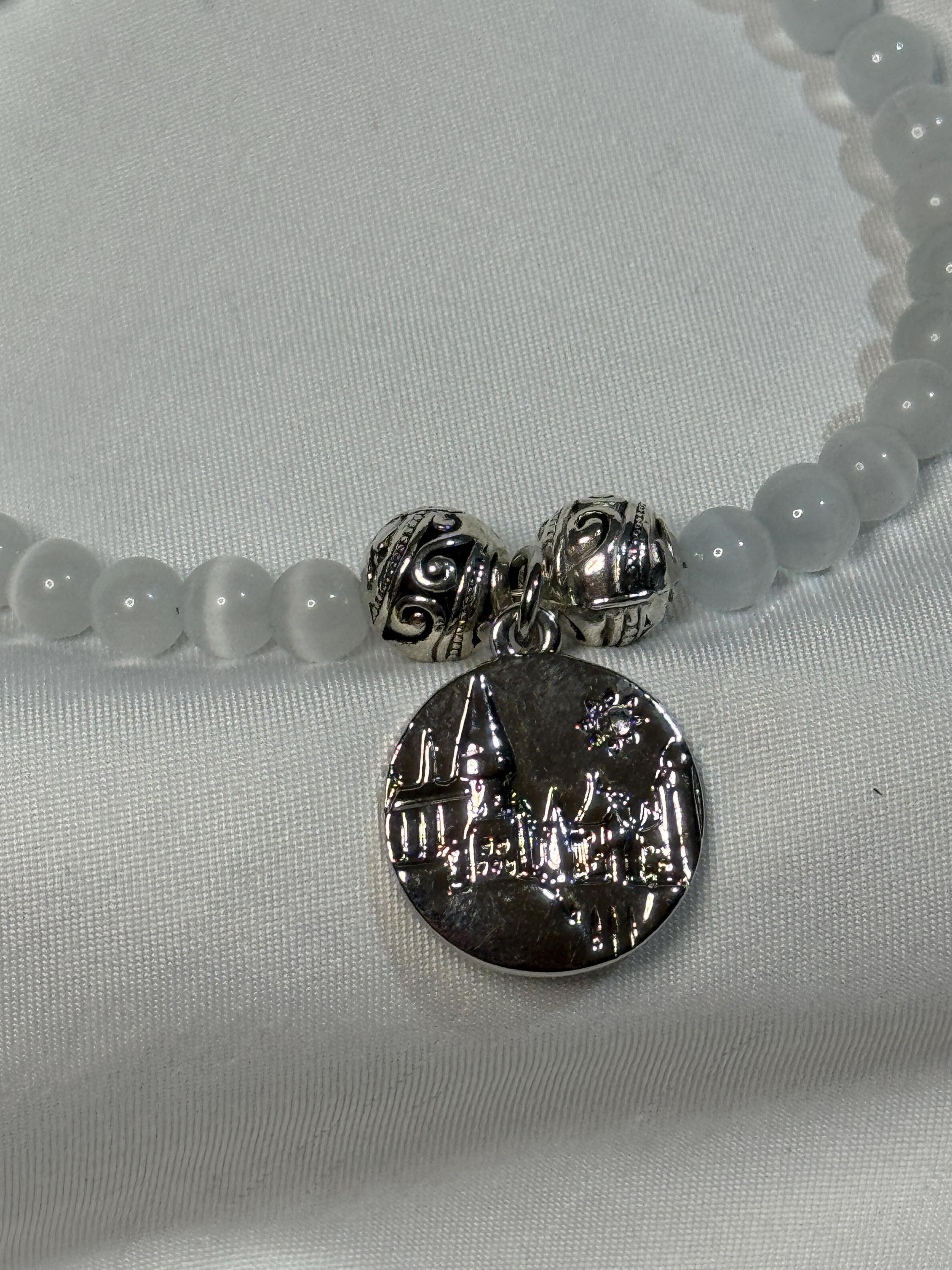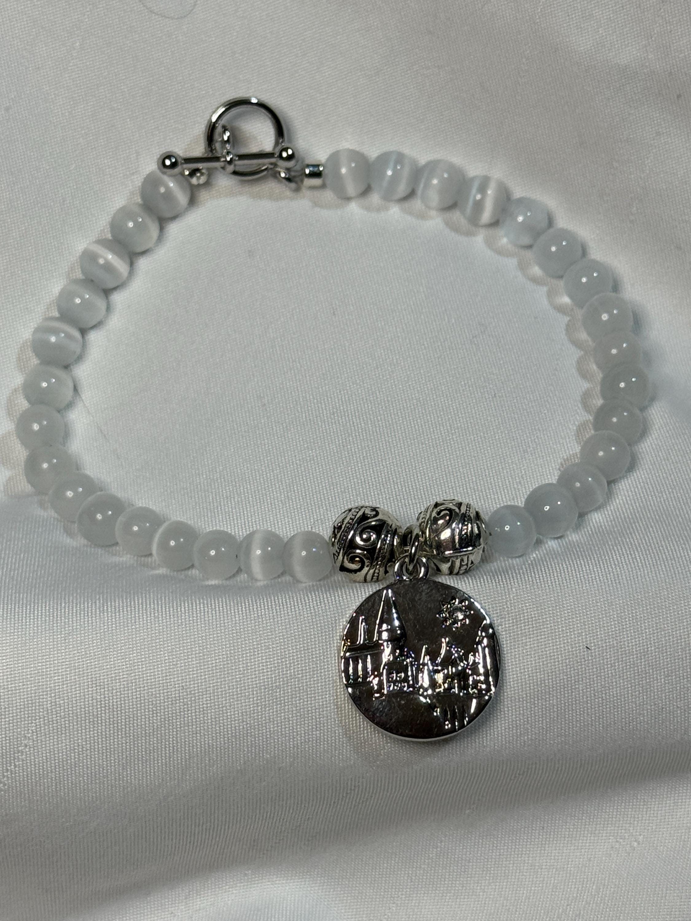 Natural 6 mm MoonStone beads, with zinc 8 mm alloy beads and Hogwarts charm. Harry Potter theme. Zinc alloy closures. Handmade with love.