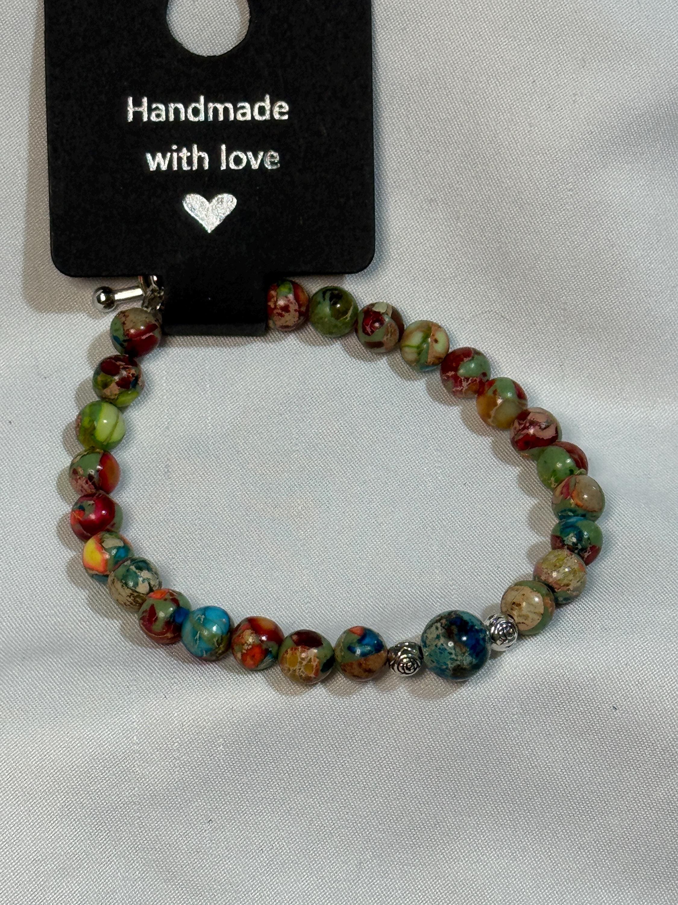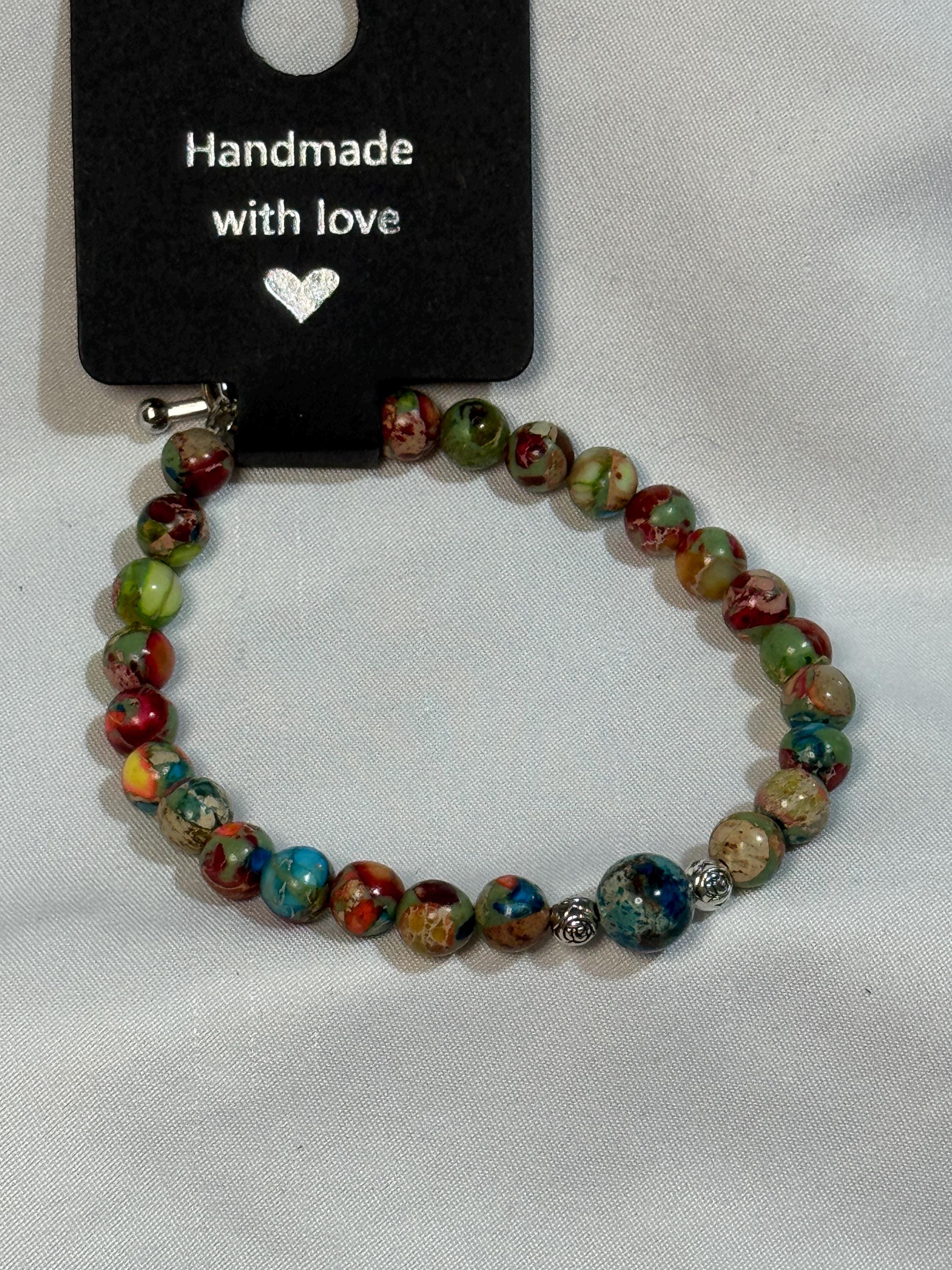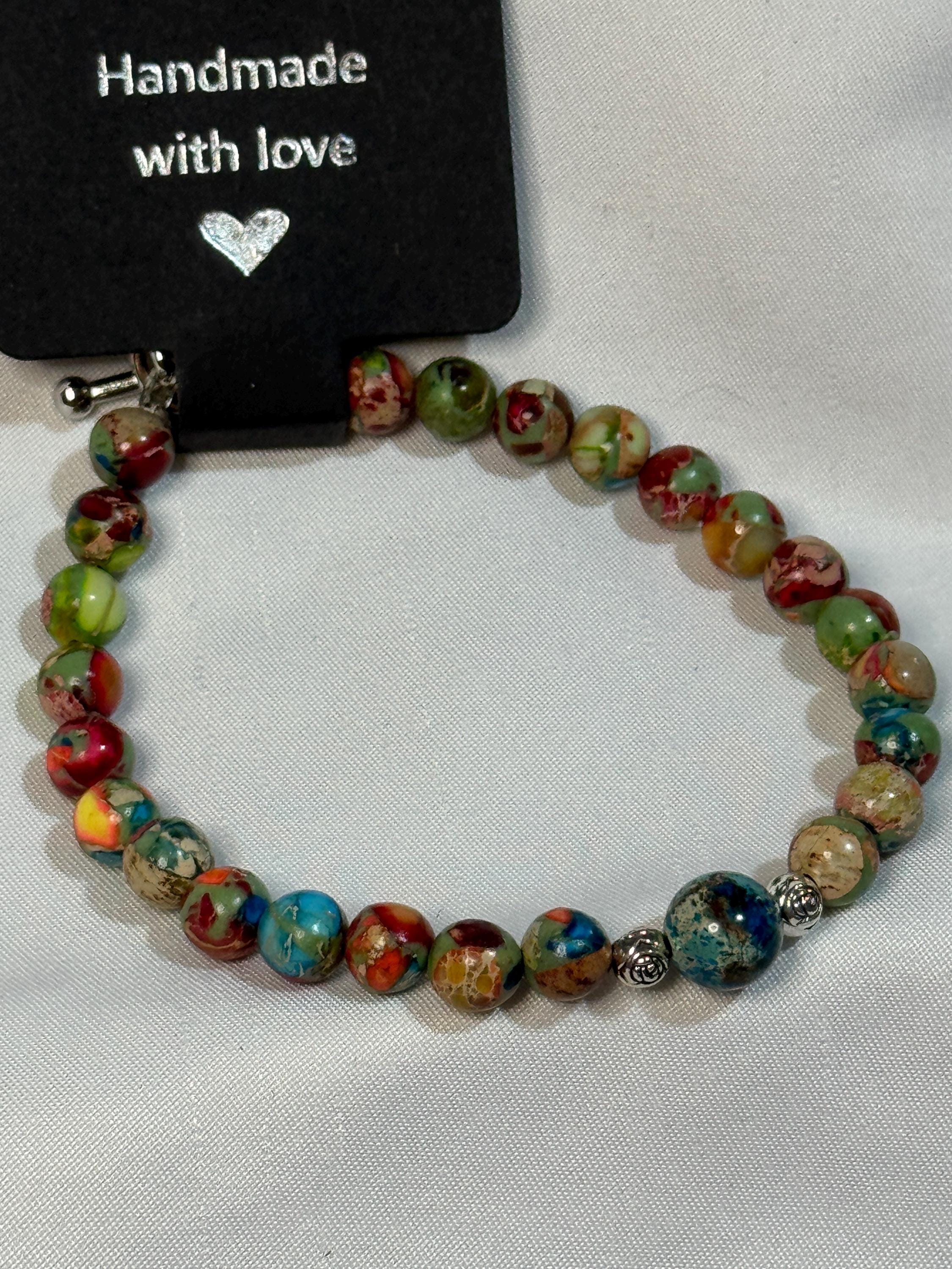 Natural stone 6mm and 8mm Sea Sediment Jasper with zinc alloy rose spacer beads. Zinc alloy closures, toggle closure . Handmade with love.