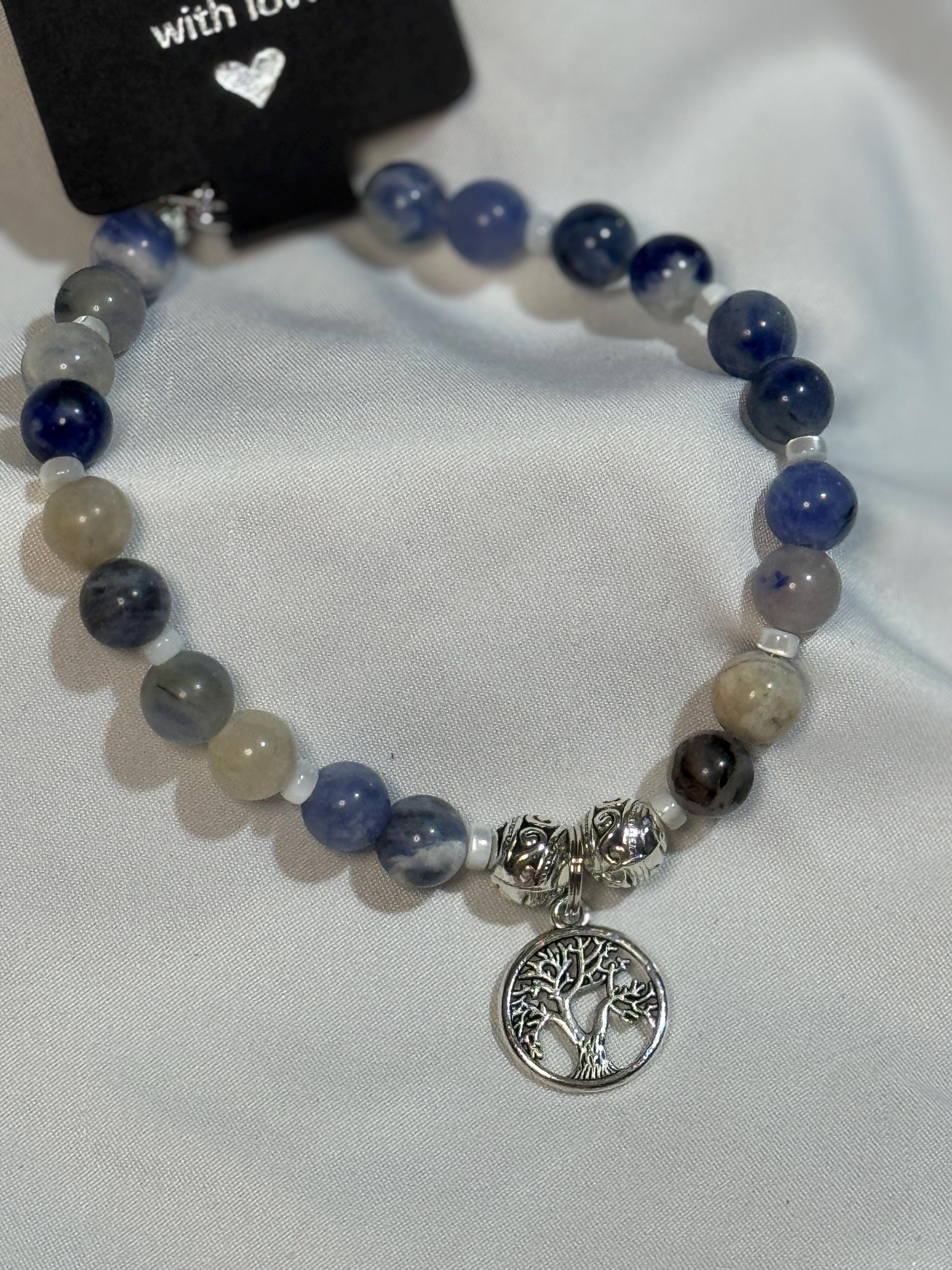 Natural 8 mm Blue Sodalite Stone beads with shell spacer beads and zinc alloy beads and tree of life charm. Zinc alloy closures. Handmade with love.