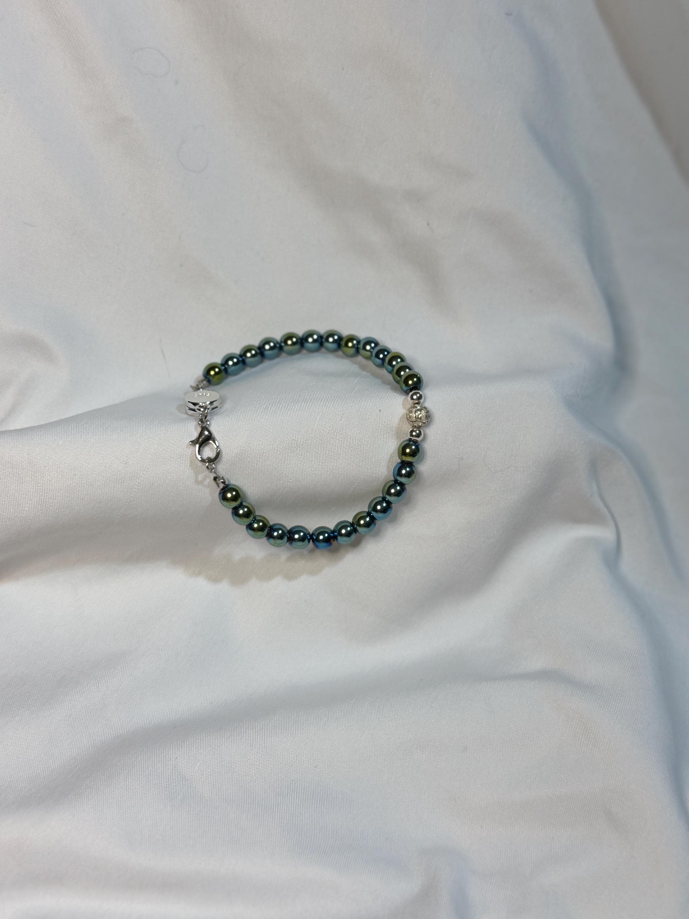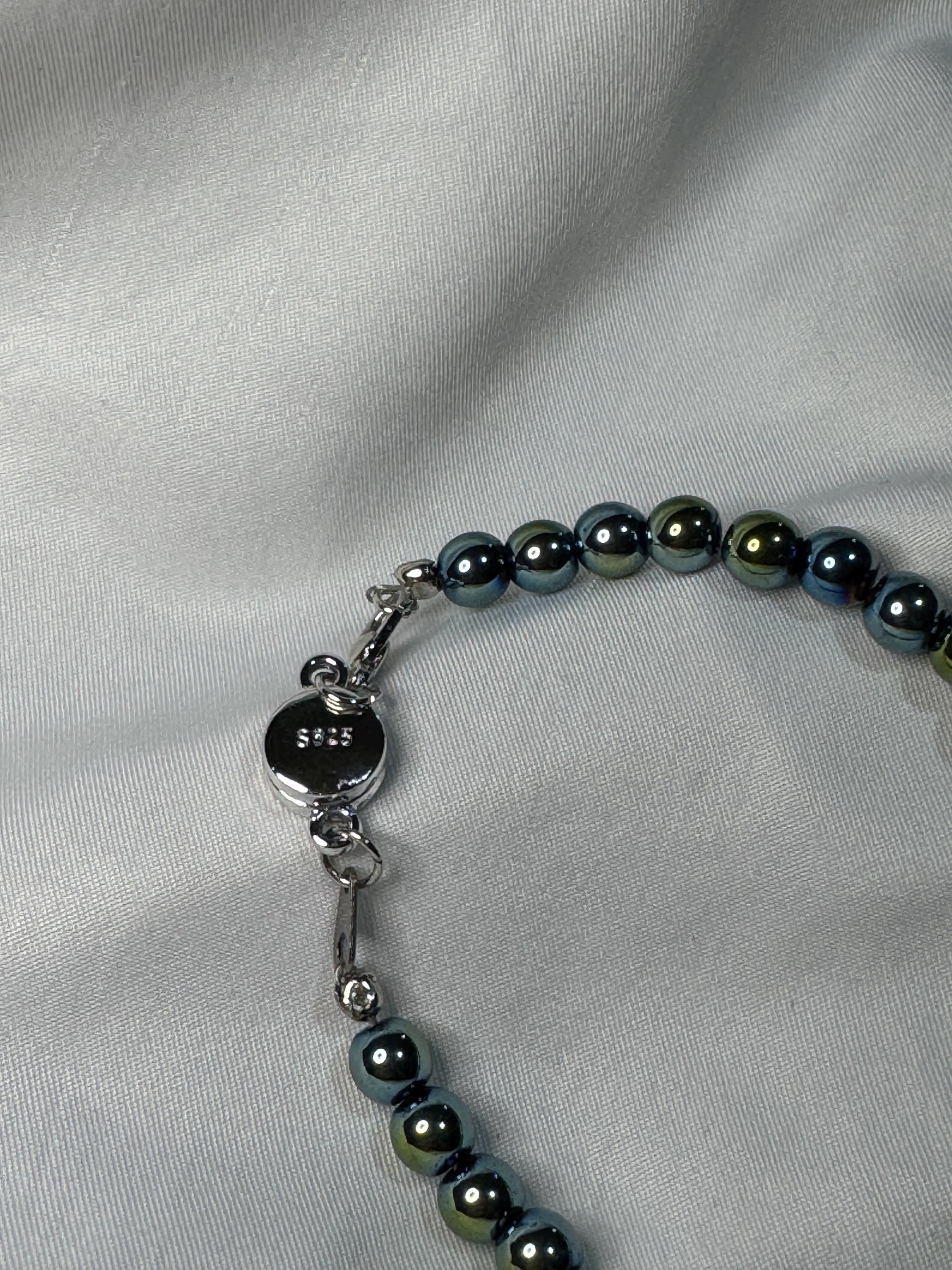 Bracelet- 6mm clear Green Hematite beads with 2 zinc alloy spacers and a 6mm sterling silver bead bracelet. Sterling silver closure.