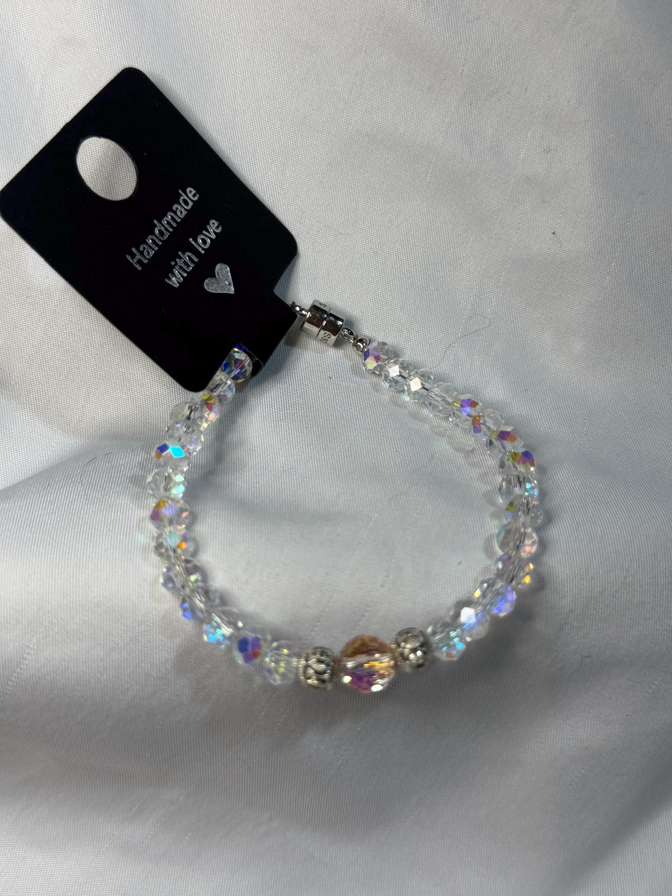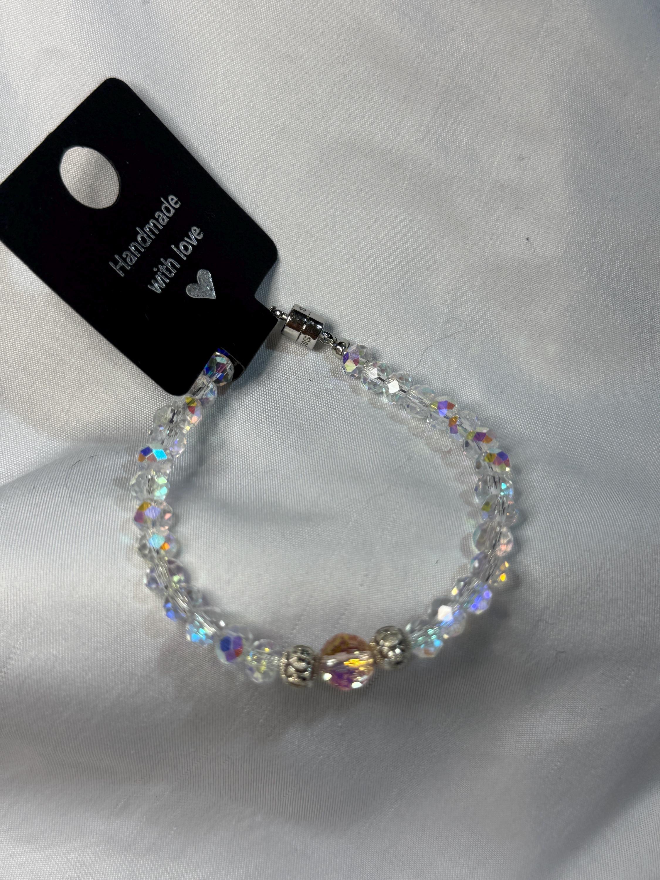 Bracelet- 6mm clear Austrian Crystal beads with 1 gray or pink Austrian crystal bead with 2 - 6mm sterling silver beads bracelet. Sterling silver closure.