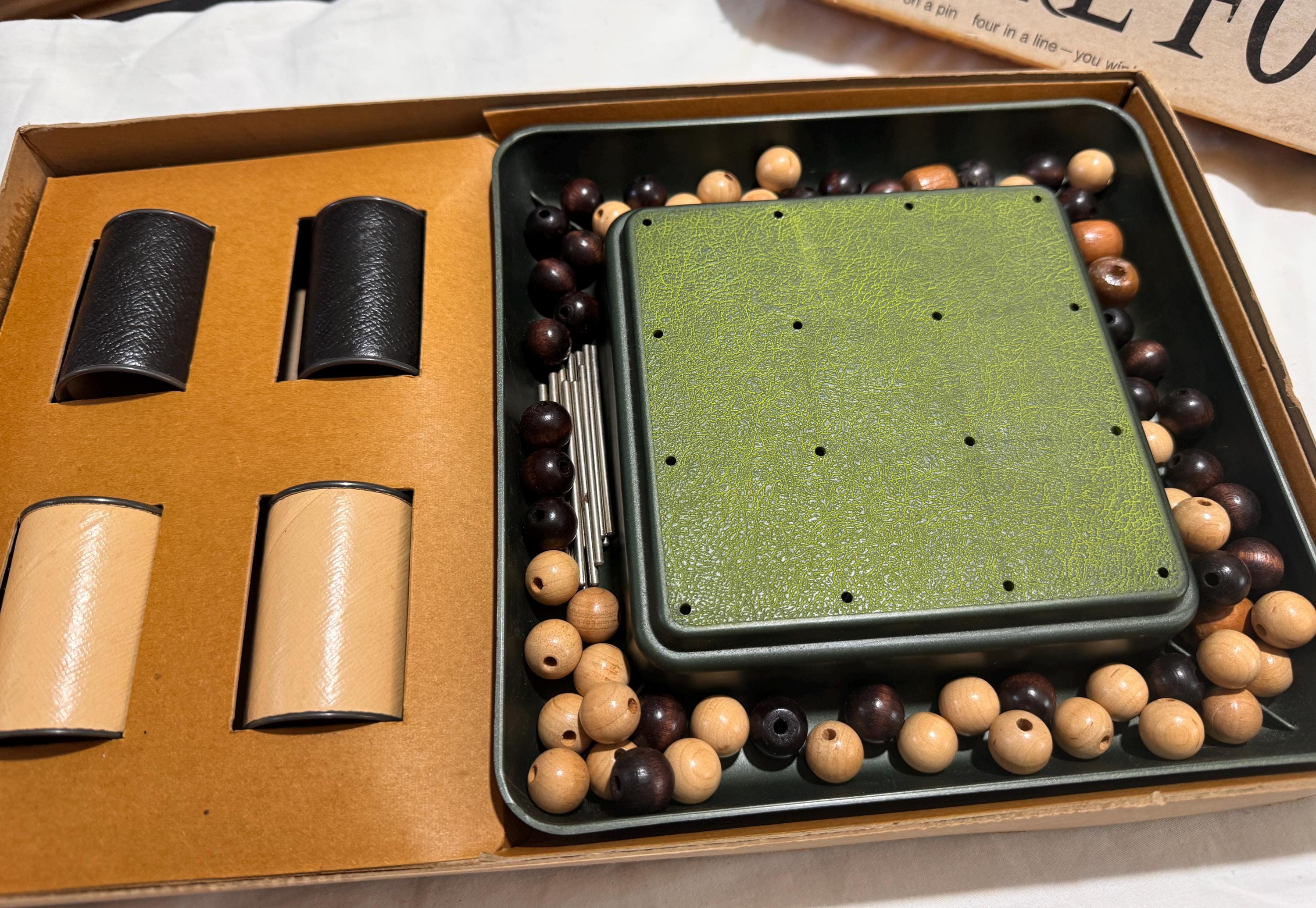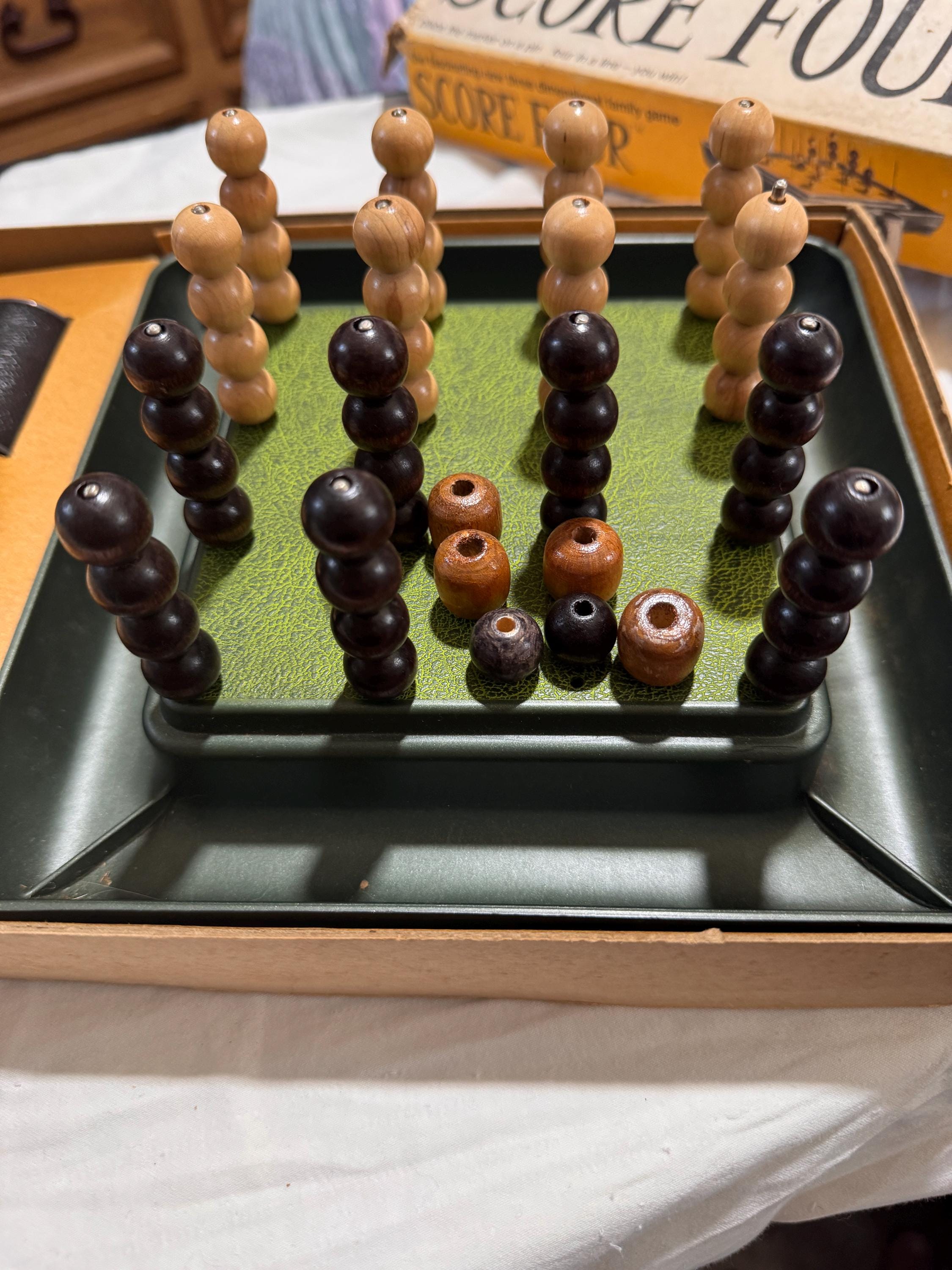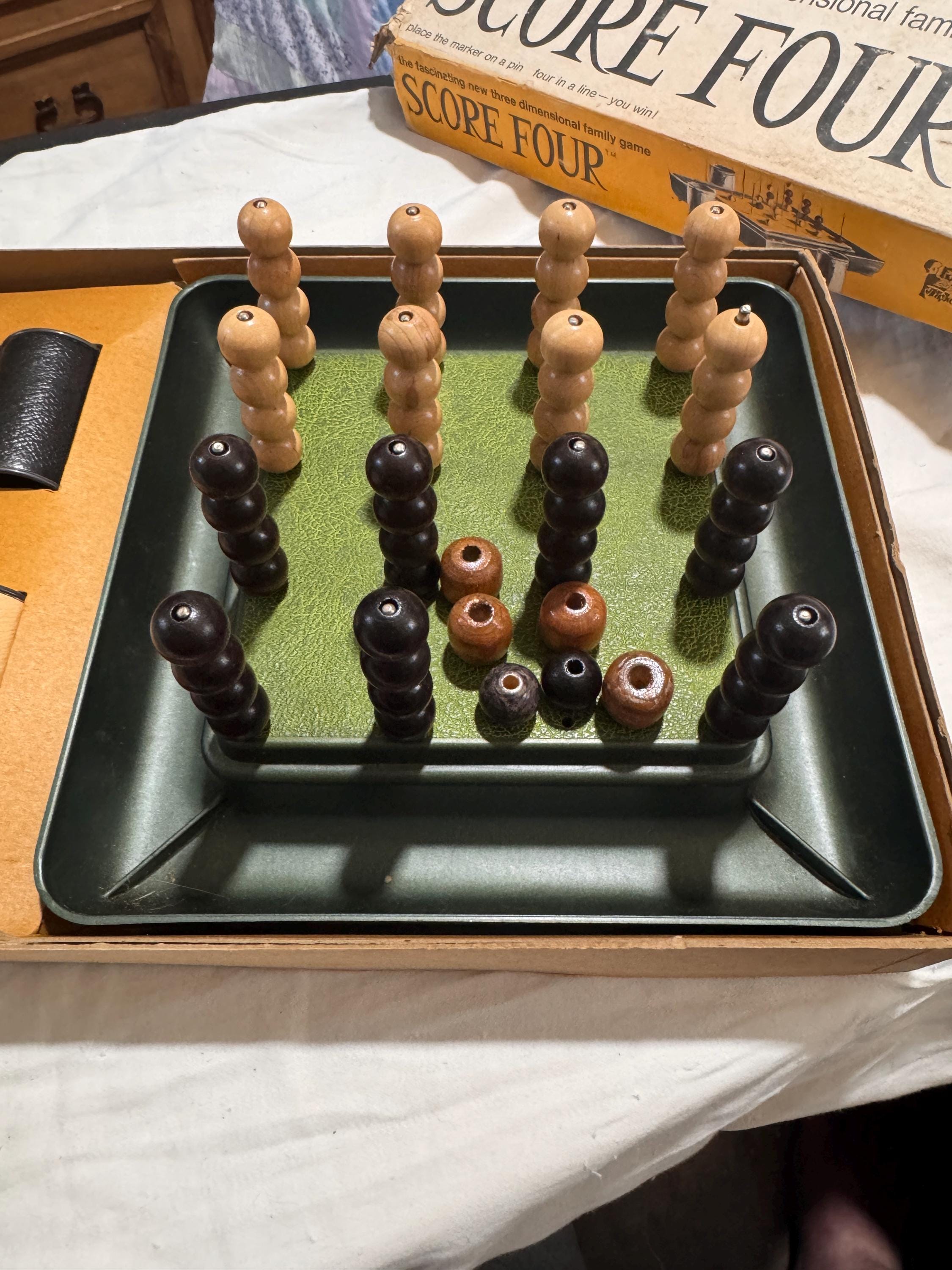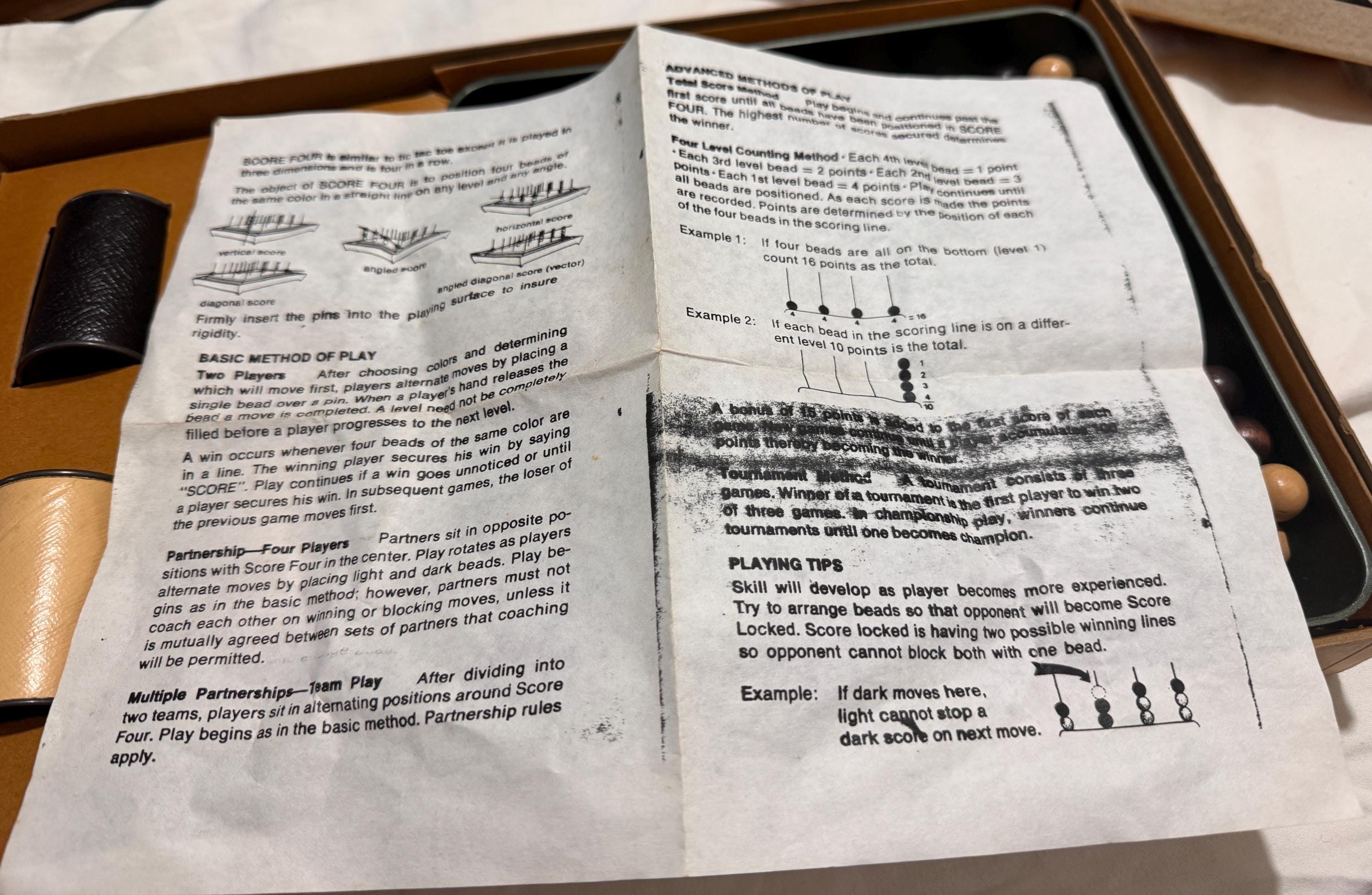 Vintage SCORE FOUR game from the 1970’s. It belonged to my parents. It has been sitting in a closet. It is missing one peg. It is a strategy game. Minimum 2 player game up to 4 people. Dusty, box in fair condition. Has instructions that looked printed off, but may be what came with the game, as the paper is thin feeling. Images show all the pieces that are there.