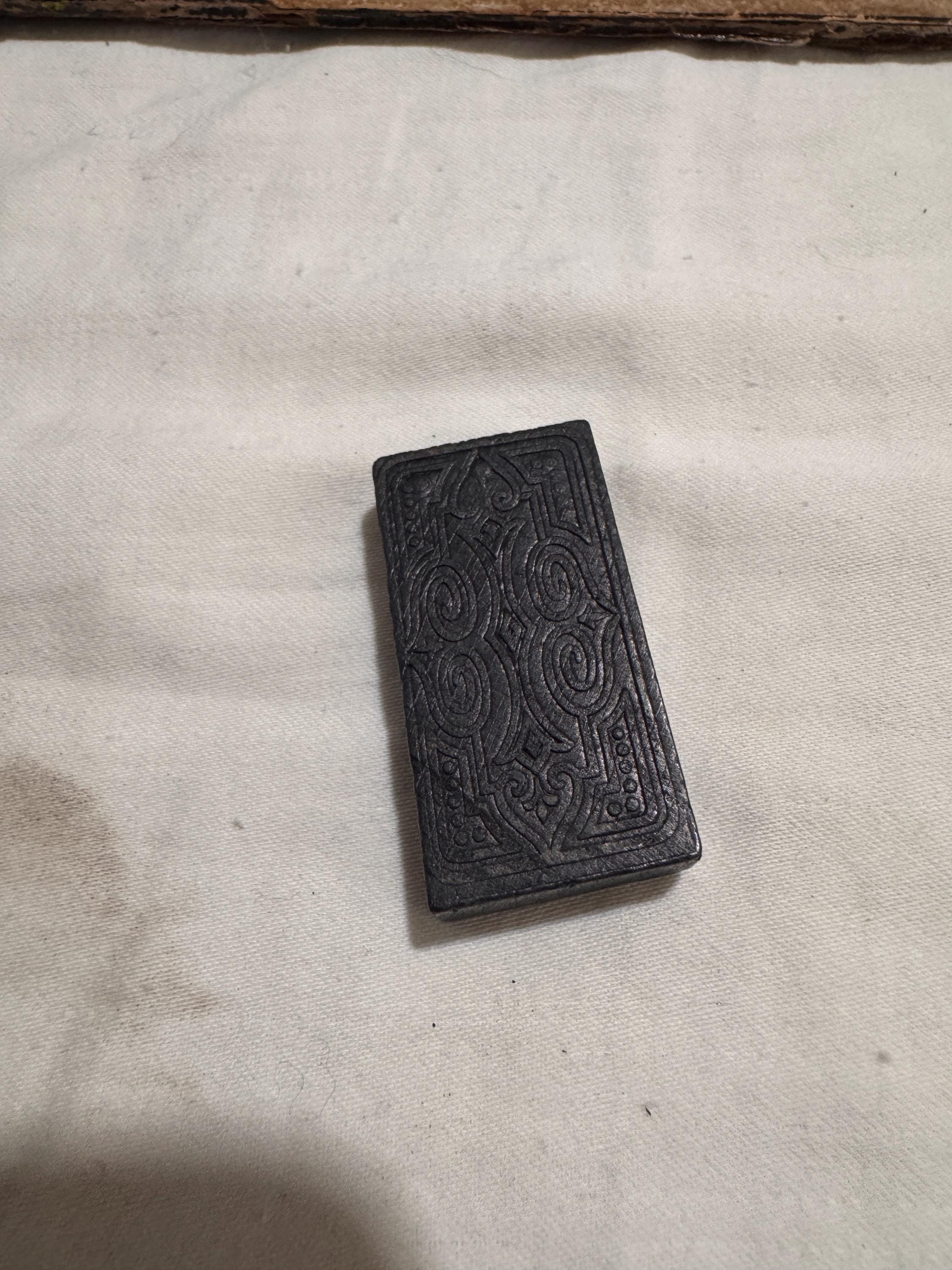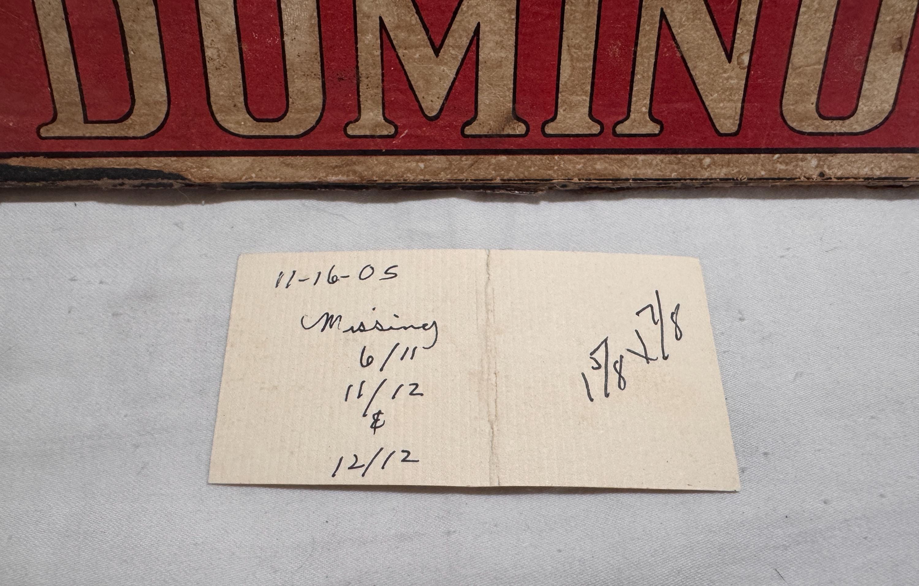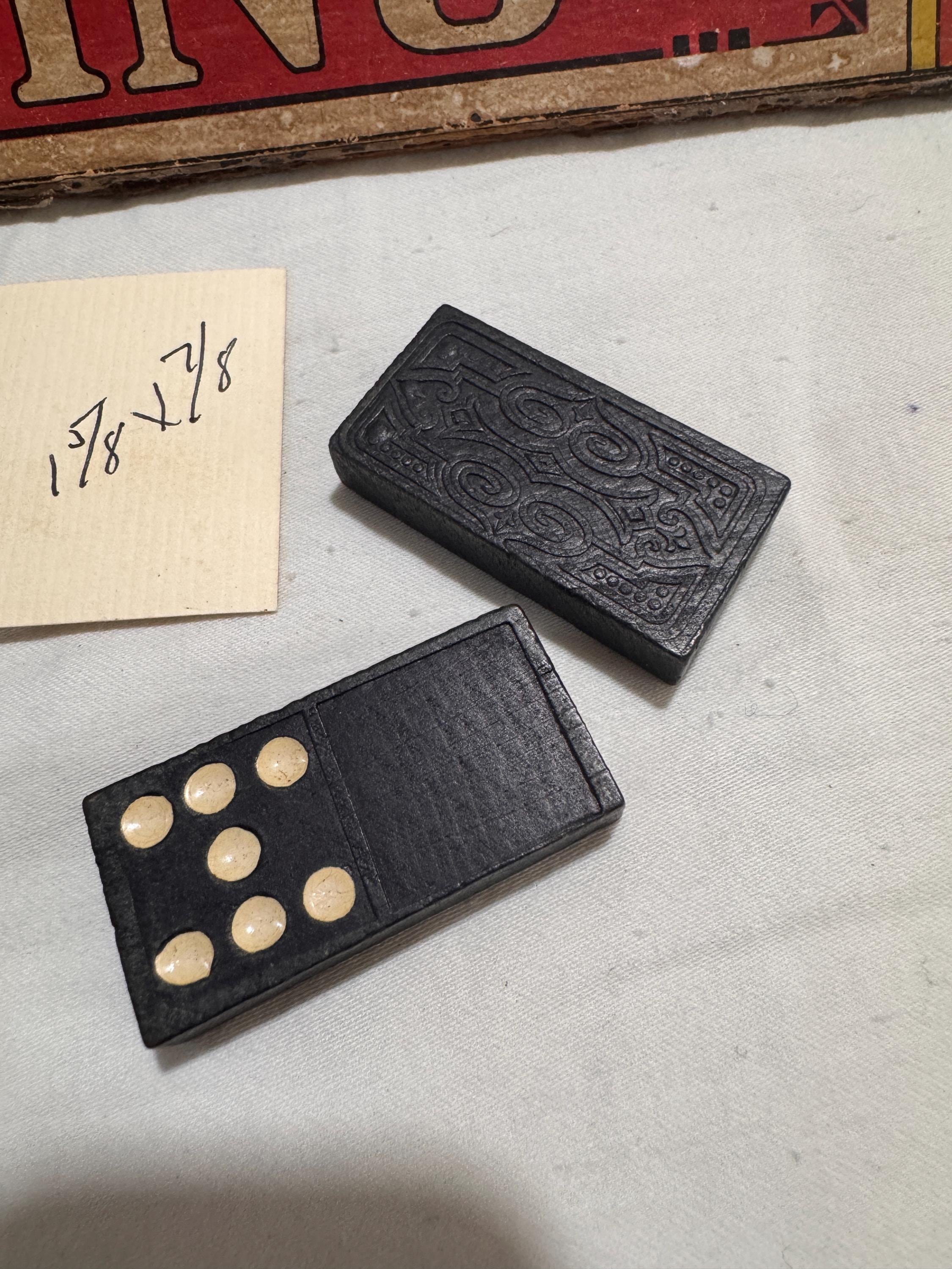Vintage Halsam 1940s Domino set. Per the card inside missing 6/11, 11/12 & 12/12. The dominos are 1 5/8 x 1/7/8 inches in length. Beautiful detail on the back of the dominos. Inside box lid states contents 91 dominoes Double 12 set with a name of previous owner written inside. The lid is missing one end piece. Box is in good Shape otherwise for a as old as it is.