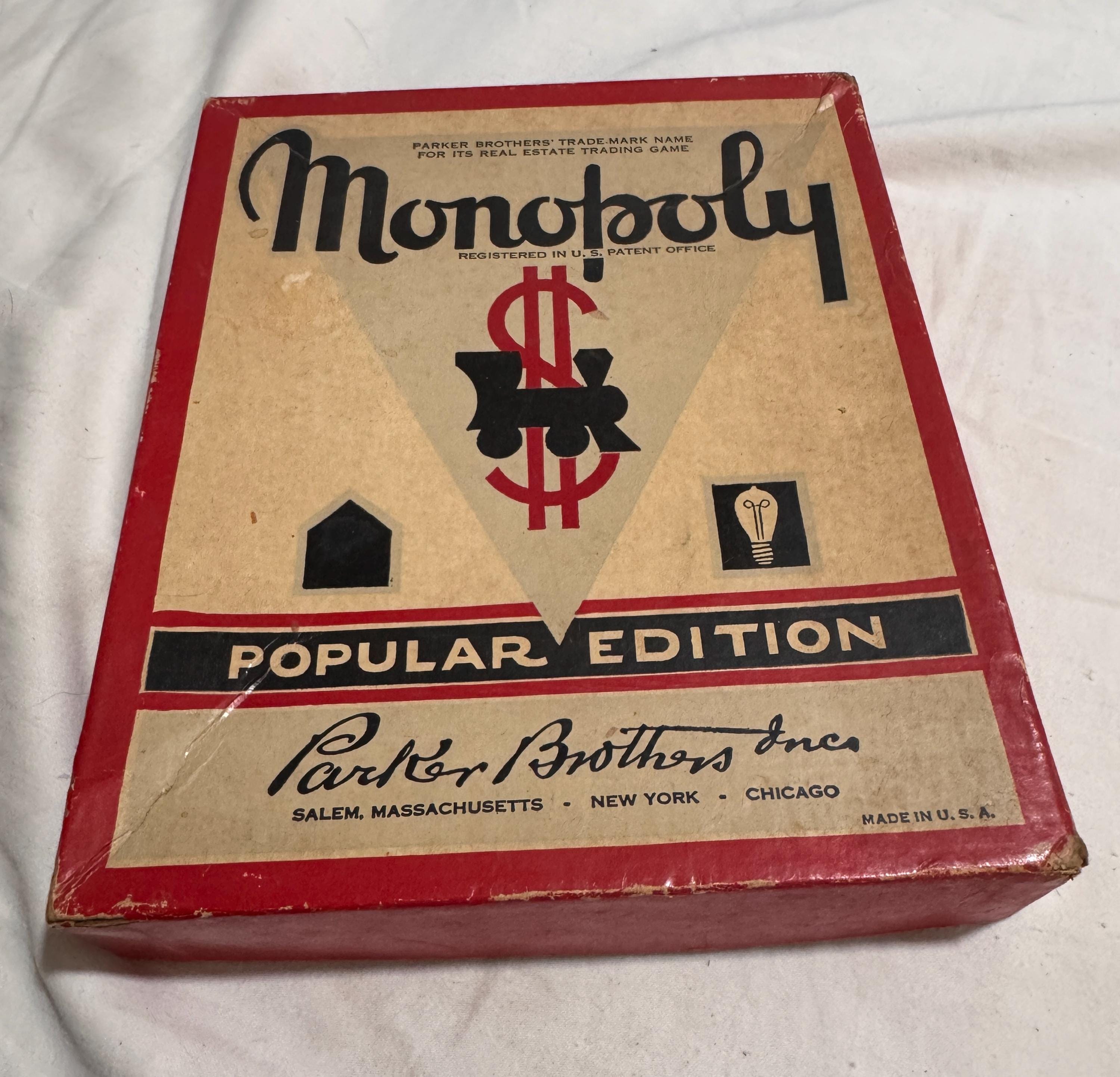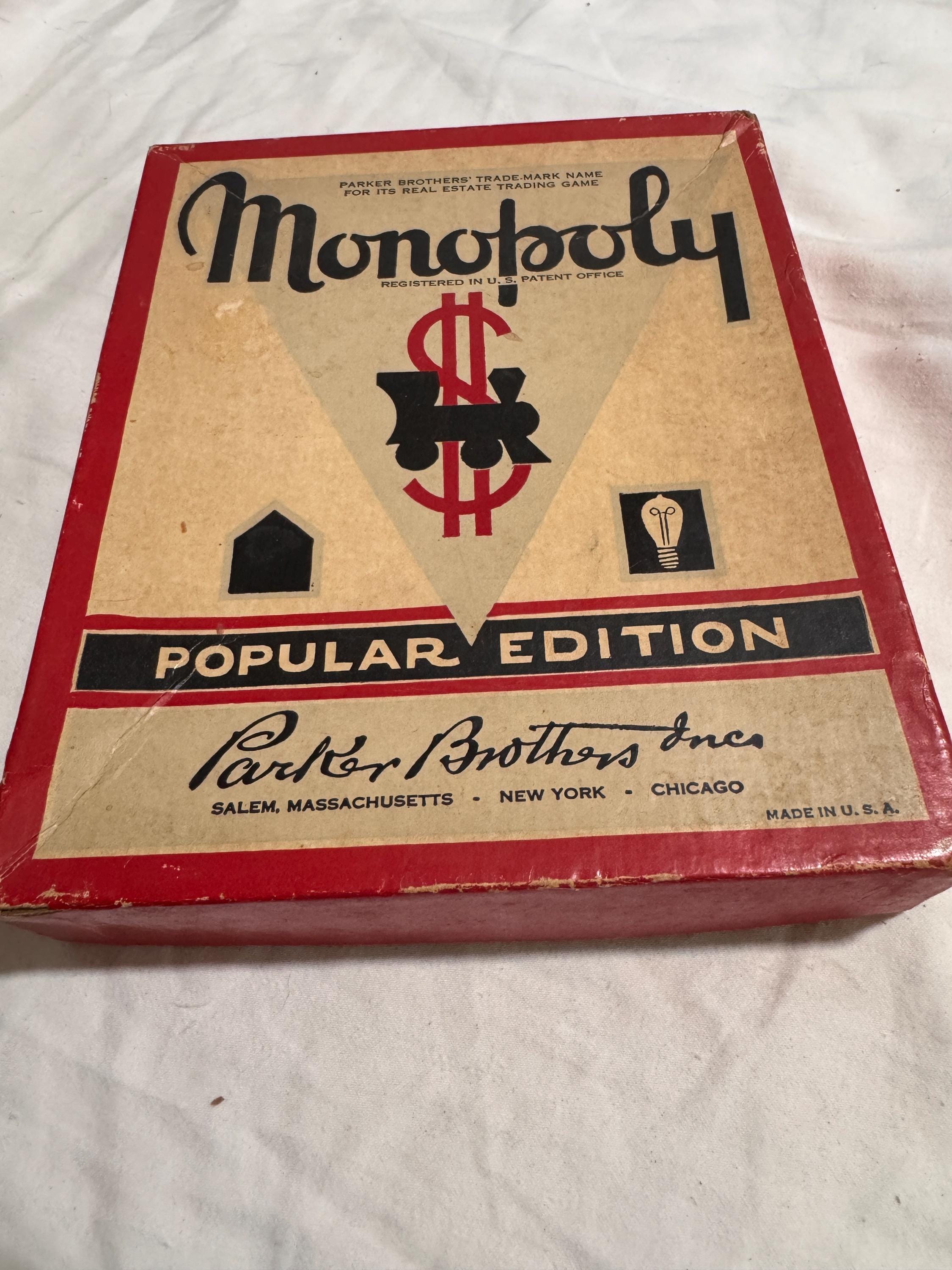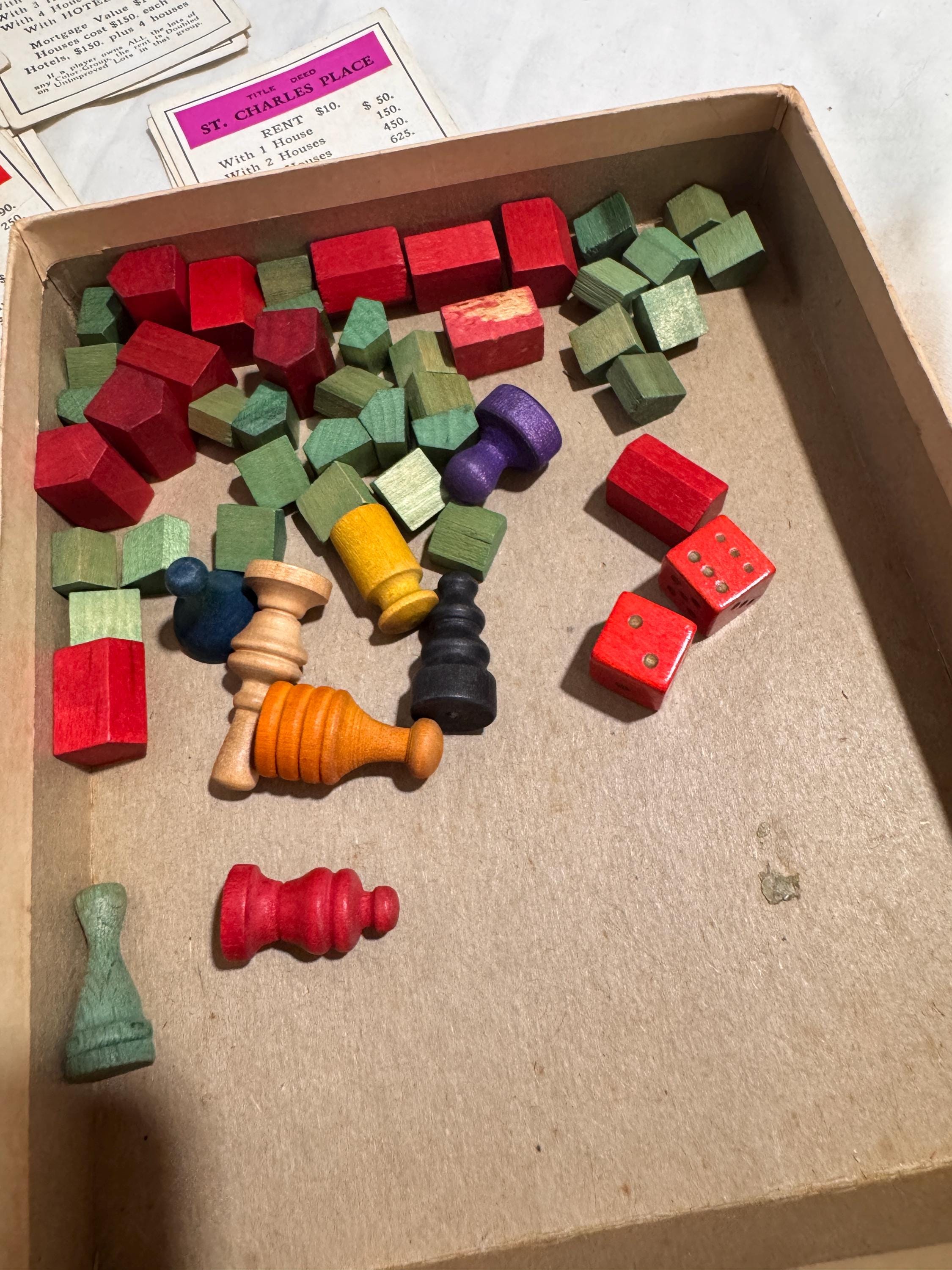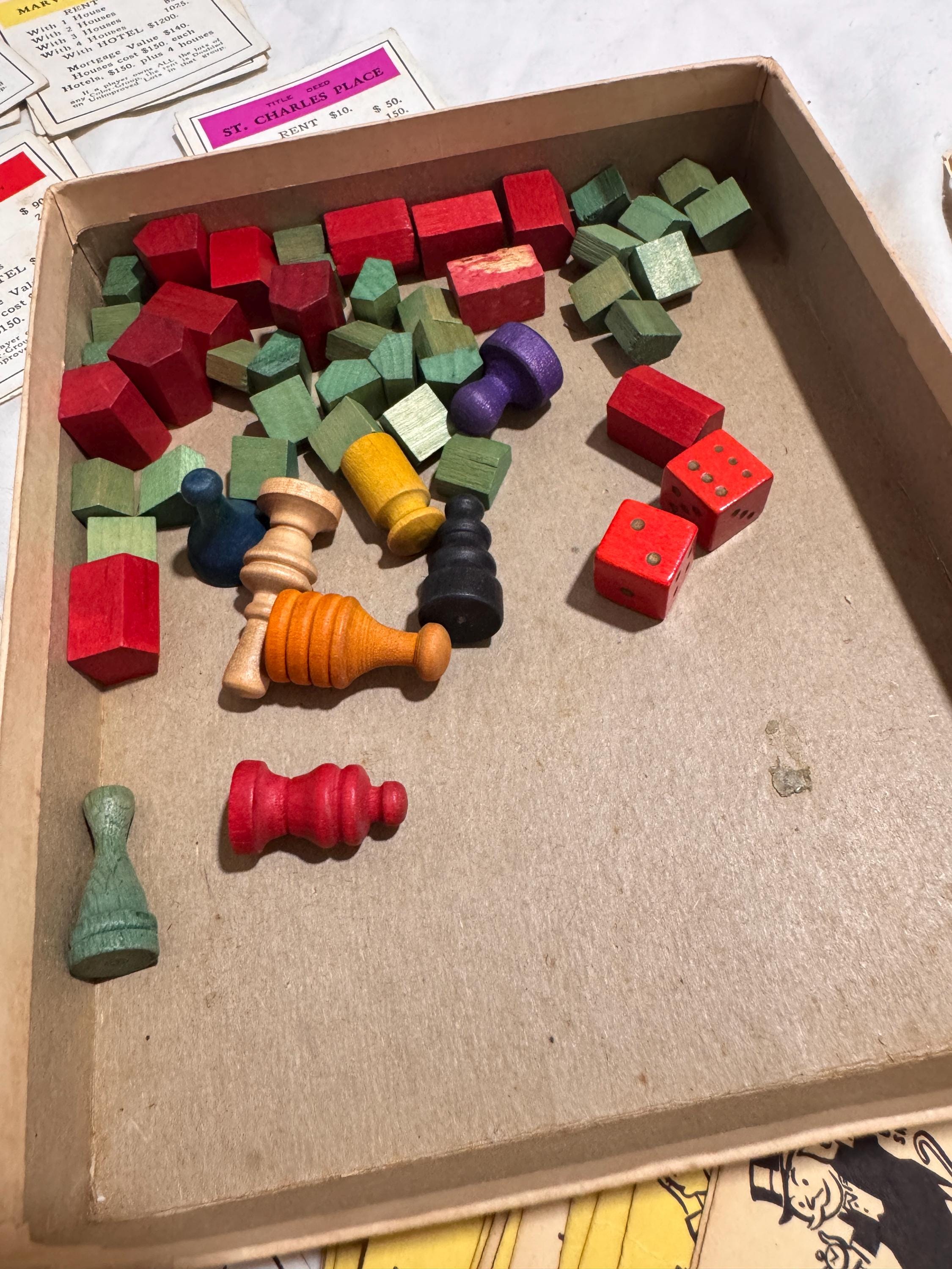 Vintage Monopoly “Popular Game” from either the 1940s or 50s, no markings to tell for sure. There is no box for the board, but only for the pieces. What you see in the box and images are all that was in the box.