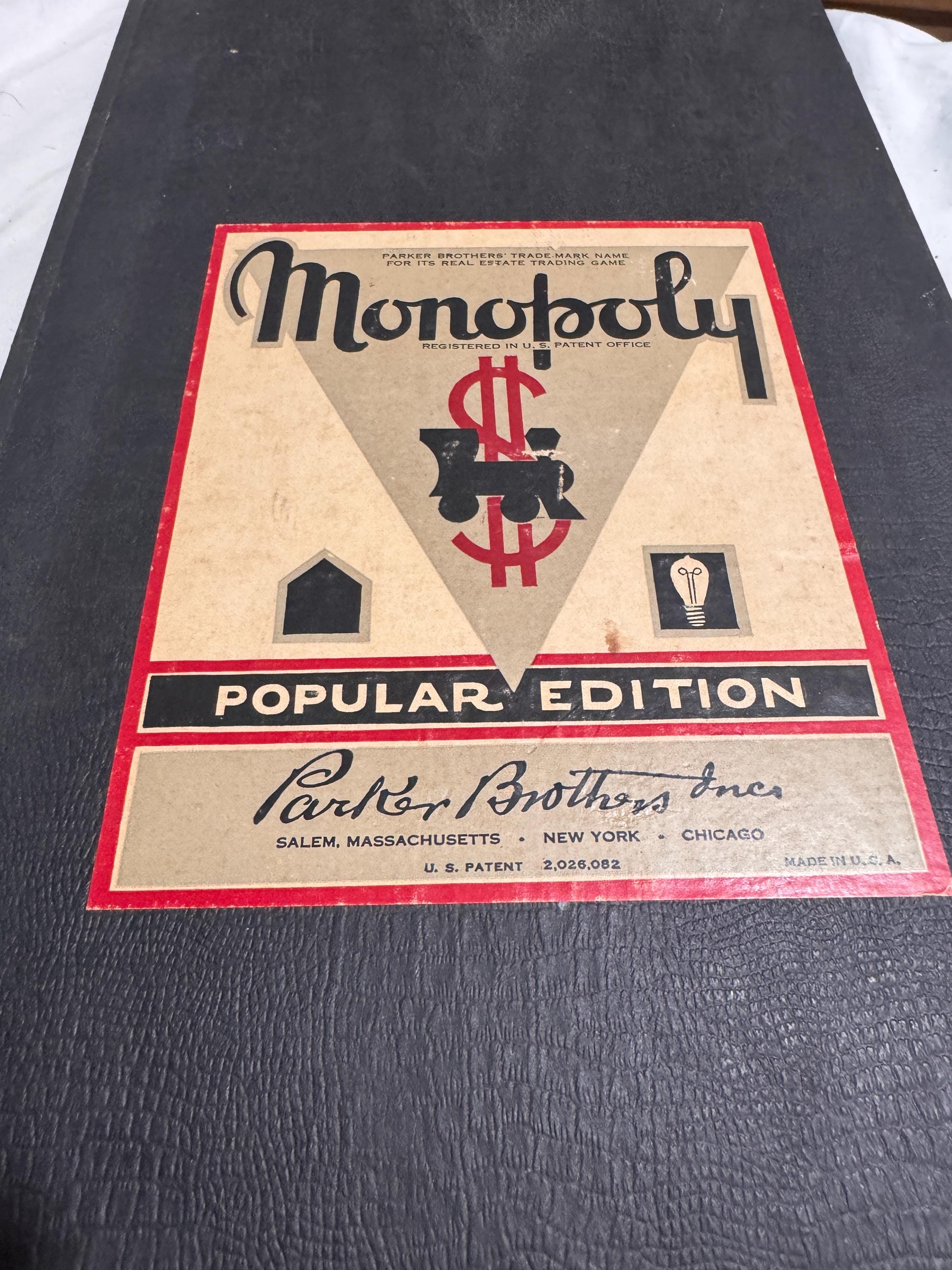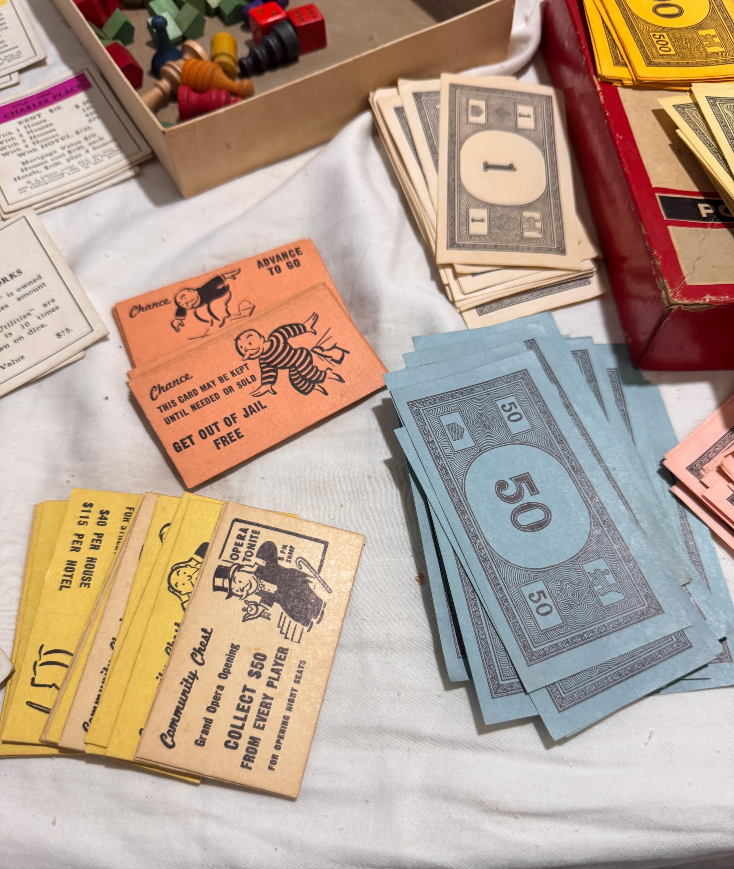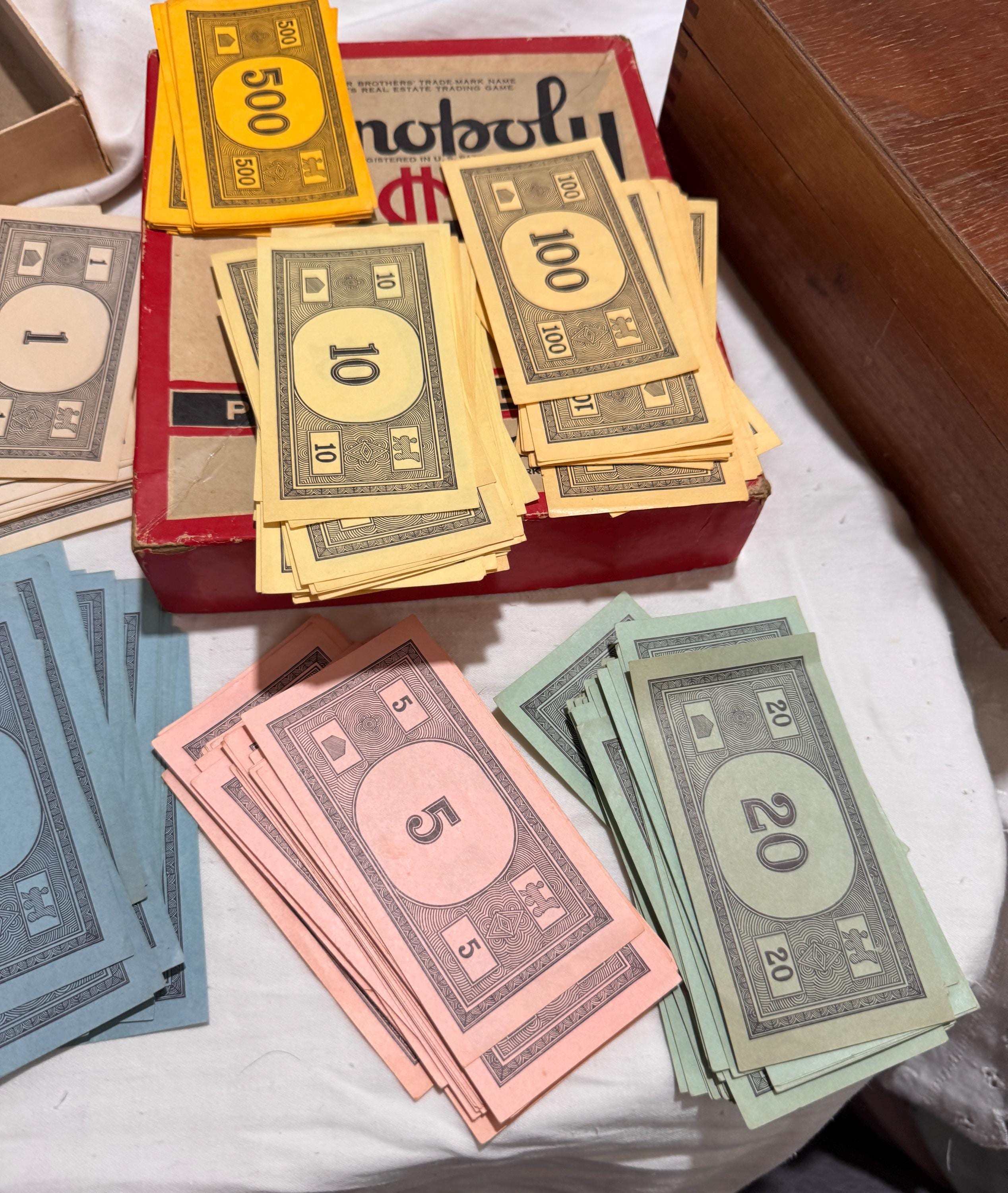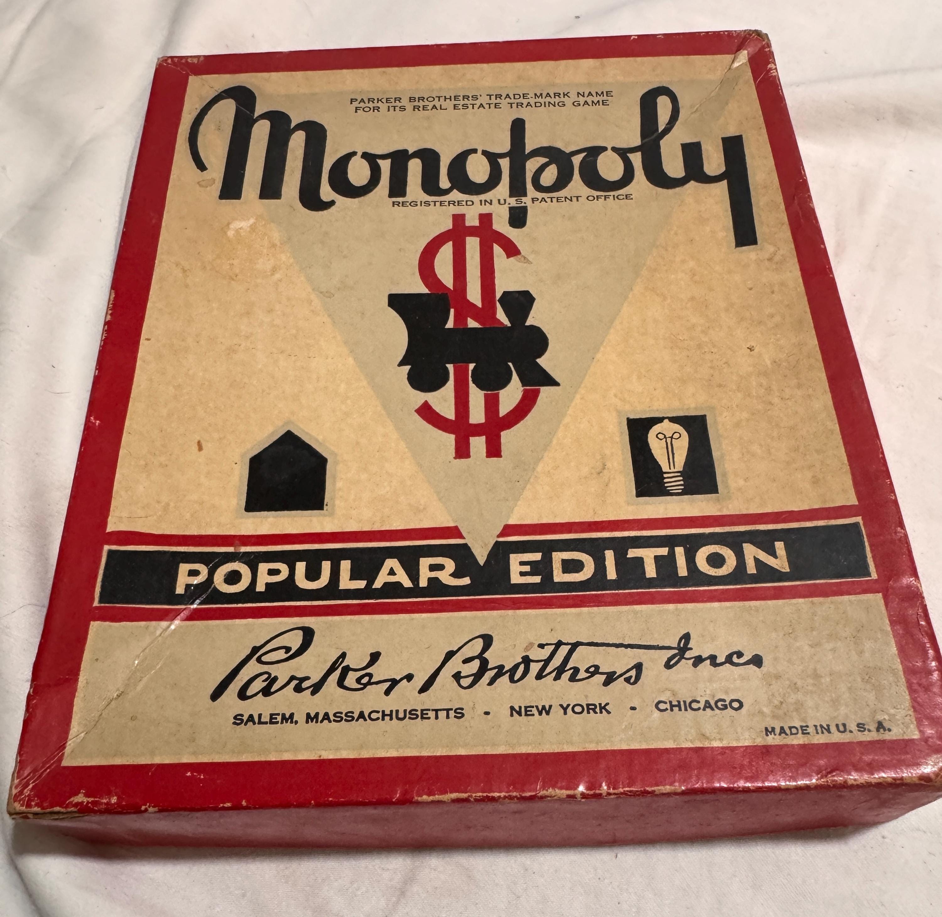 Vintage Monopoly “Popular Game” from either the 1940s or 50s, no markings to tell for sure. There is no box for the board, but only for the pieces. What you see in the box and images are all that was in the box.