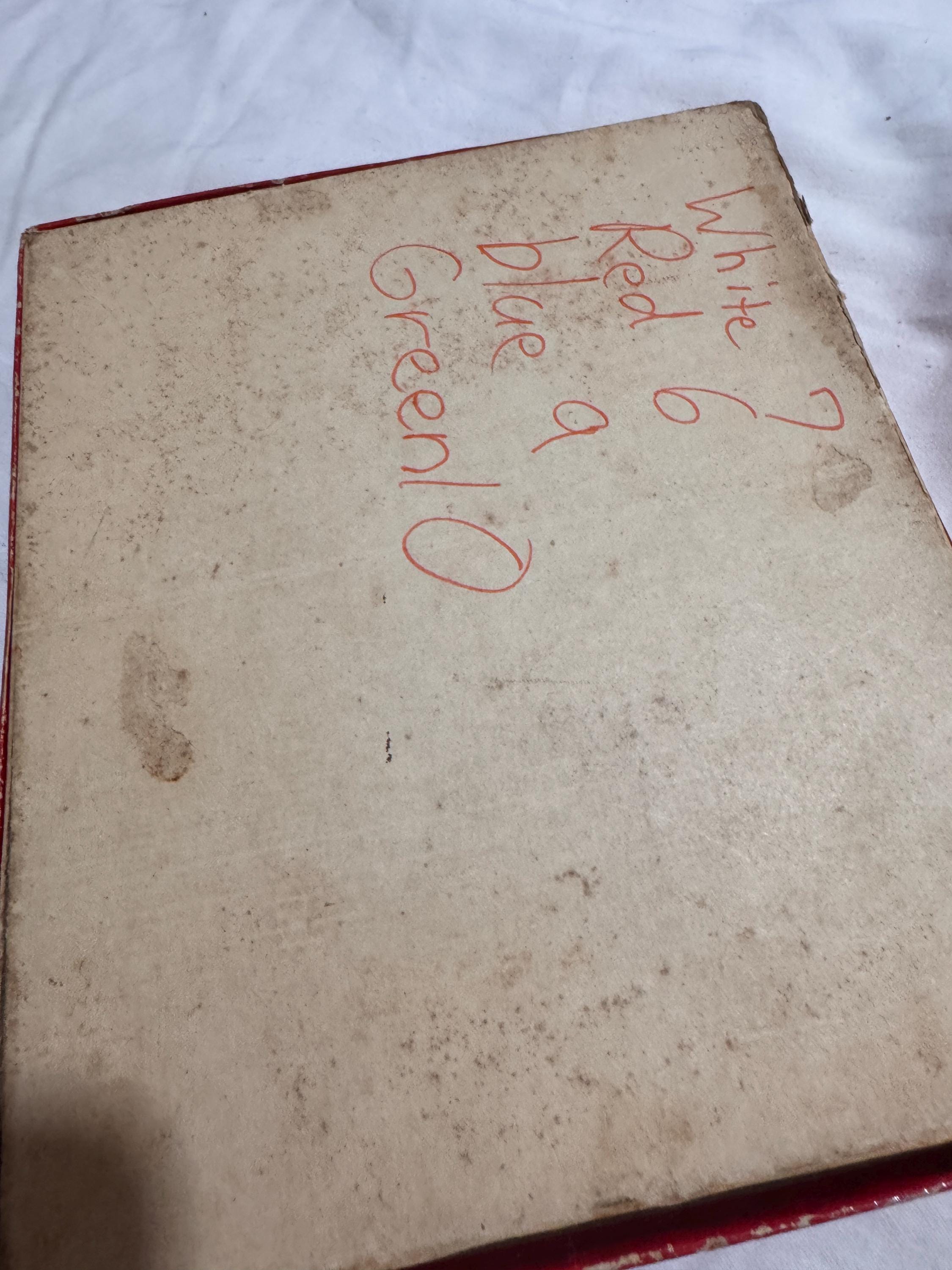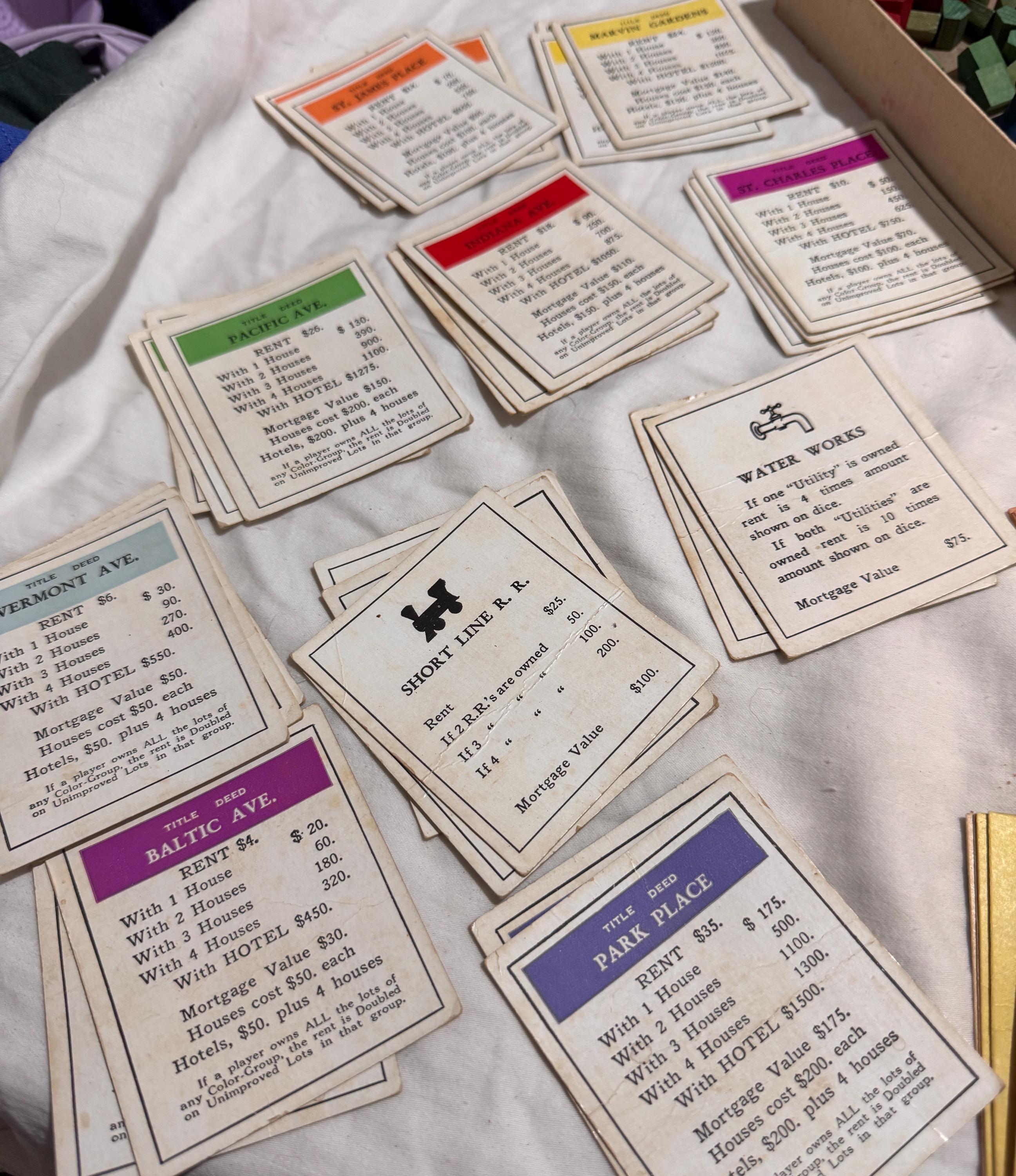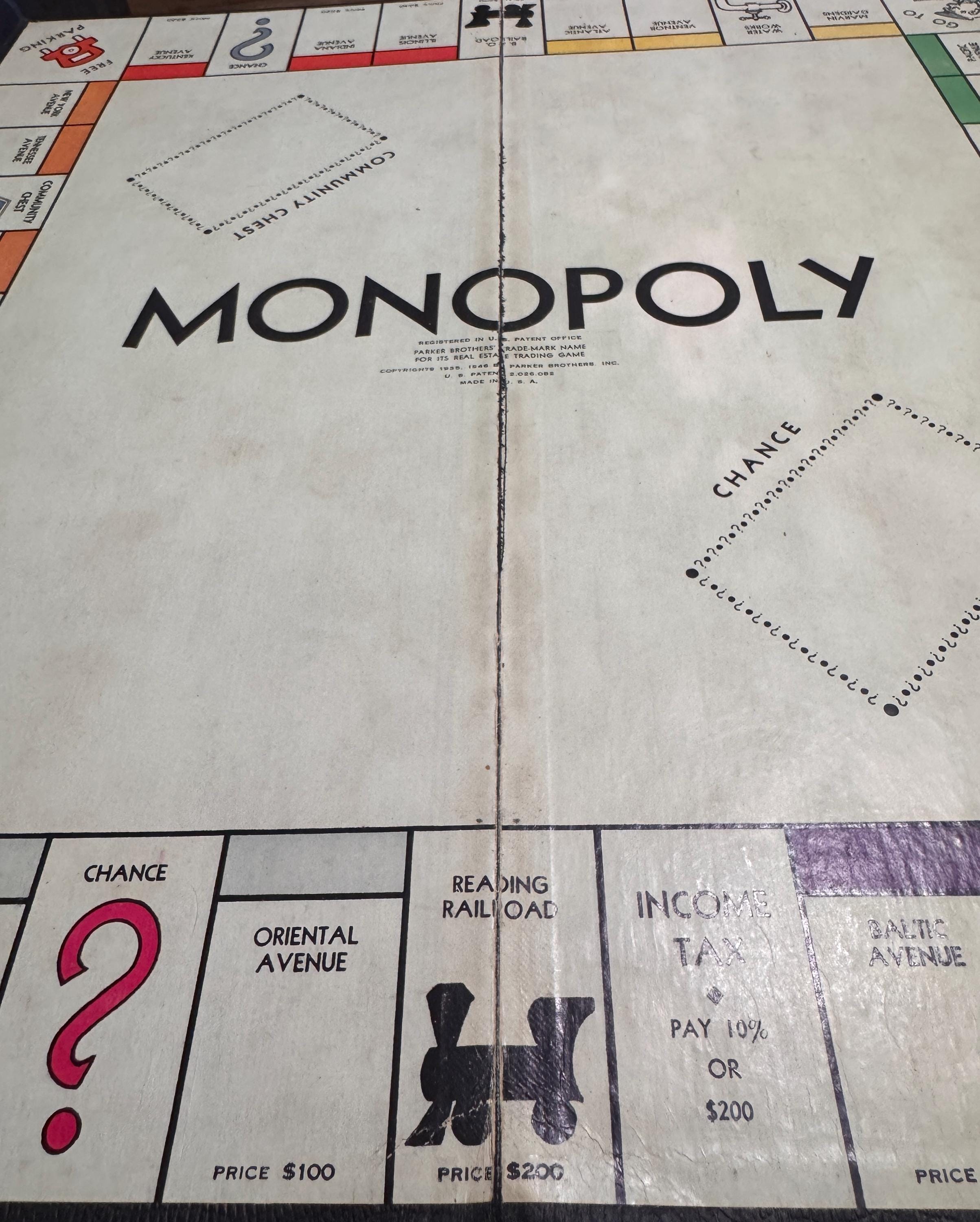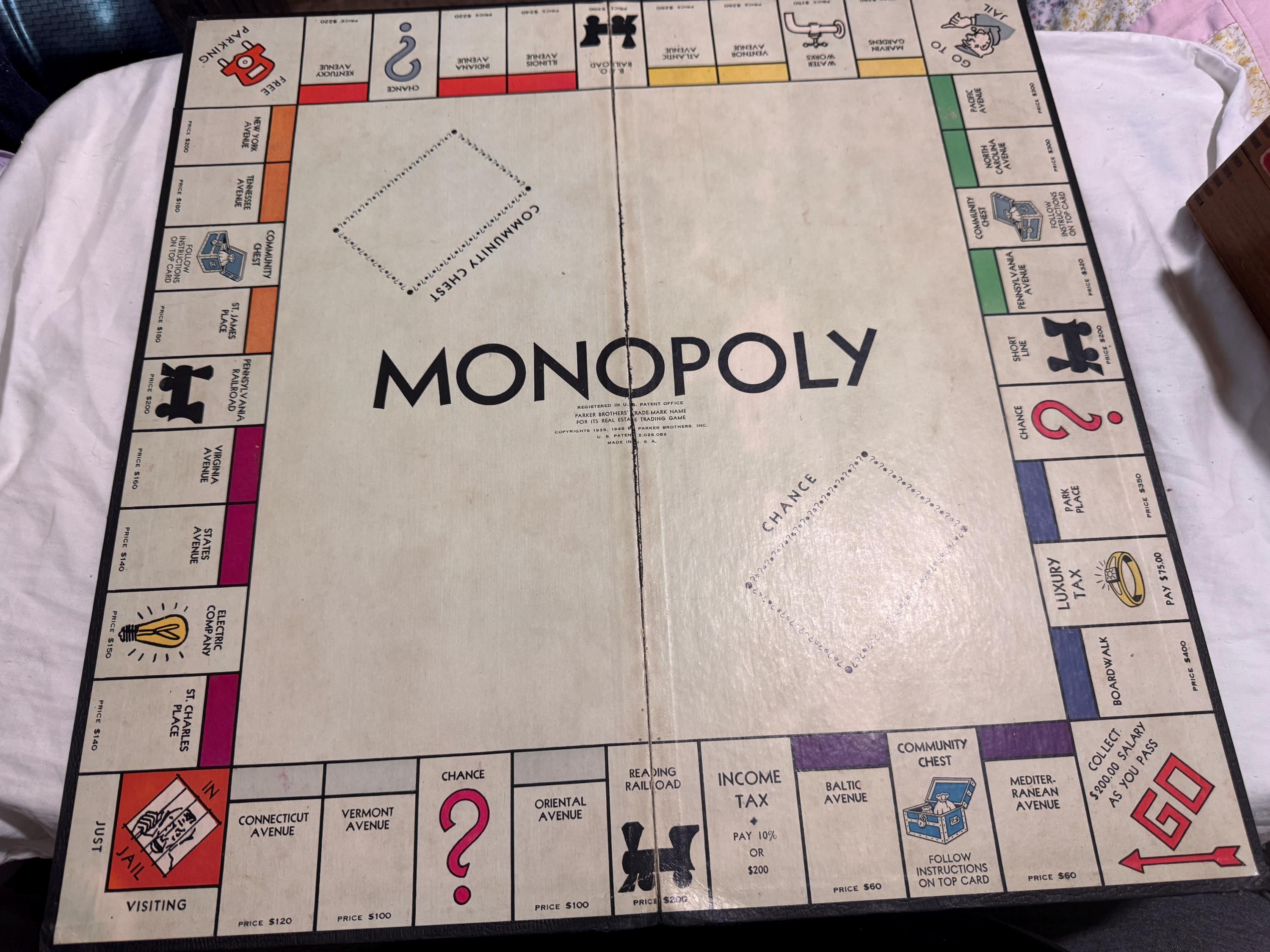 Vintage Monopoly “Popular Game” from either the 1940s or 50s, no markings to tell for sure. There is no box for the board, but only for the pieces. What you see in the box and images are all that was in the box.