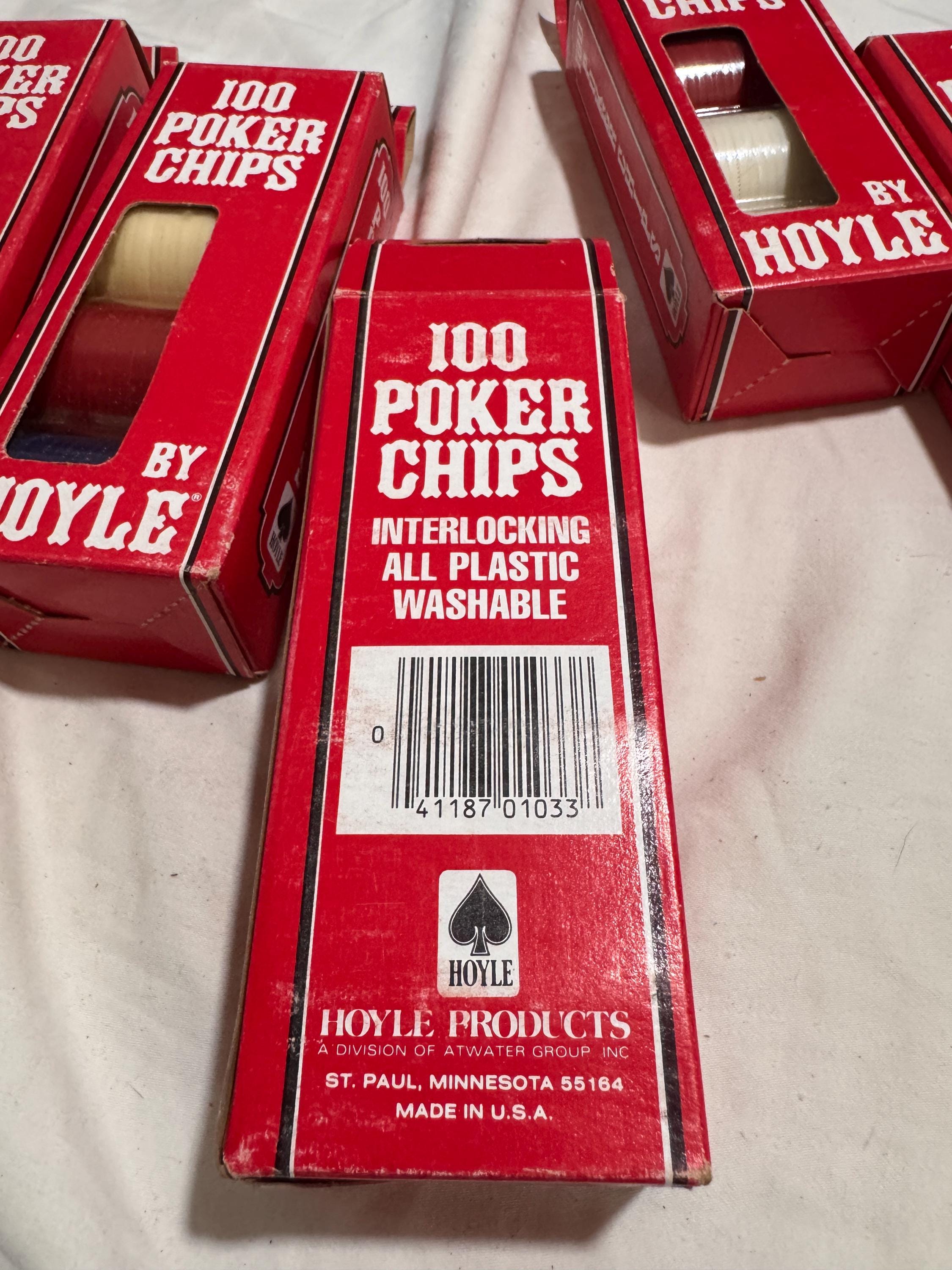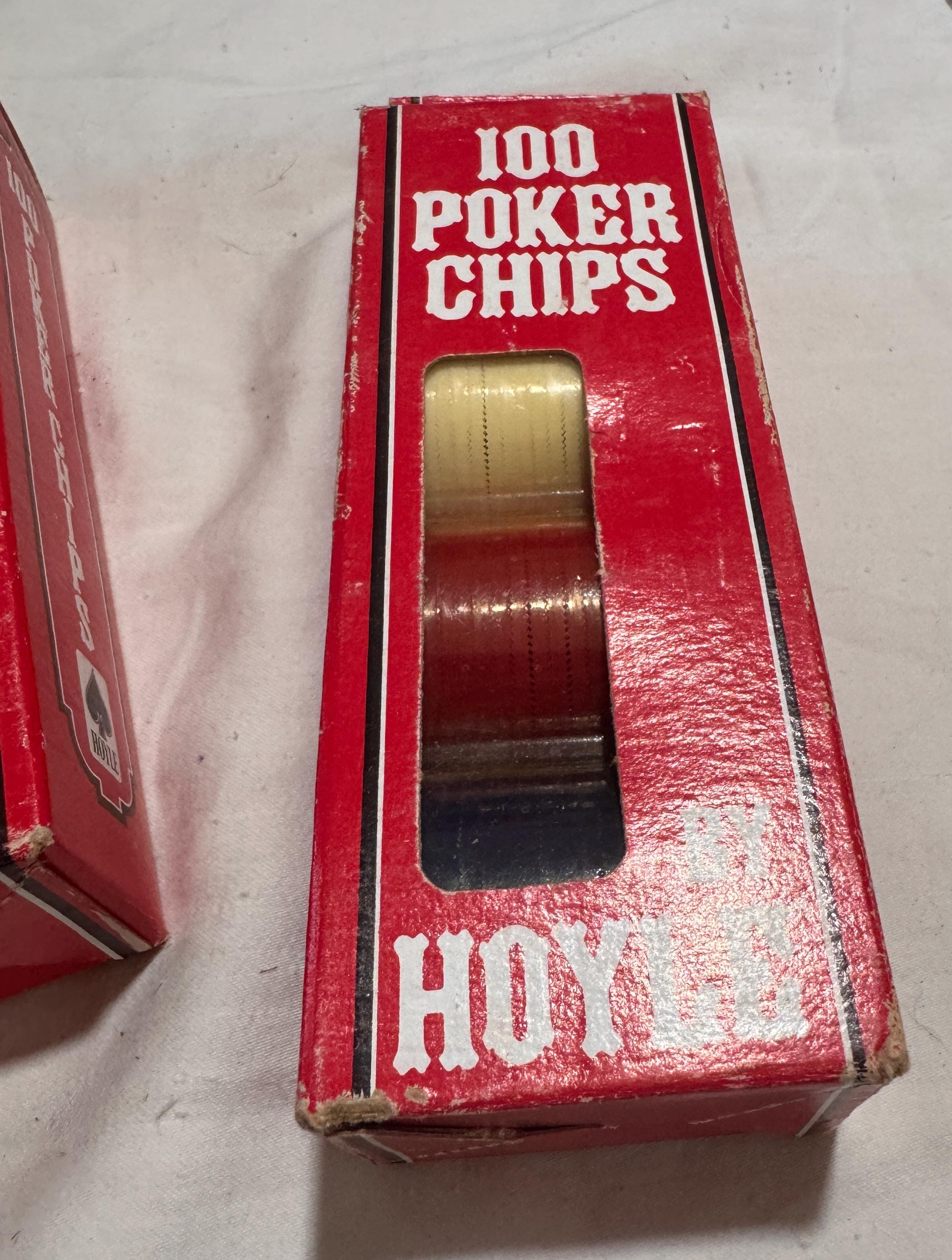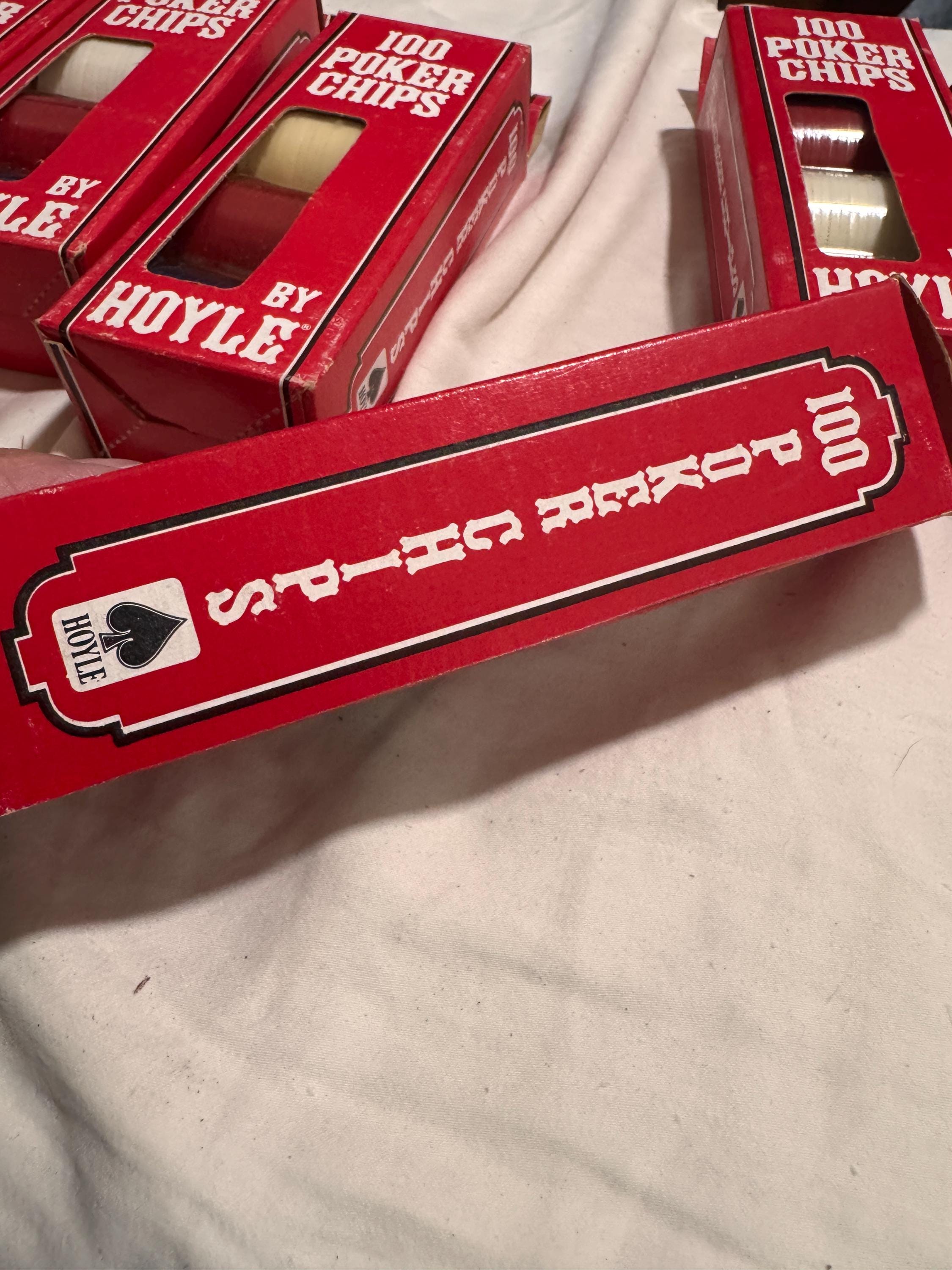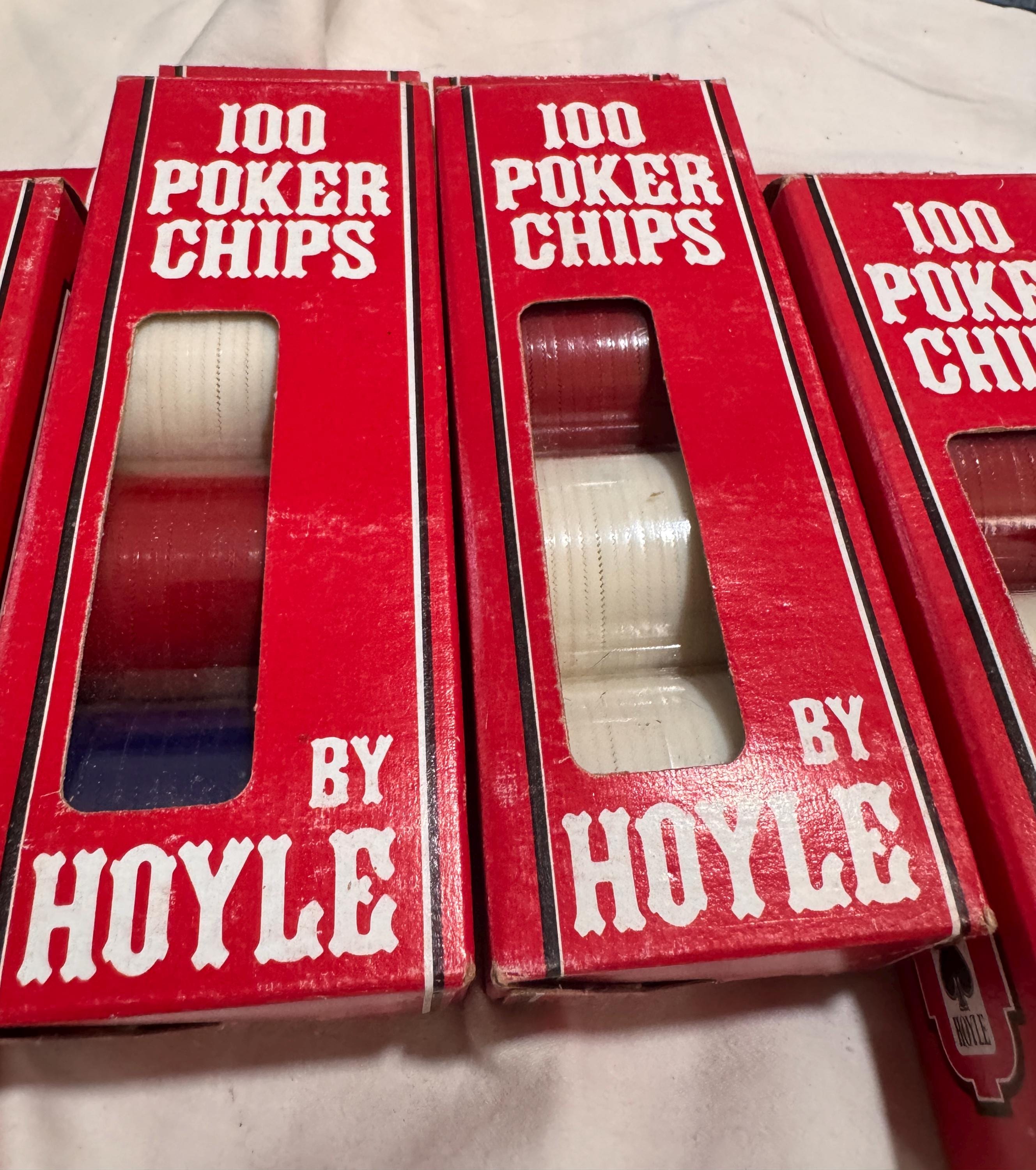 In package- never used Vintage Hoyle Poker Chips. Made in the USA in the 1990s. CHIPS - NEVER USED. Boxes have some wear from being shelved and boxed up. 6 boxes individual boxes