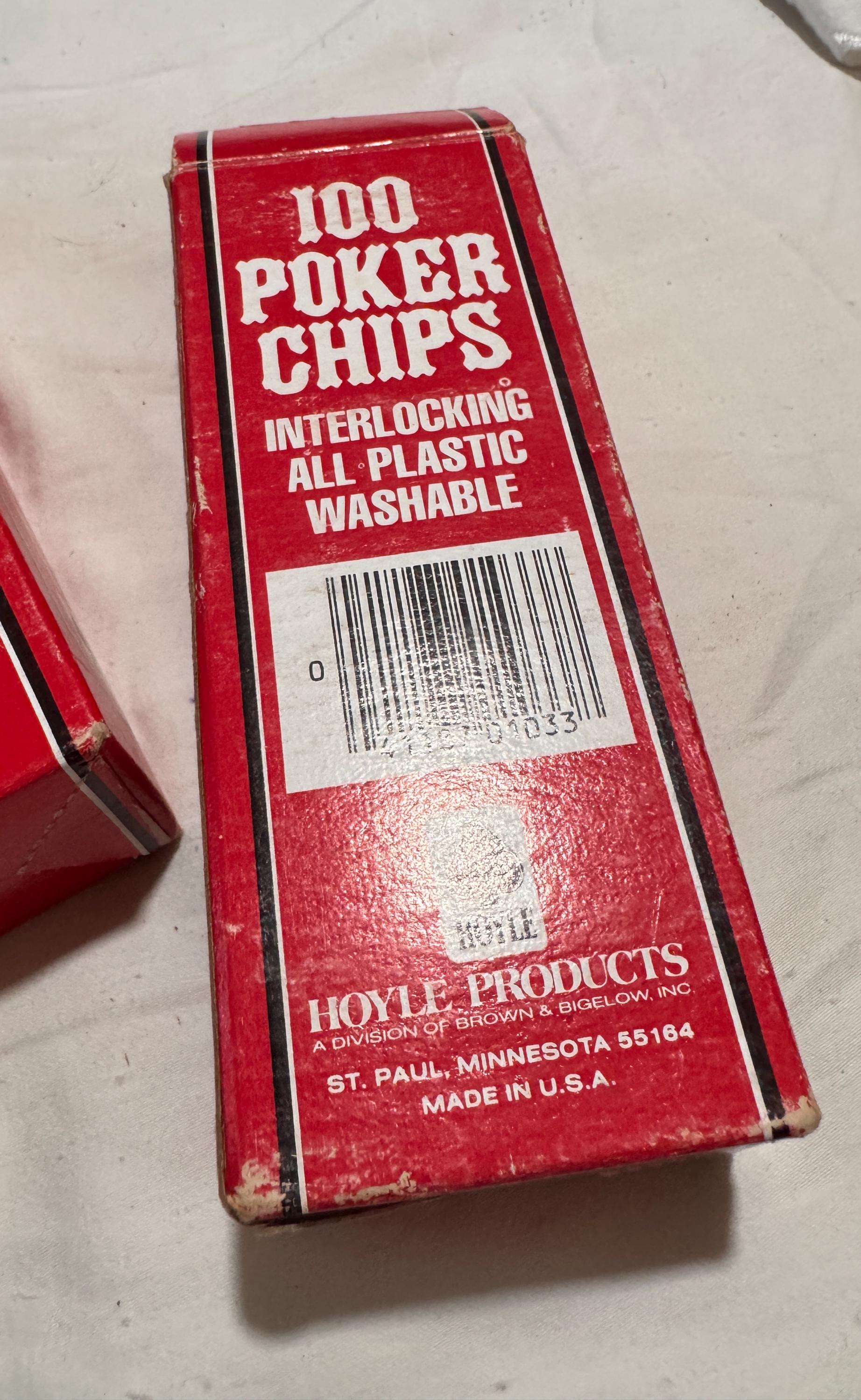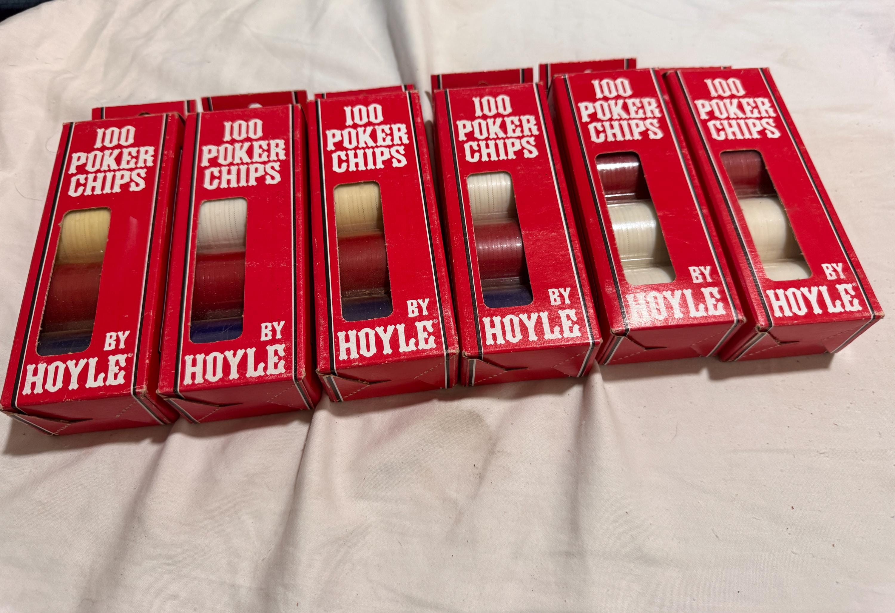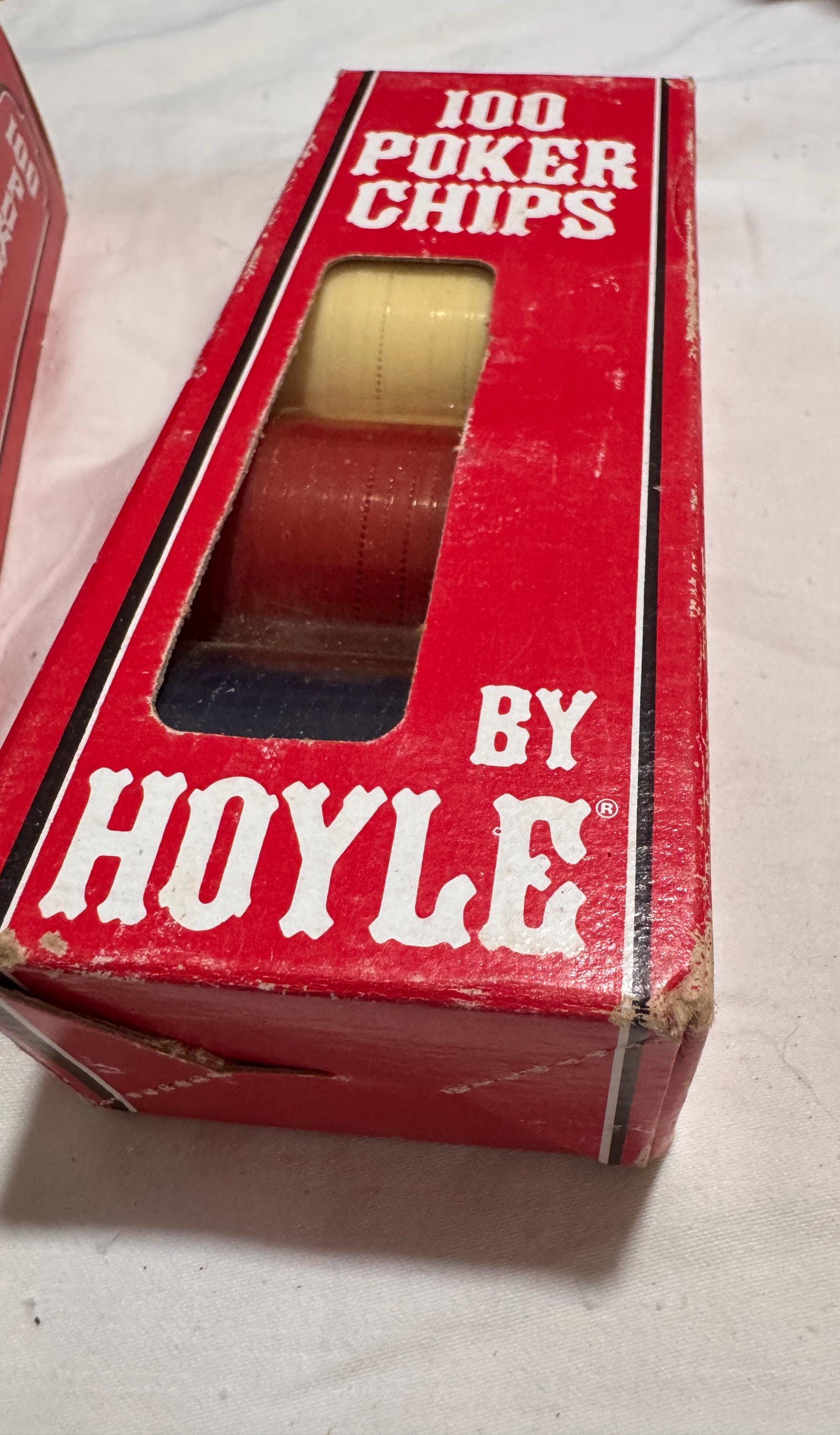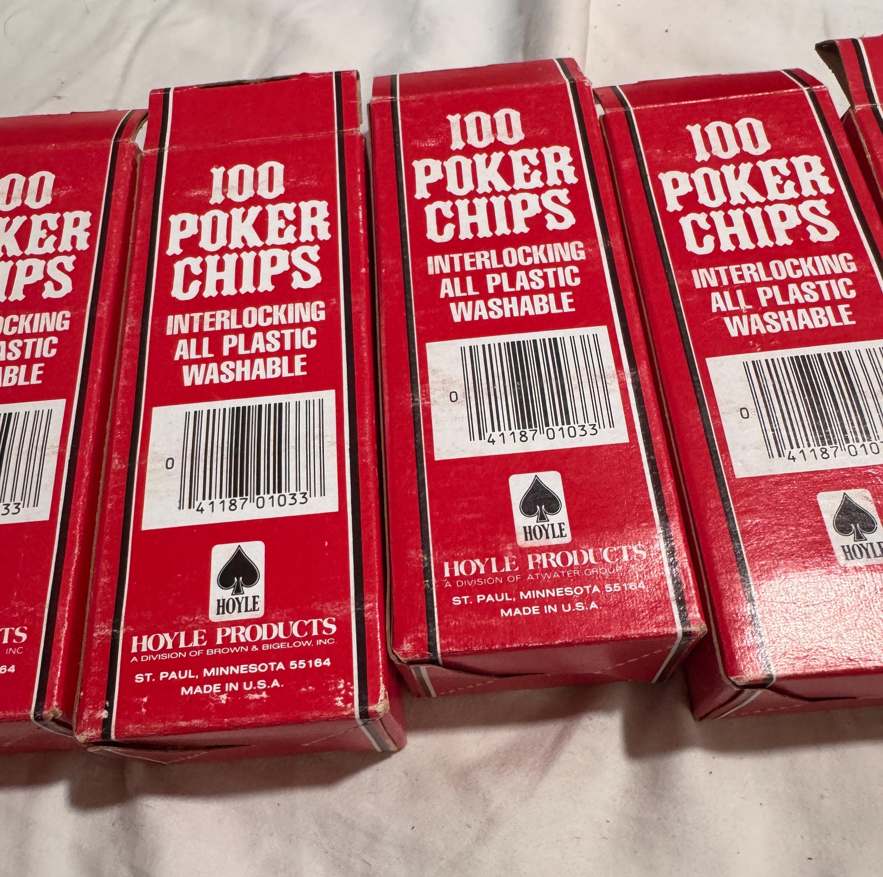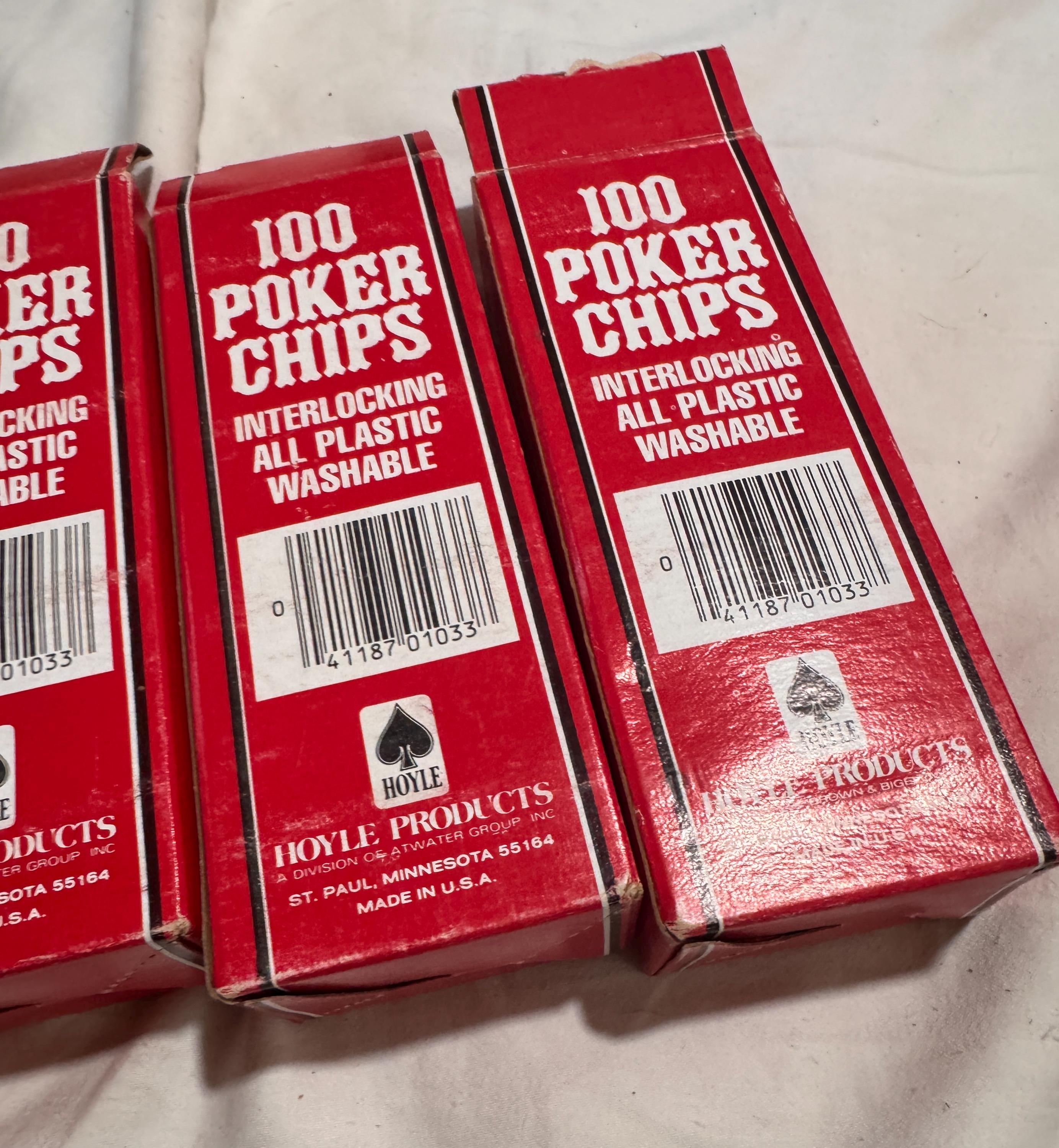 In package- never used Vintage Hoyle Poker Chips. Made in the USA in the 1990s. CHIPS - NEVER USED. Boxes have some wear from being shelved and boxed up. 6 boxes individual boxes