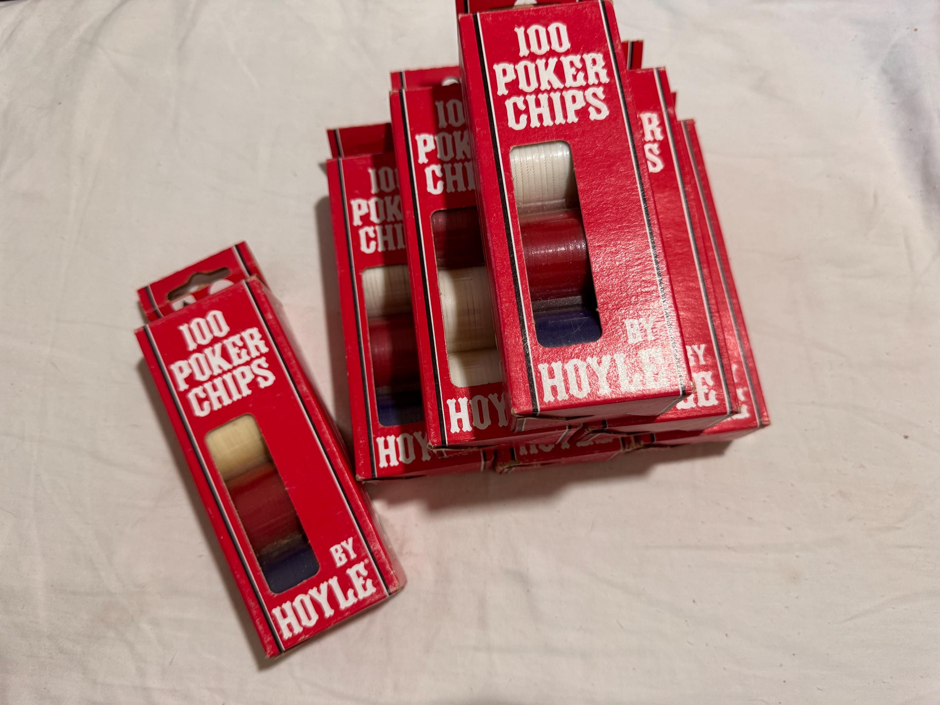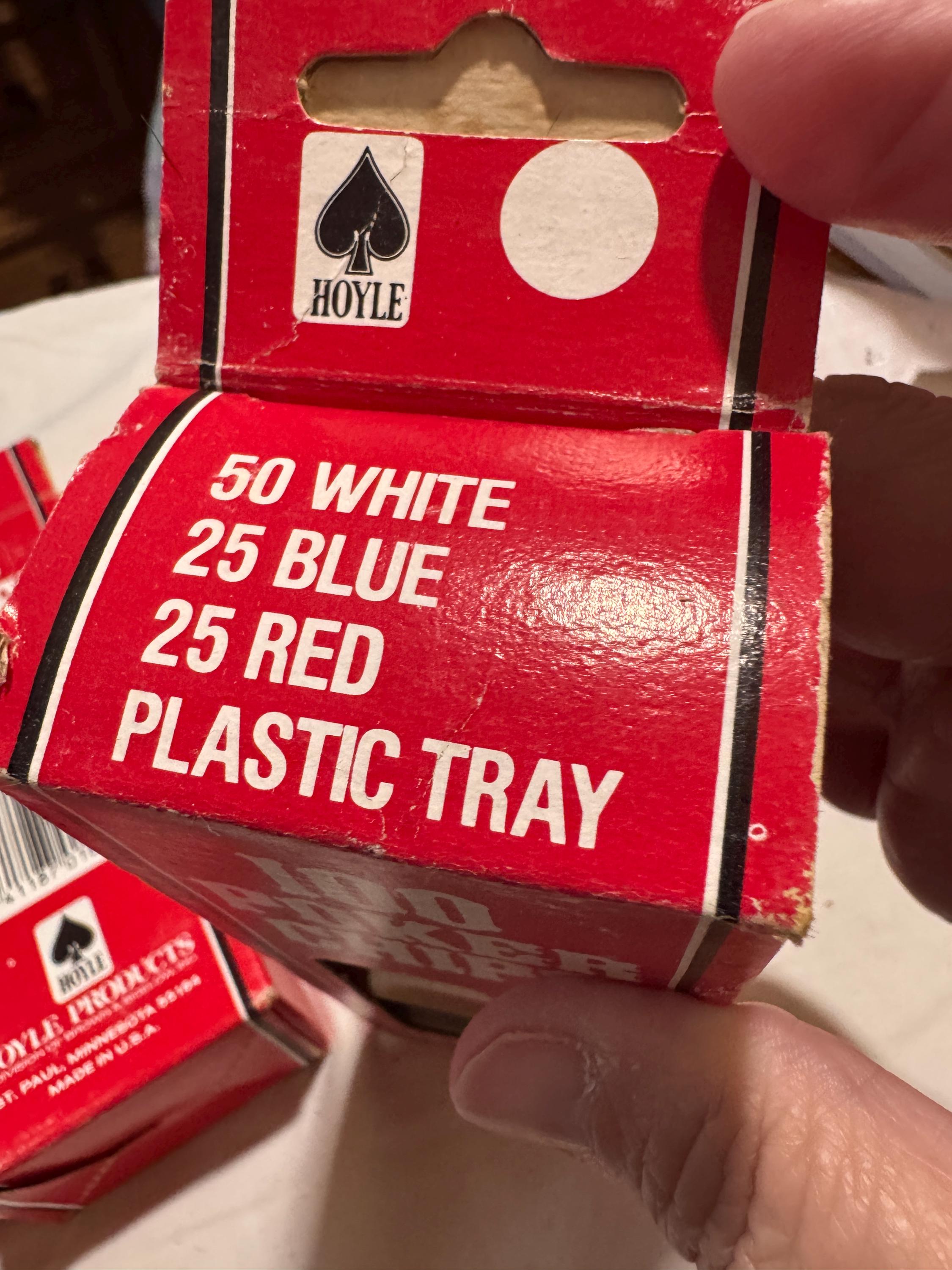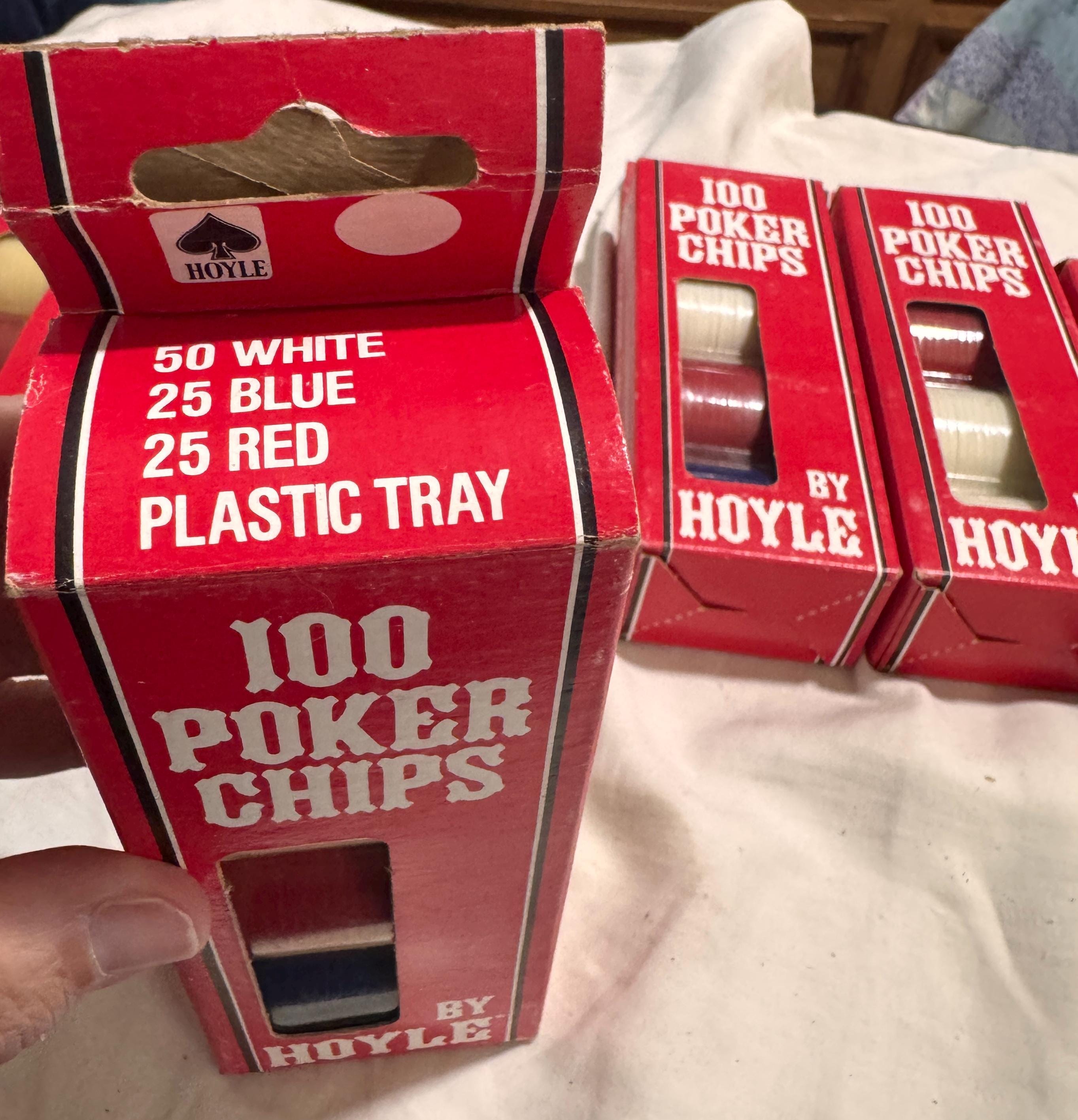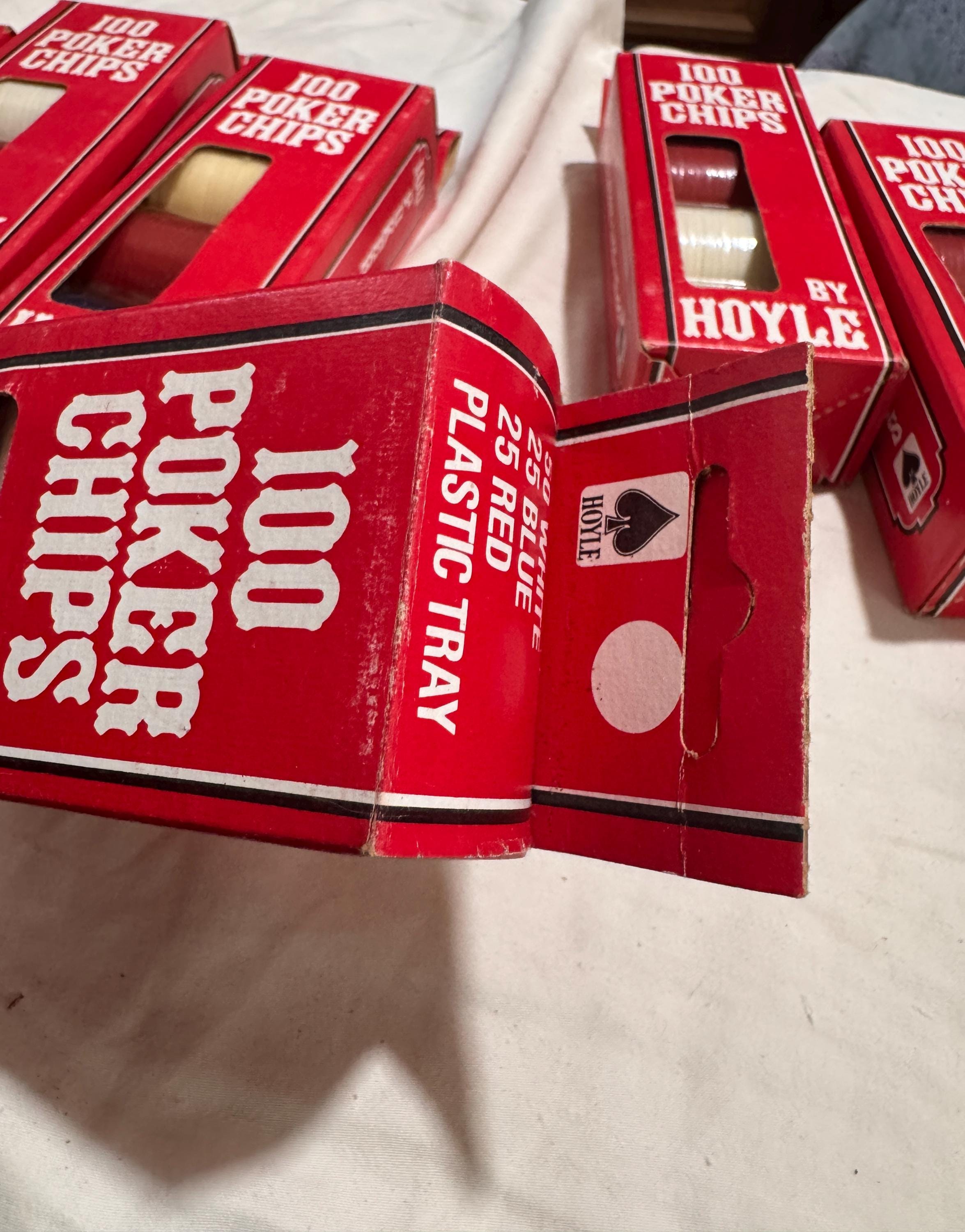 In package- never used Vintage Hoyle Poker Chips. Made in the USA in the 1990s. CHIPS - NEVER USED. Boxes have some wear from being shelved and boxed up. 6 boxes individual boxes