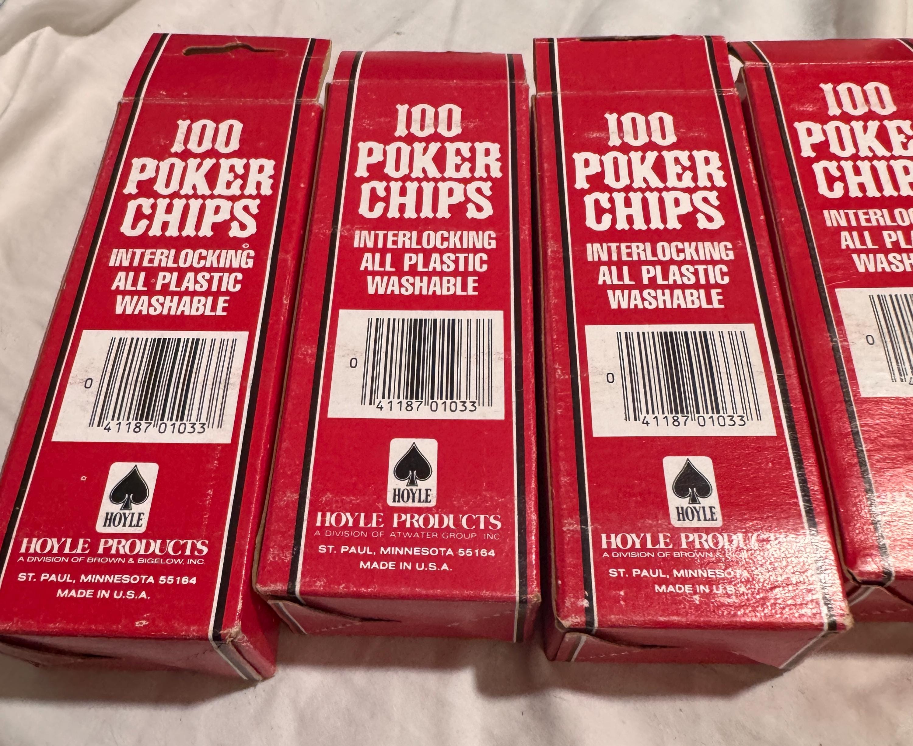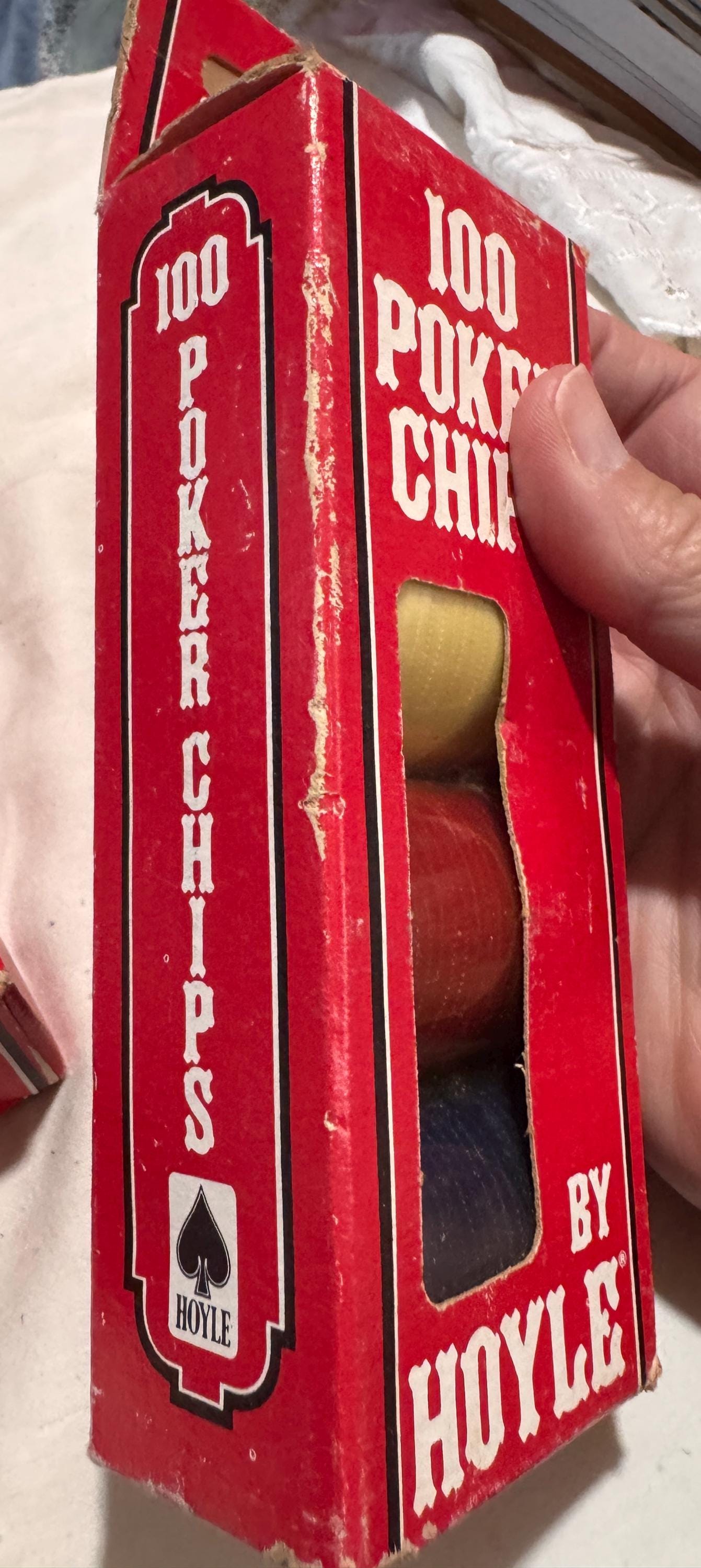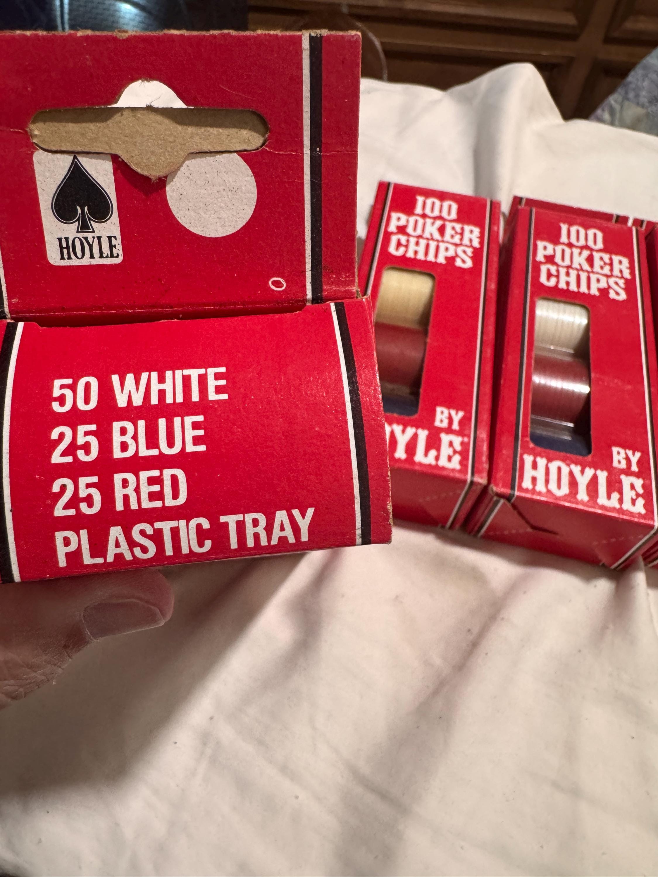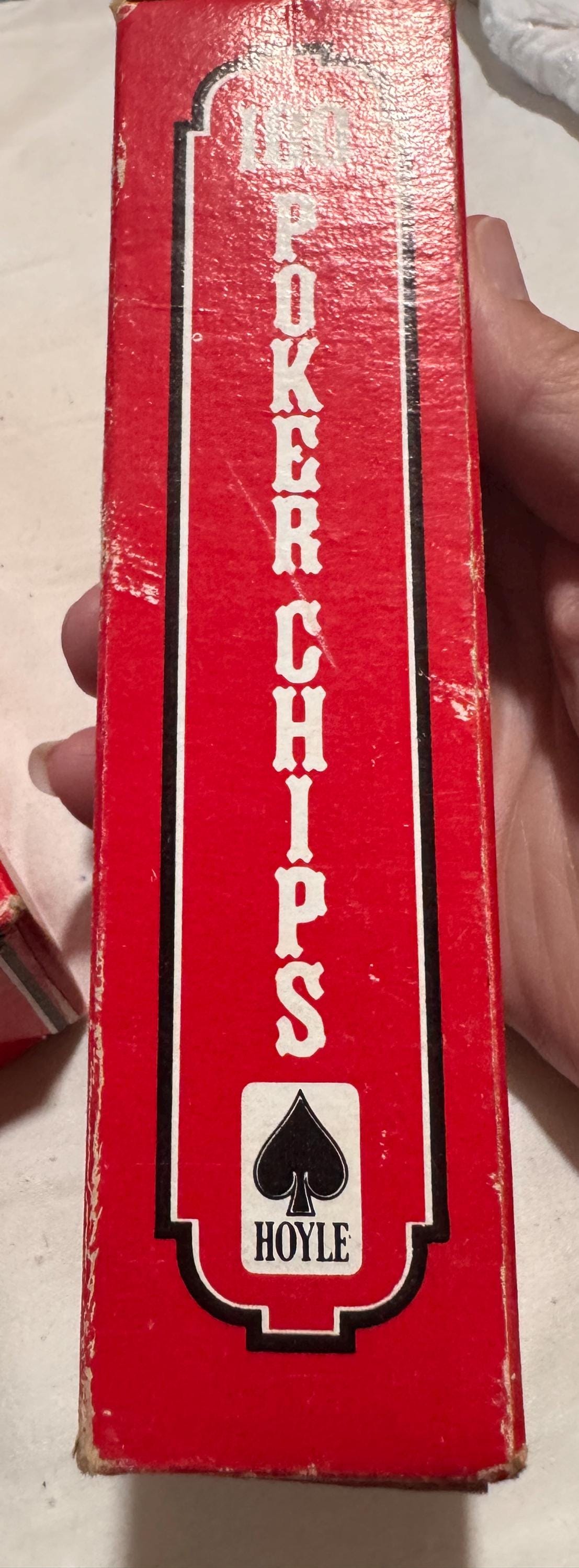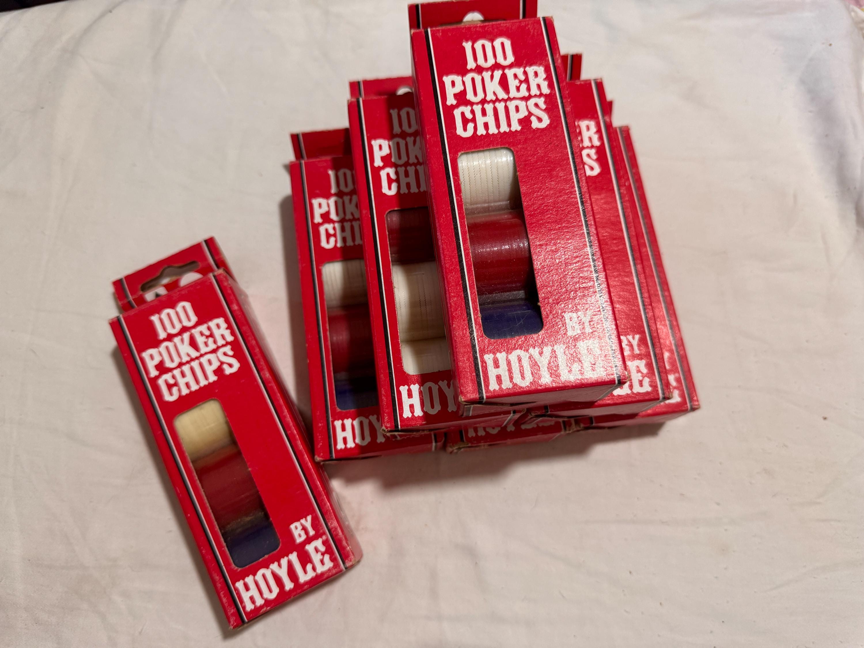 In package- never used Vintage Hoyle Poker Chips. Made in the USA in the 1990s. CHIPS - NEVER USED. Boxes have some wear from being shelved and boxed up. 6 boxes individual boxes