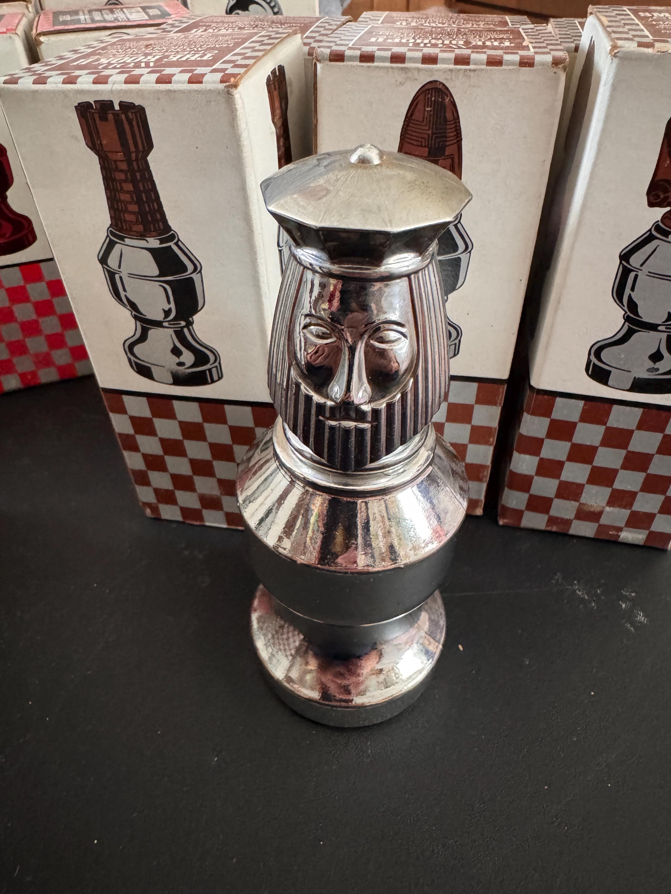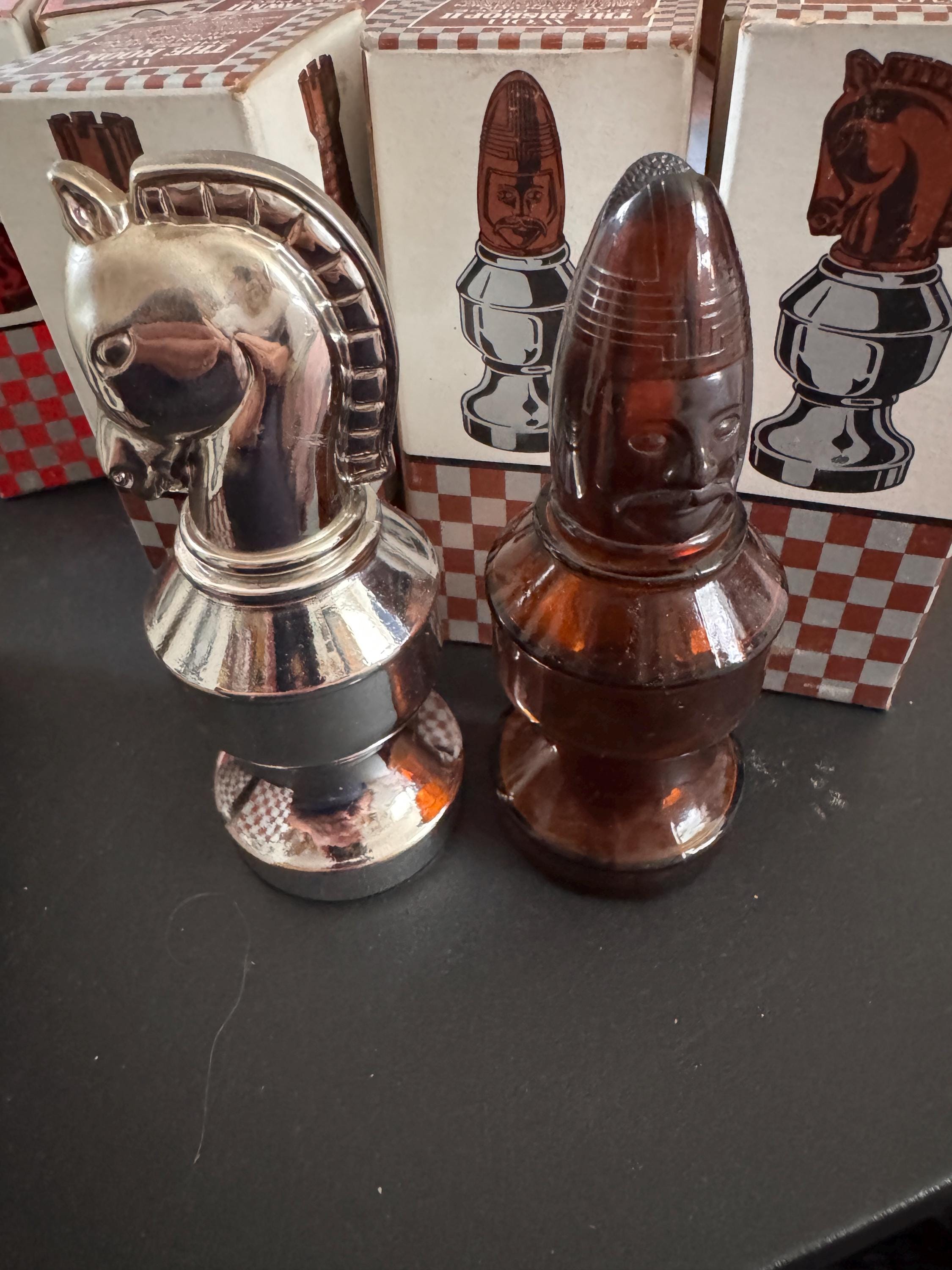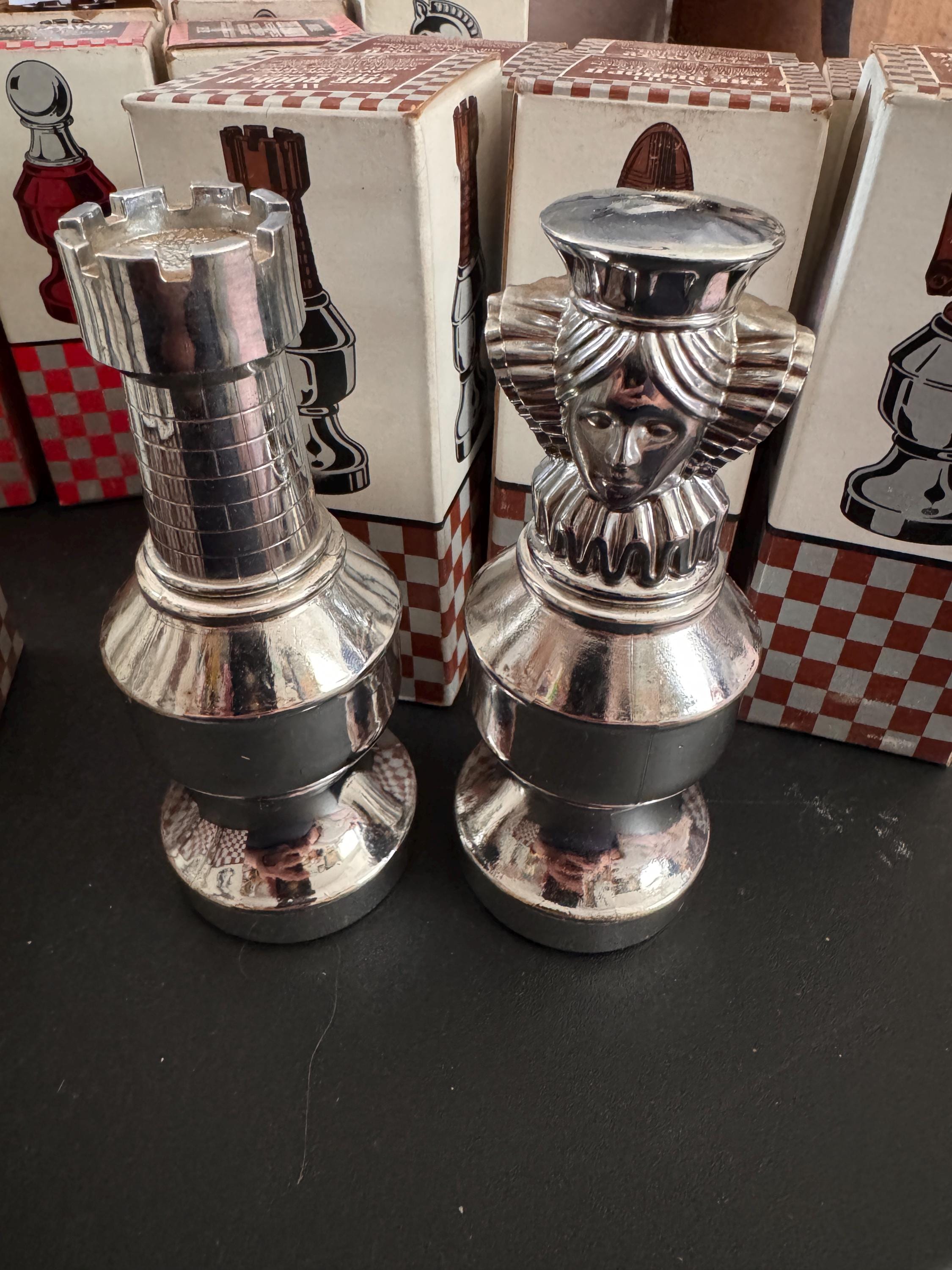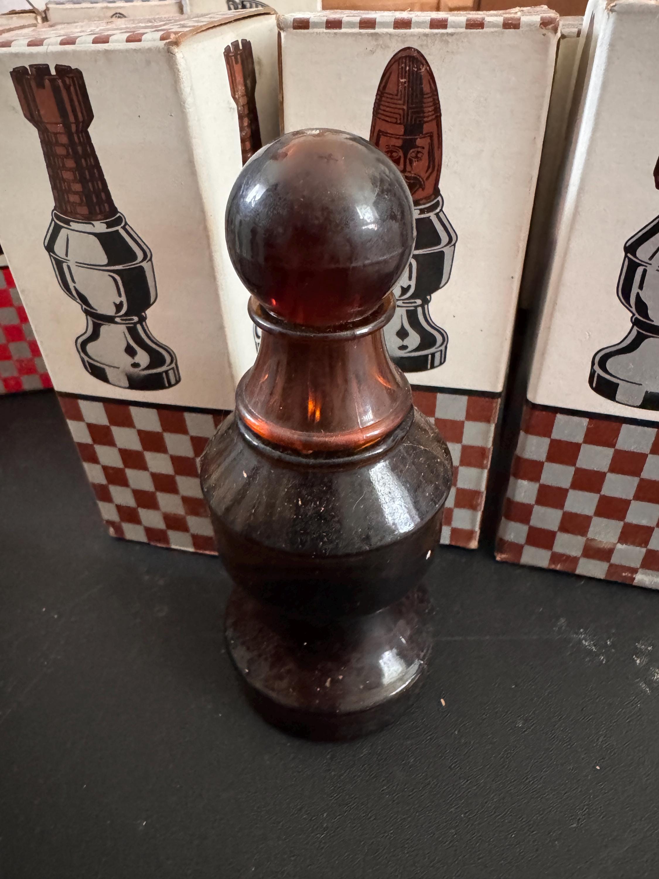 1970s Vintage Avon Chess Piece bottles containers of aftershave, aftershave lotion. Complete collection of 32 pieces all in each original box. Few boxes have slight damage, one missing top but majority have very little wear and tear. Some still have the liquid inside, most are empty. Collectible decanters each in the shape of chess pieces, King, Queen, Rook, Bishop, Knight, and Pawns. Made from plastic and glass, with a glossy finish and a silver color. Boxes are original. Original from the 20th Century, made during the 1970s. Each stand from 3” to little over 5” in heights. Bases are approximately 1.75”.