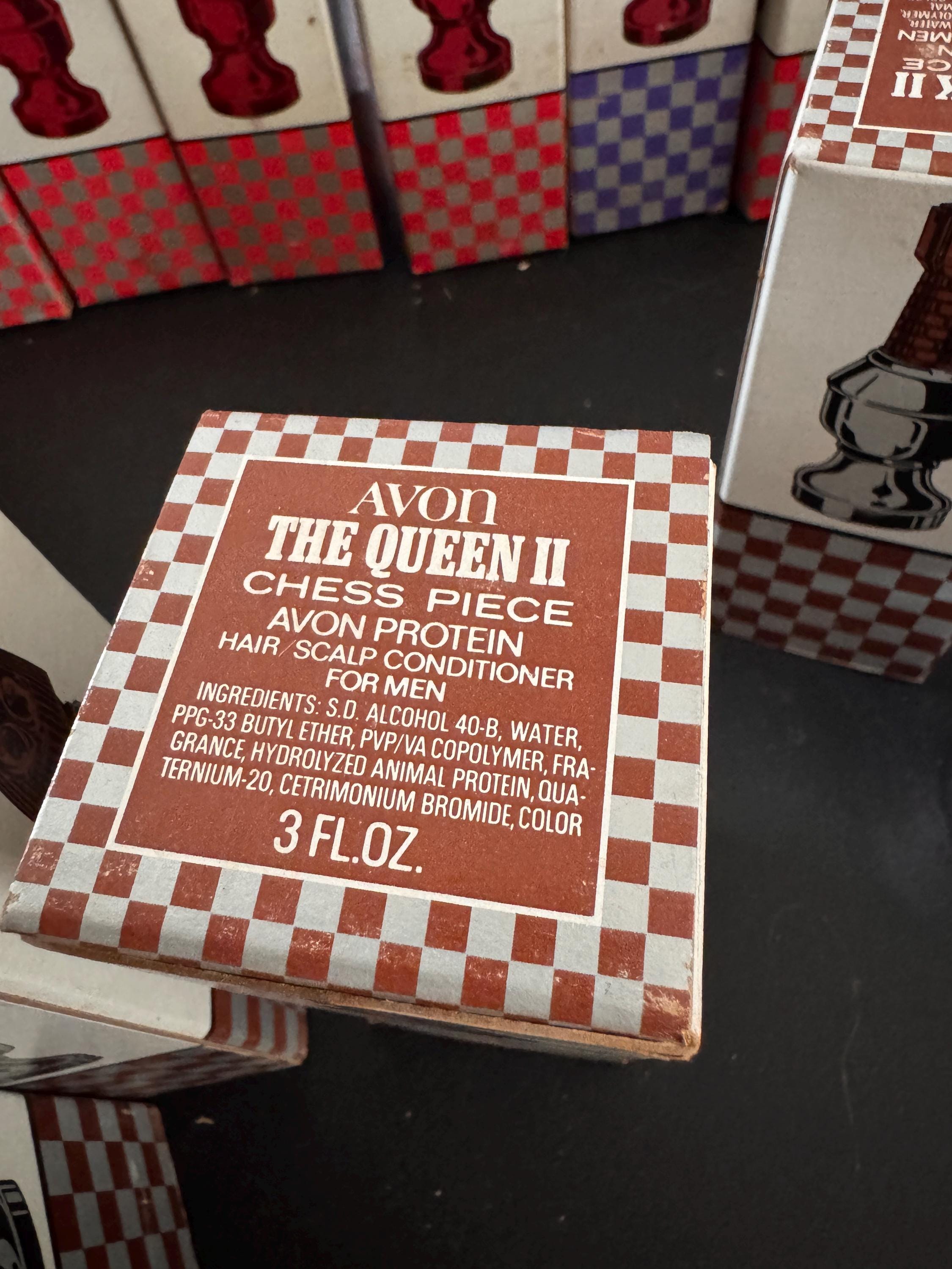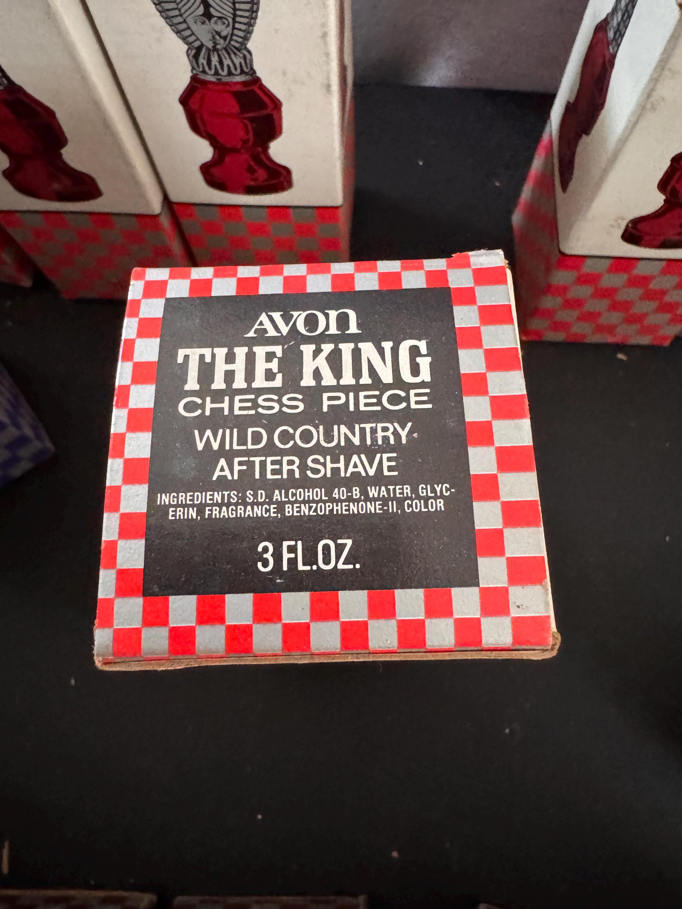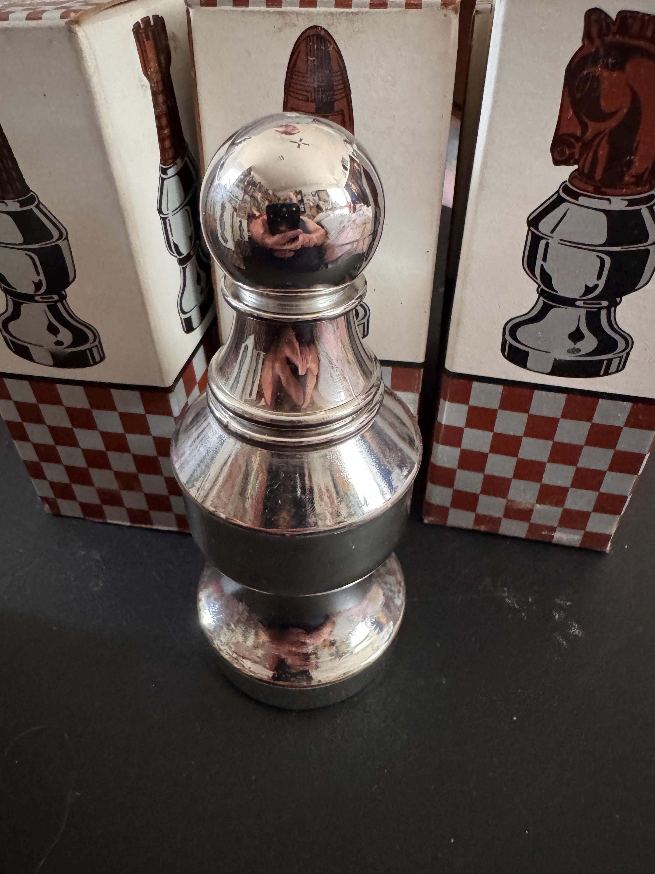 1970s Vintage Avon Chess Piece bottles containers of aftershave, aftershave lotion. Complete collection of 32 pieces all in each original box. Few boxes have slight damage, one missing top but majority have very little wear and tear. Some still have the liquid inside, most are empty. Collectible decanters each in the shape of chess pieces, King, Queen, Rook, Bishop, Knight, and Pawns. Made from plastic and glass, with a glossy finish and a silver color. Boxes are original. Original from the 20th Century, made during the 1970s. Each stand from 3” to little over 5” in heights. Bases are approximately 1.75”.