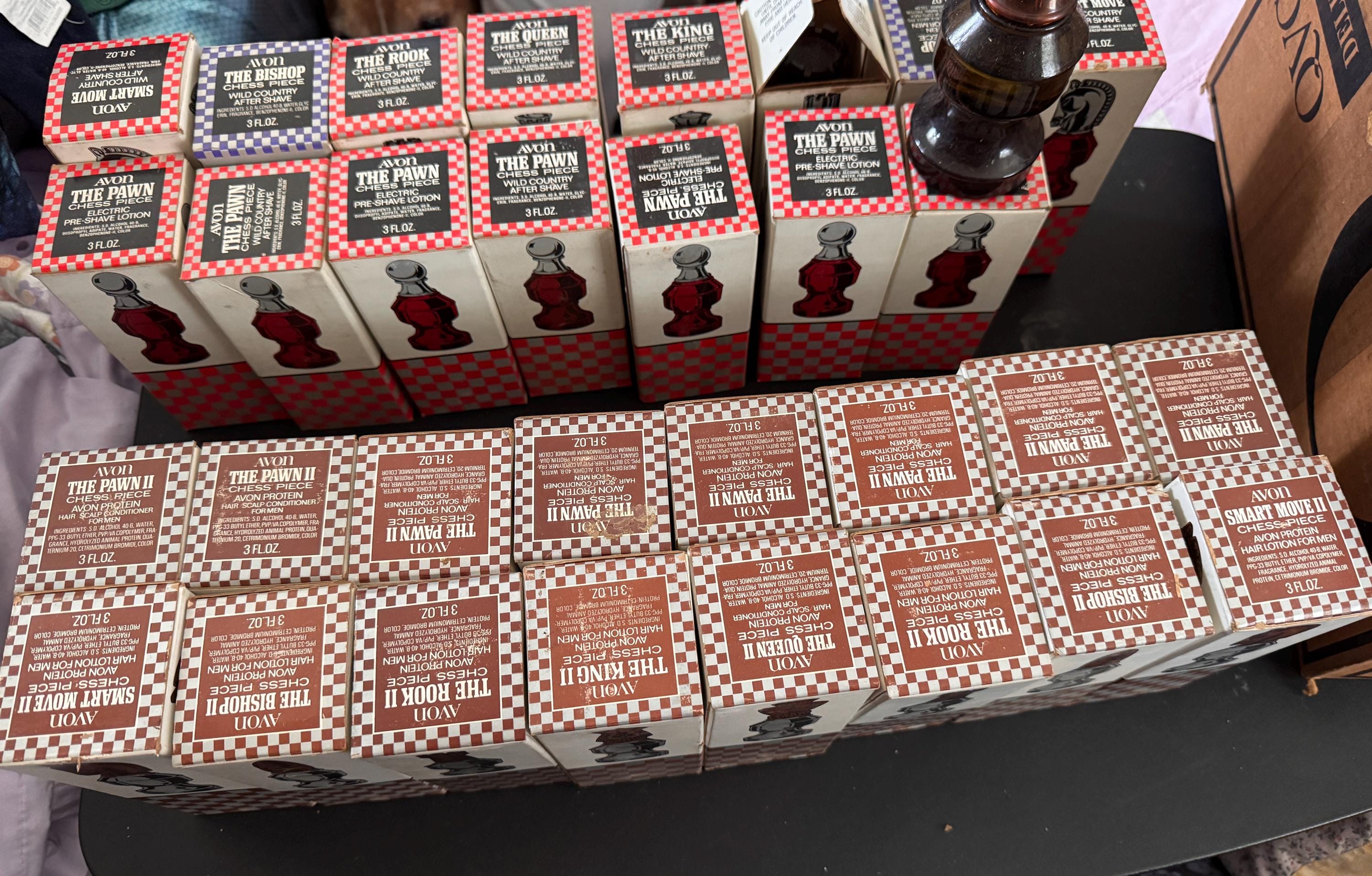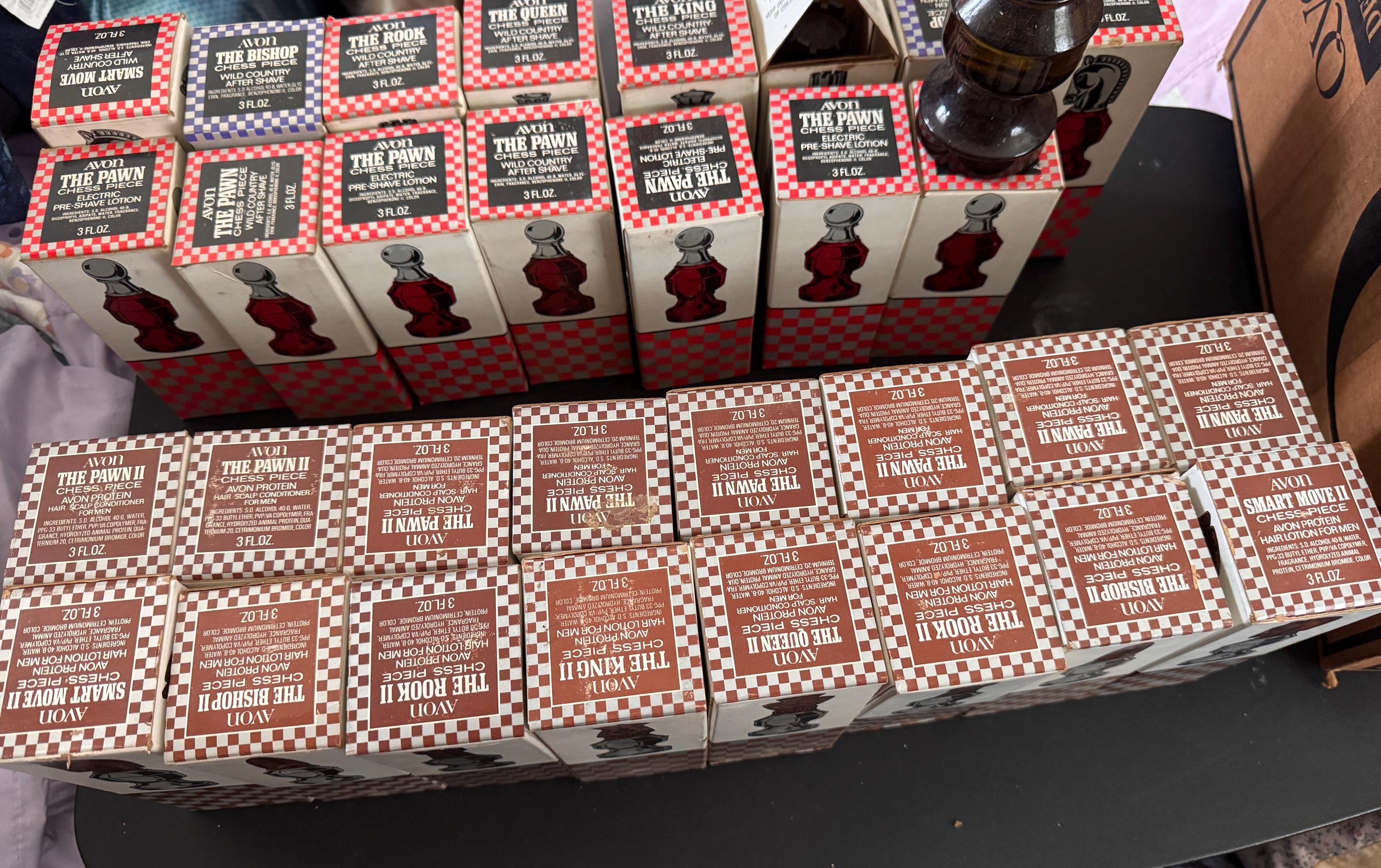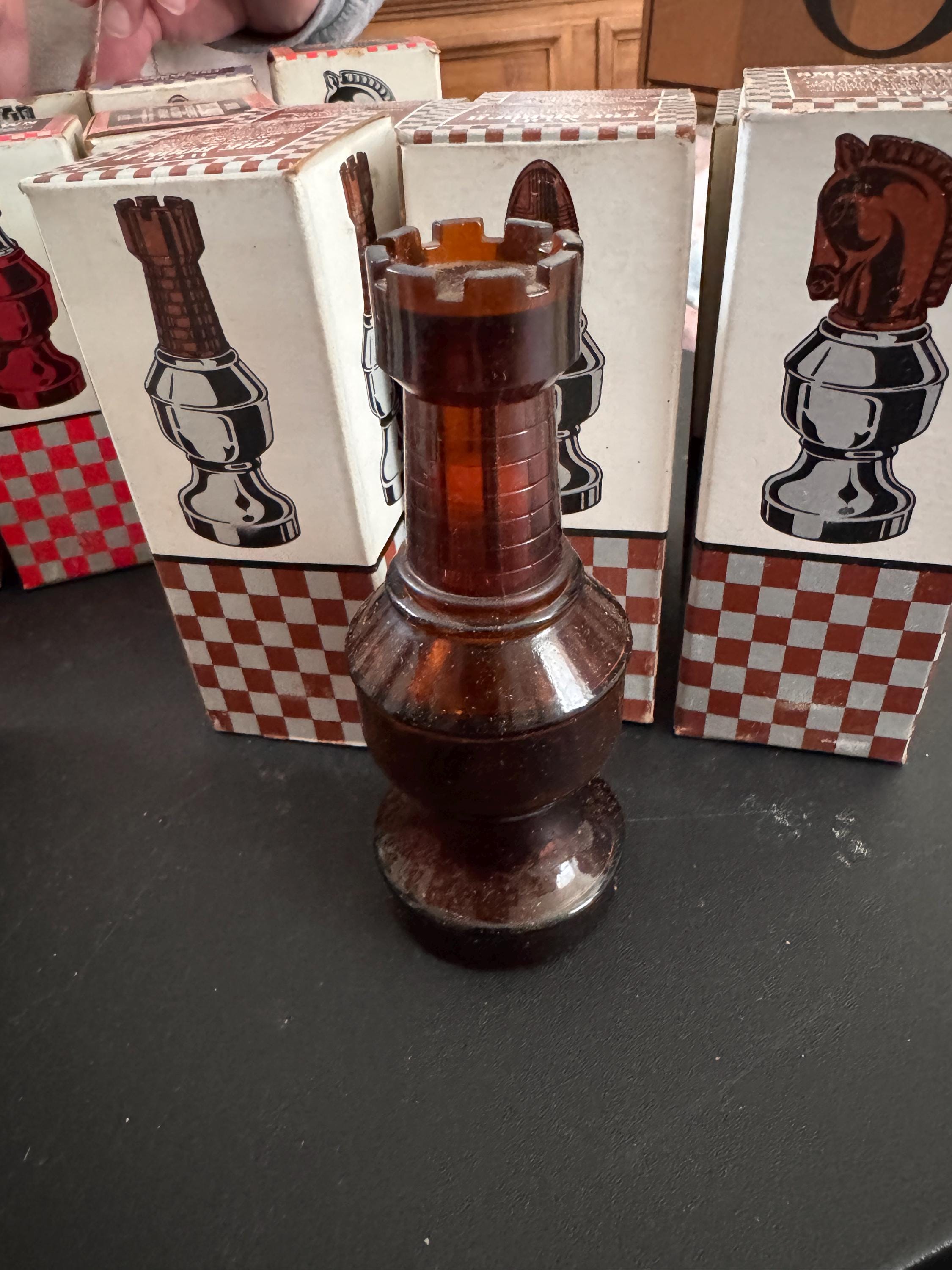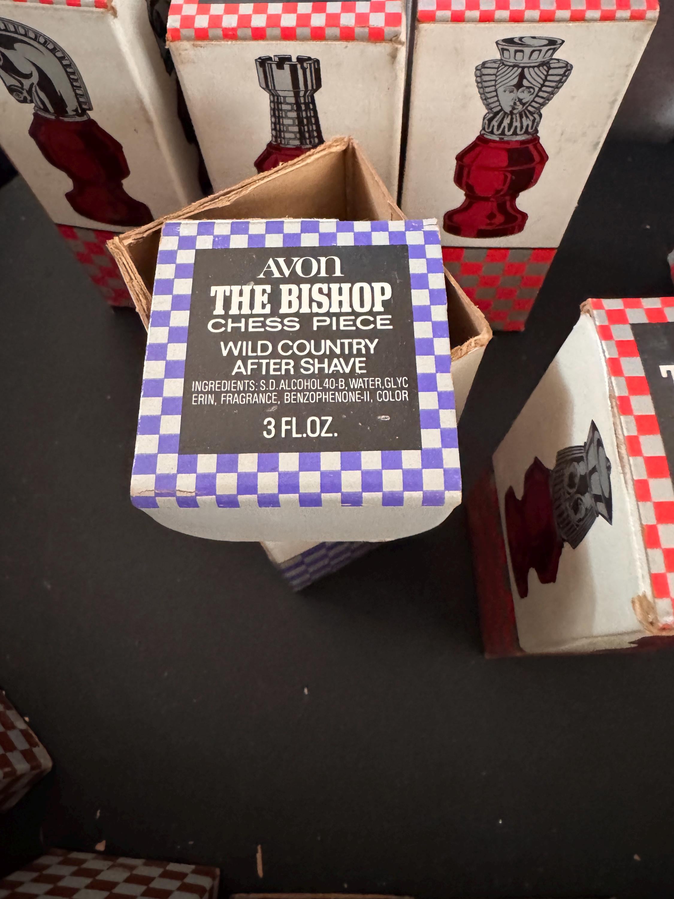1970s Vintage Avon Chess Piece bottles containers of aftershave, aftershave lotion. Complete collection of 32 pieces all in each original box. Few boxes have slight damage, one missing top but majority have very little wear and tear. Some still have the liquid inside, most are empty. Collectible decanters each in the shape of chess pieces, King, Queen, Rook, Bishop, Knight, and Pawns. Made from plastic and glass, with a glossy finish and a silver color. Boxes are original. Original from the 20th Century, made during the 1970s. Each stand from 3” to little over 5” in heights. Bases are approximately 1.75”.